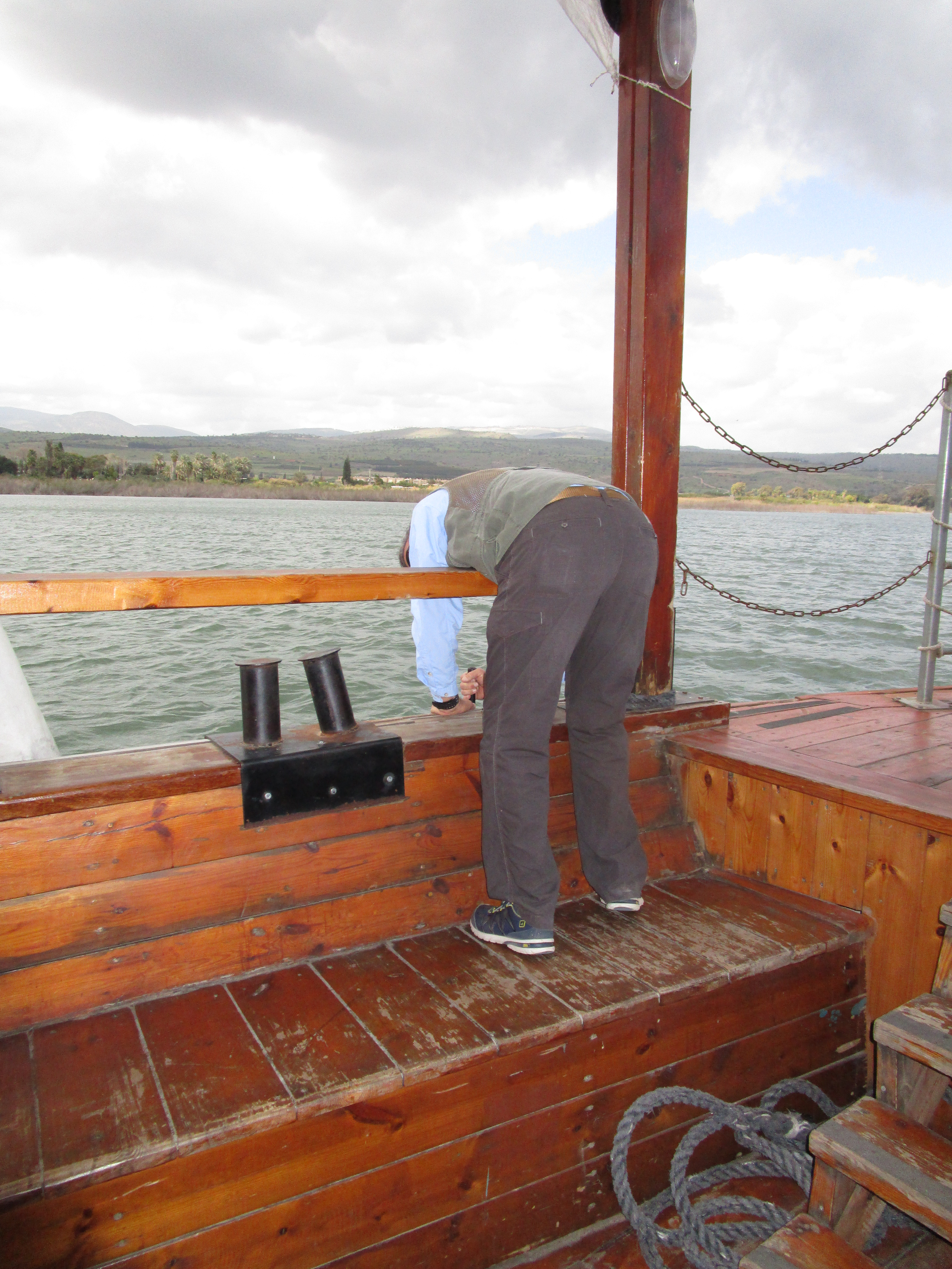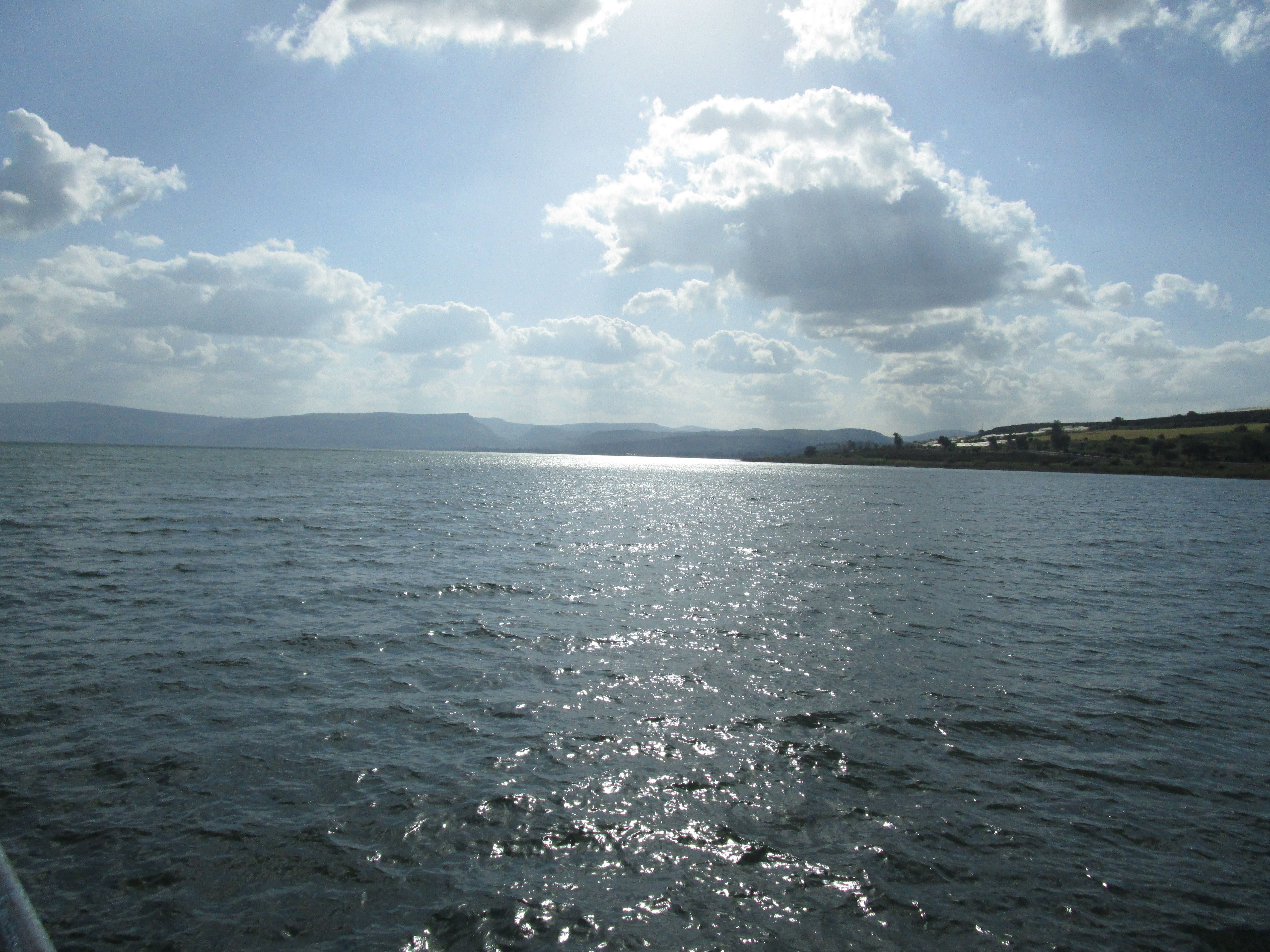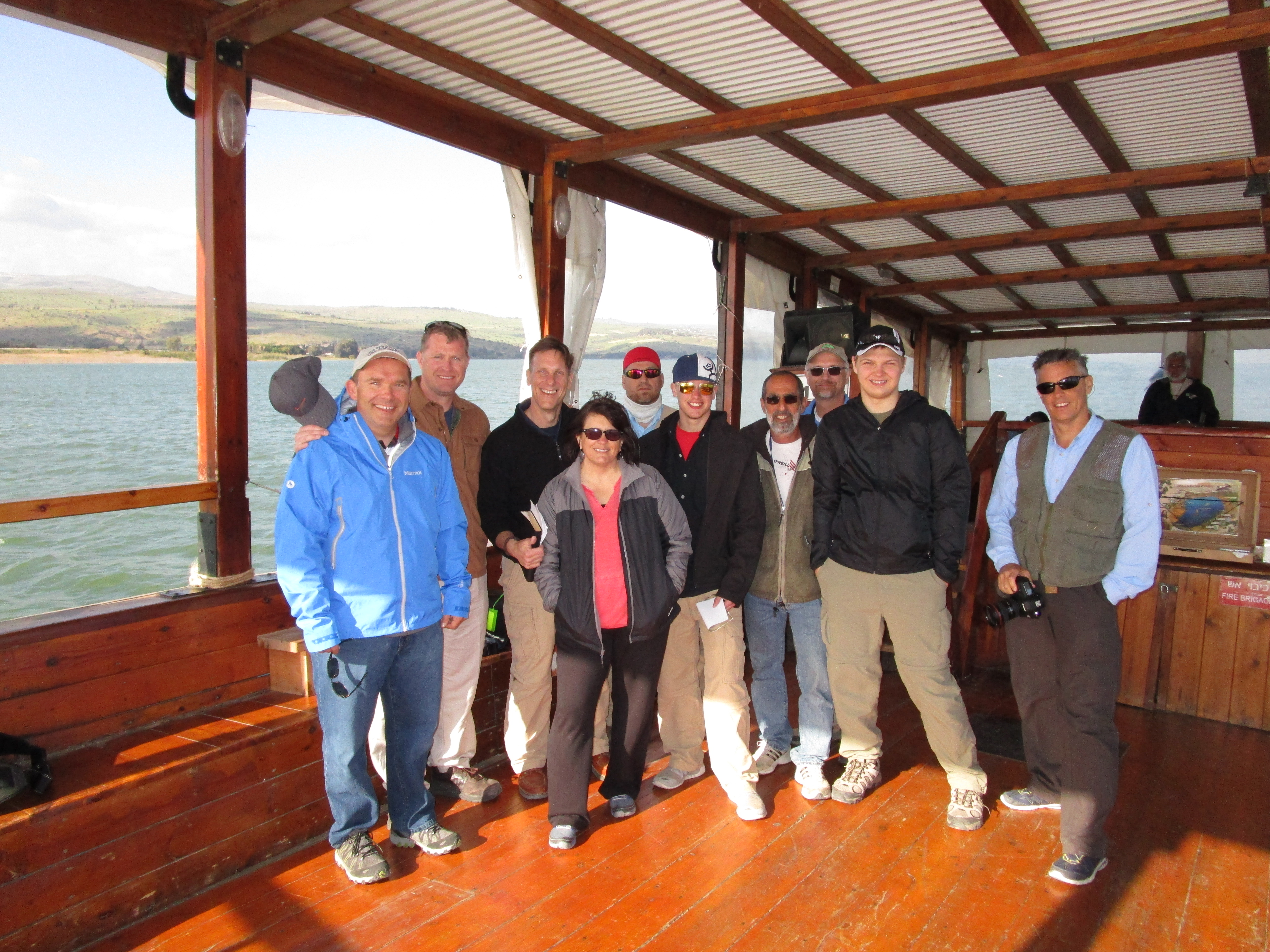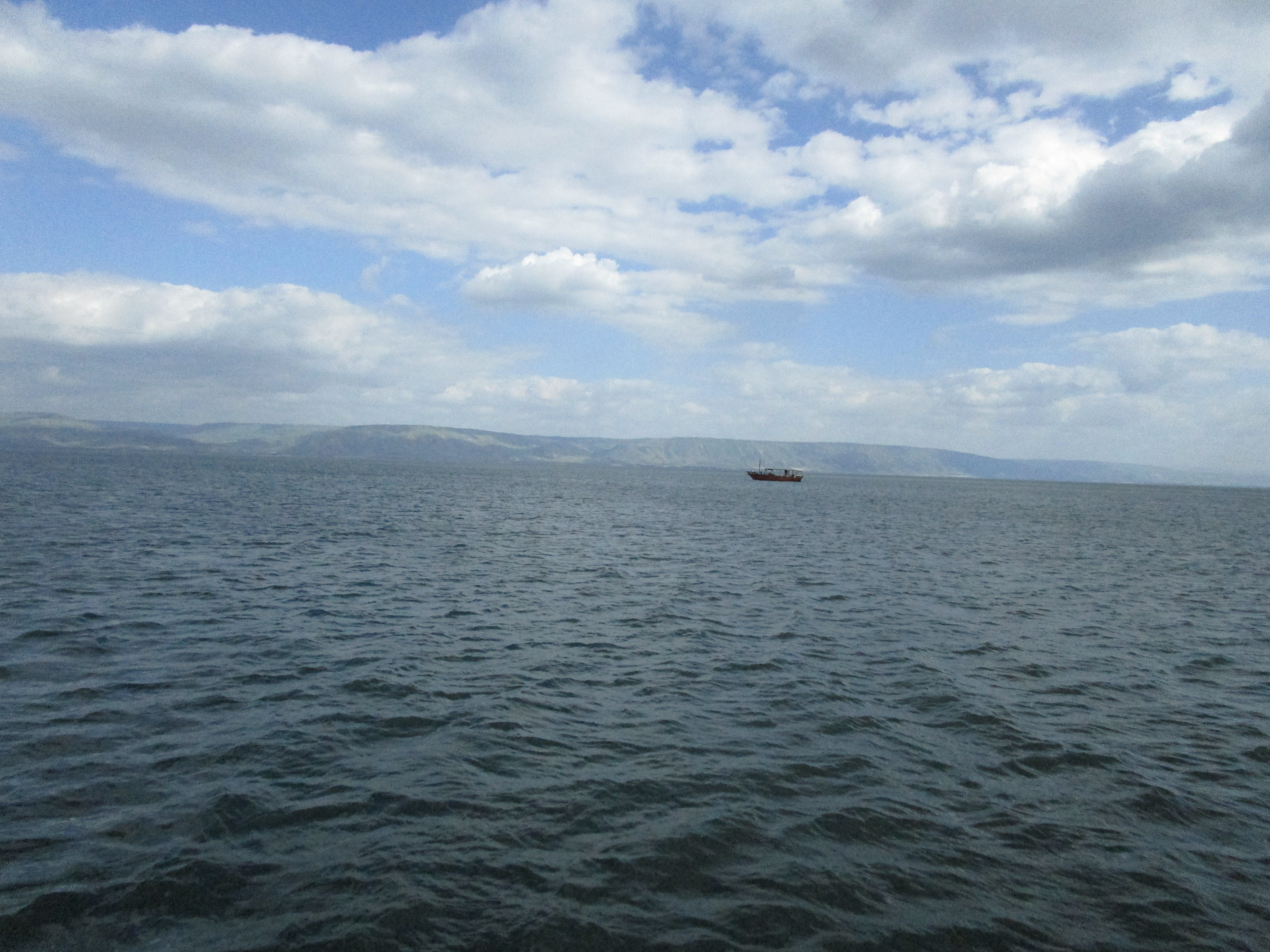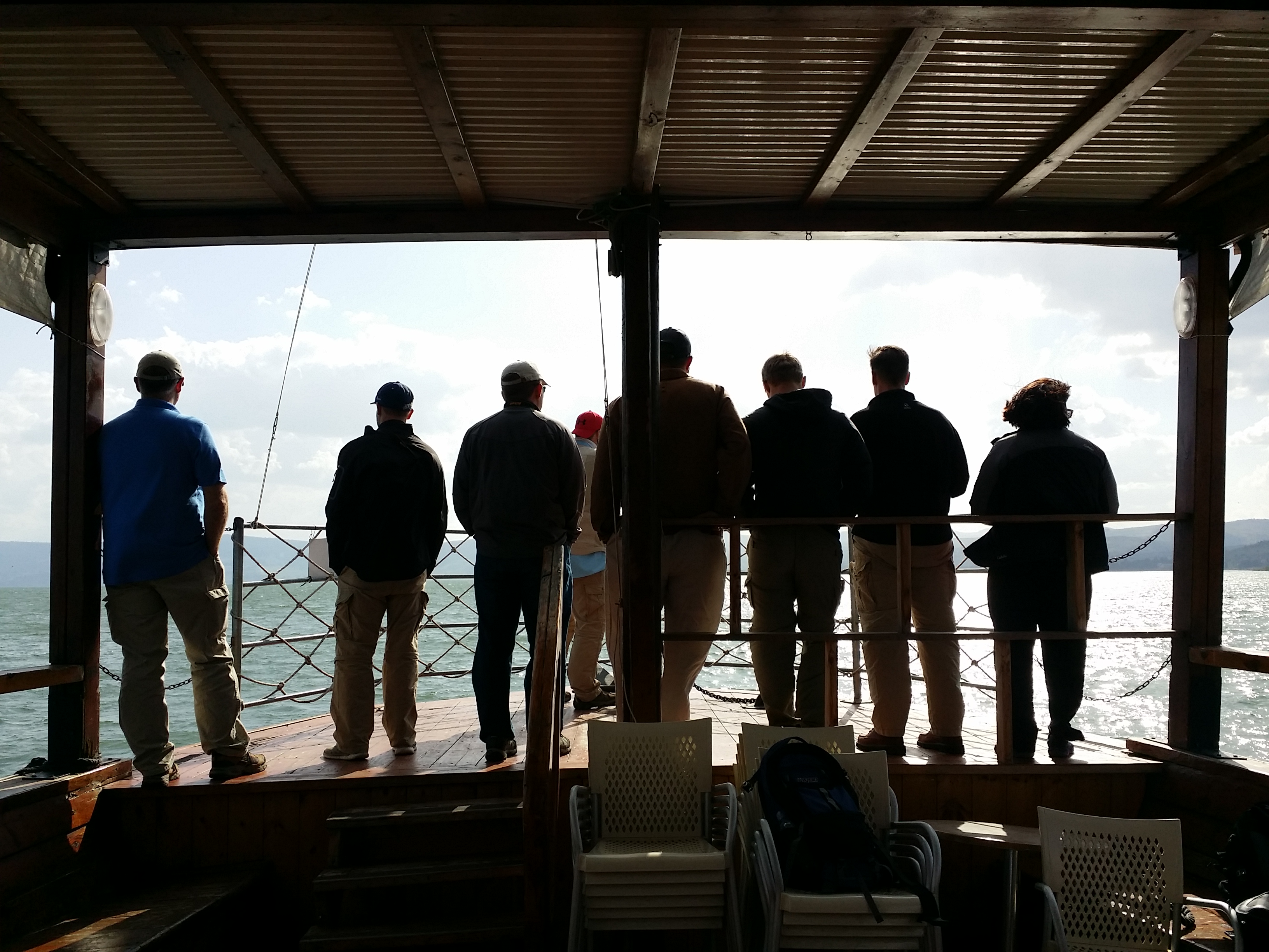 We took a boat out on the Sea of Galilee today. (I know, pinch me!) Because I am not a strong swimmer, I must confess that I’m not altogether comfortable on water. I was a little nervous about it ahead of time, not knowing what kind of boat we would be in or what the weather would be like. I’m determined not to be a “girl” about any of our group plans (but the jury’s still out on Hezekiah’s Tunnel…) even though I am the only girl. I also must confess that I even took a Dramamine.