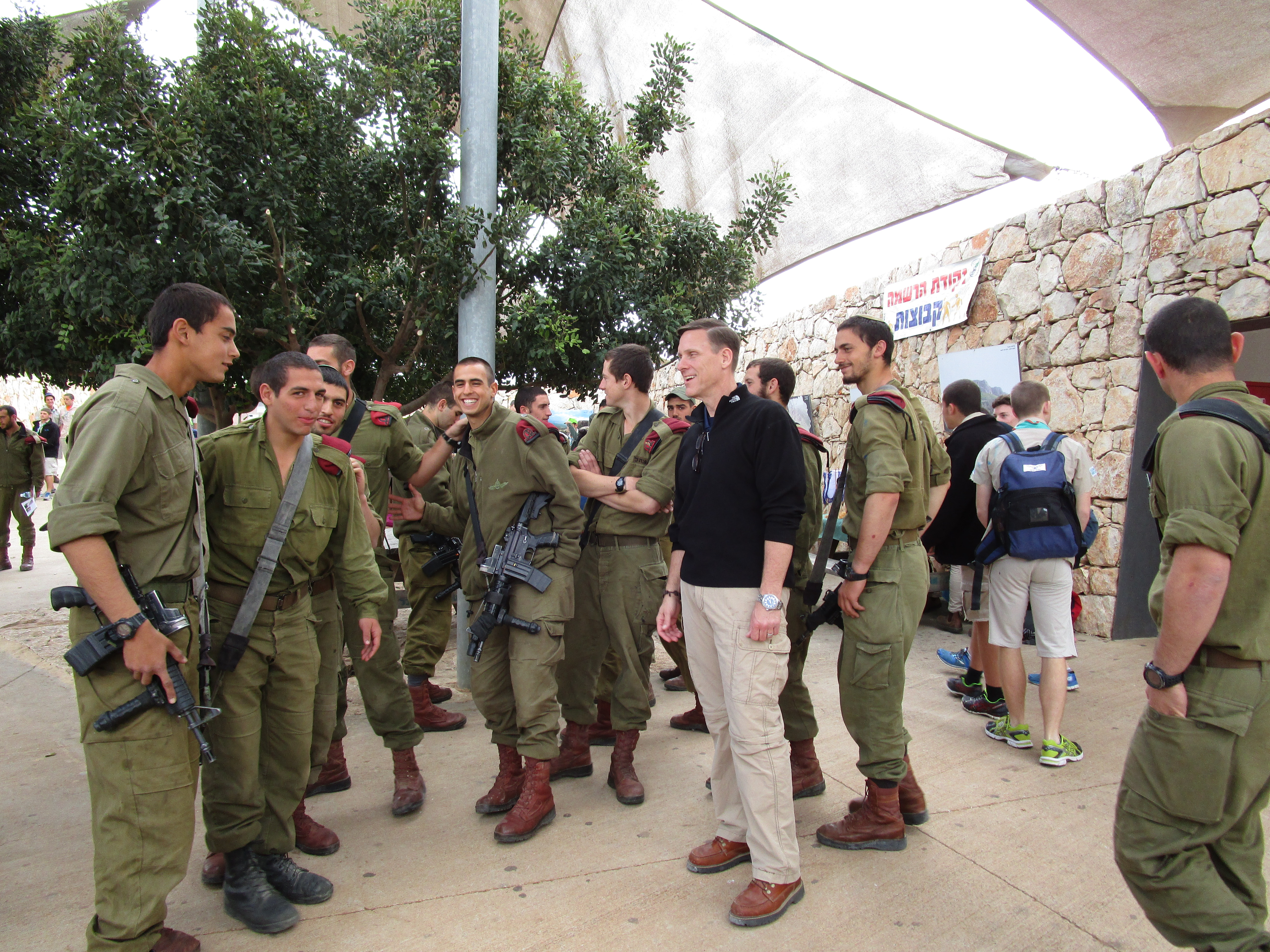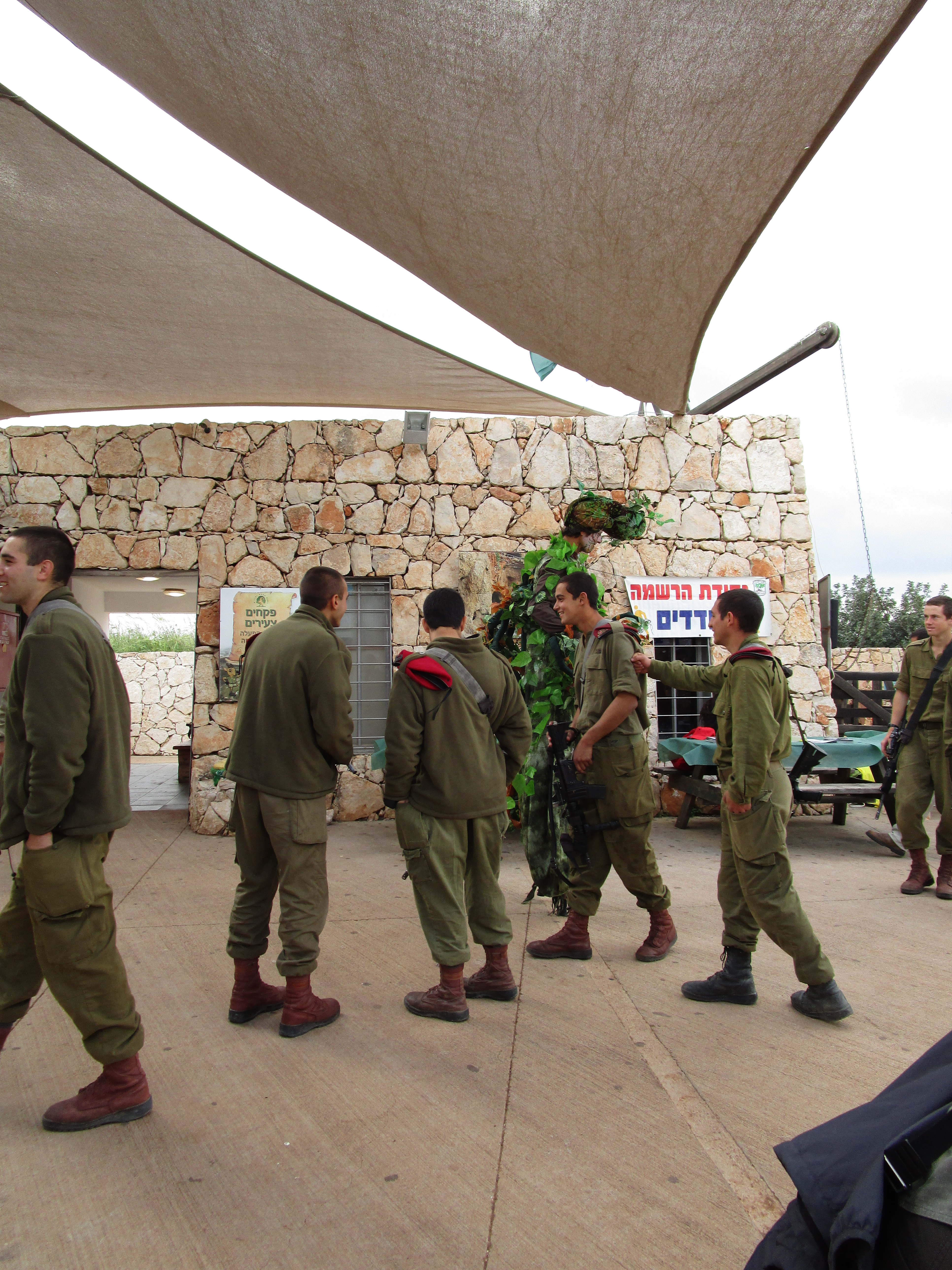 We headed down the mountain, and as we arrived back at the entrance, the place was running over with Israeli soldiers carrying machine guns. They didn’t look much older than Philip and Micah. I would have expected most of them to be dark-skinned, but most of them were fair-skinned. They were smiling and agreeable – John even managed to get a picture with a few of them – but STILL, a big group of teenage boys carrying machine guns is not something you see every day! And hearing Elton John’s “Your Song” piped over the loudspeaker at Mt. Arbel during an Israeli Army march is not something you hear every day, either!