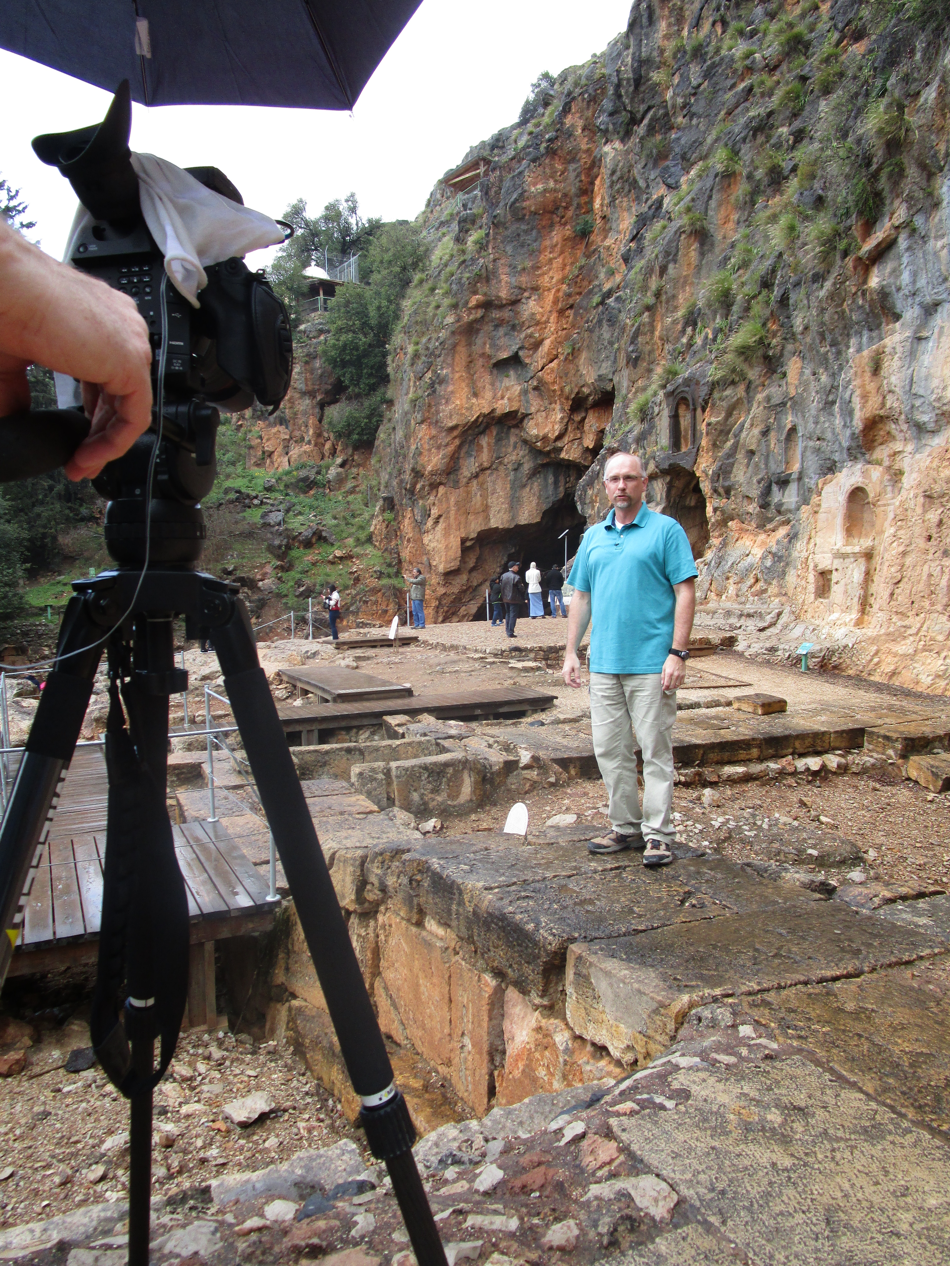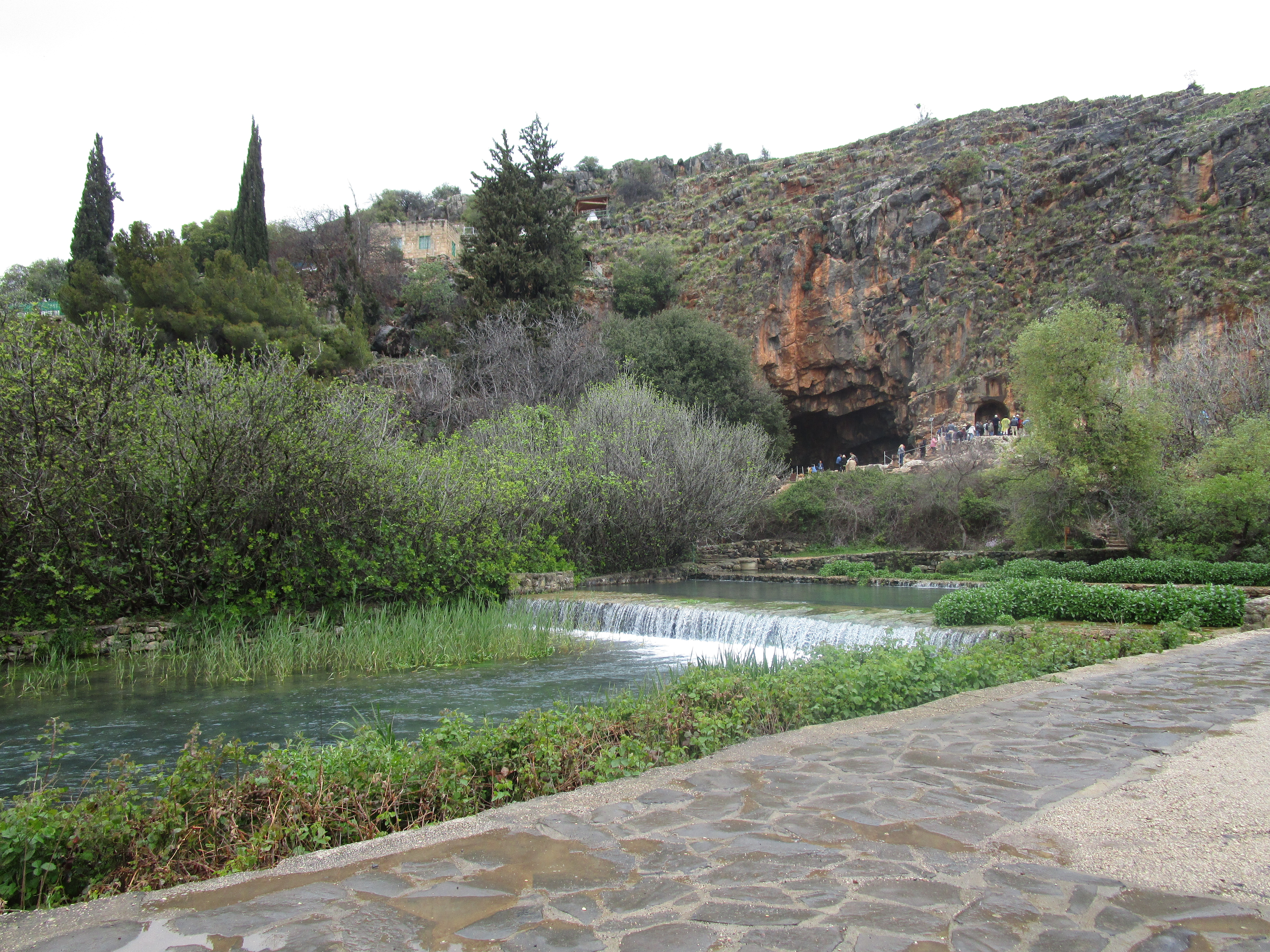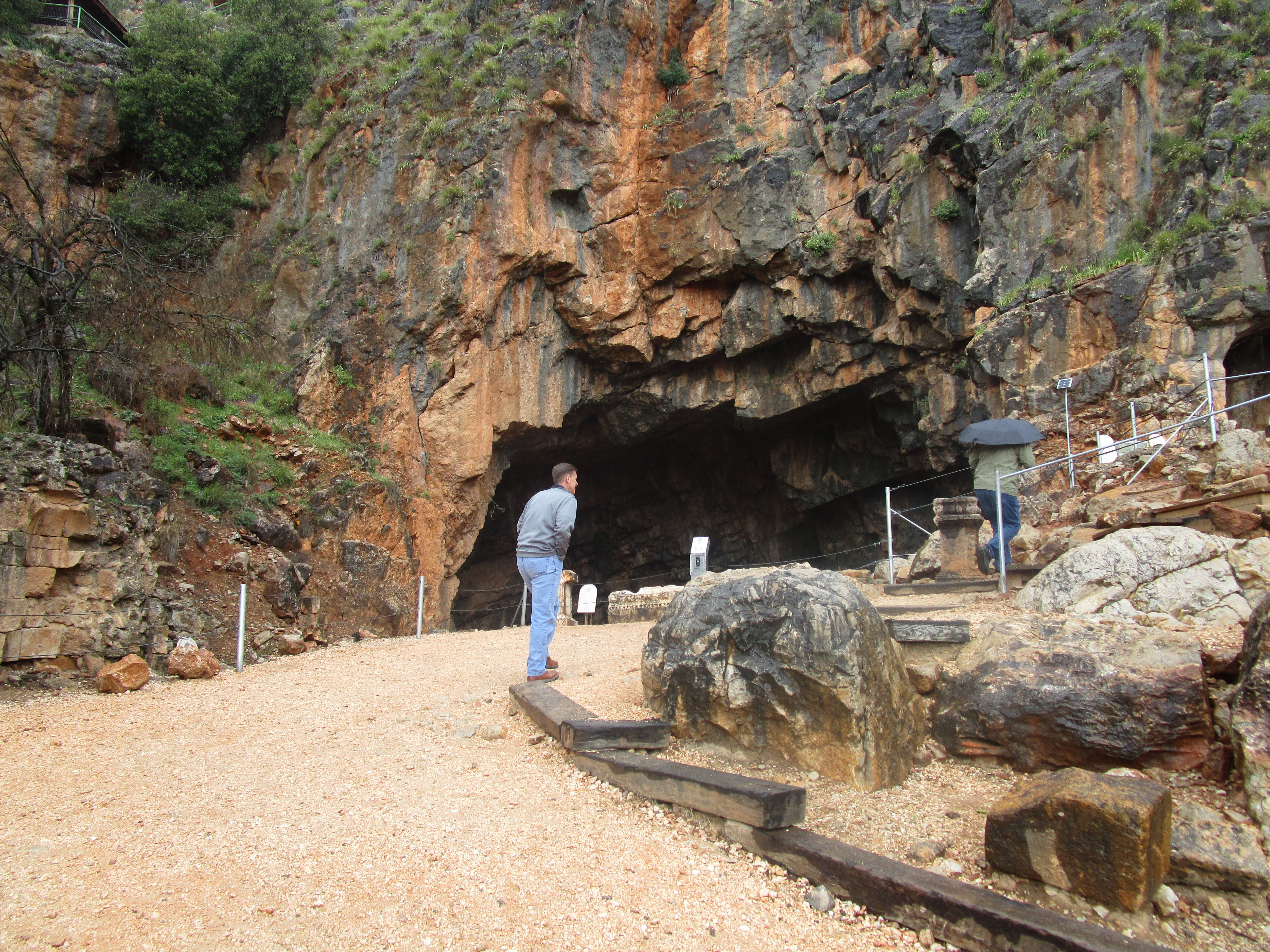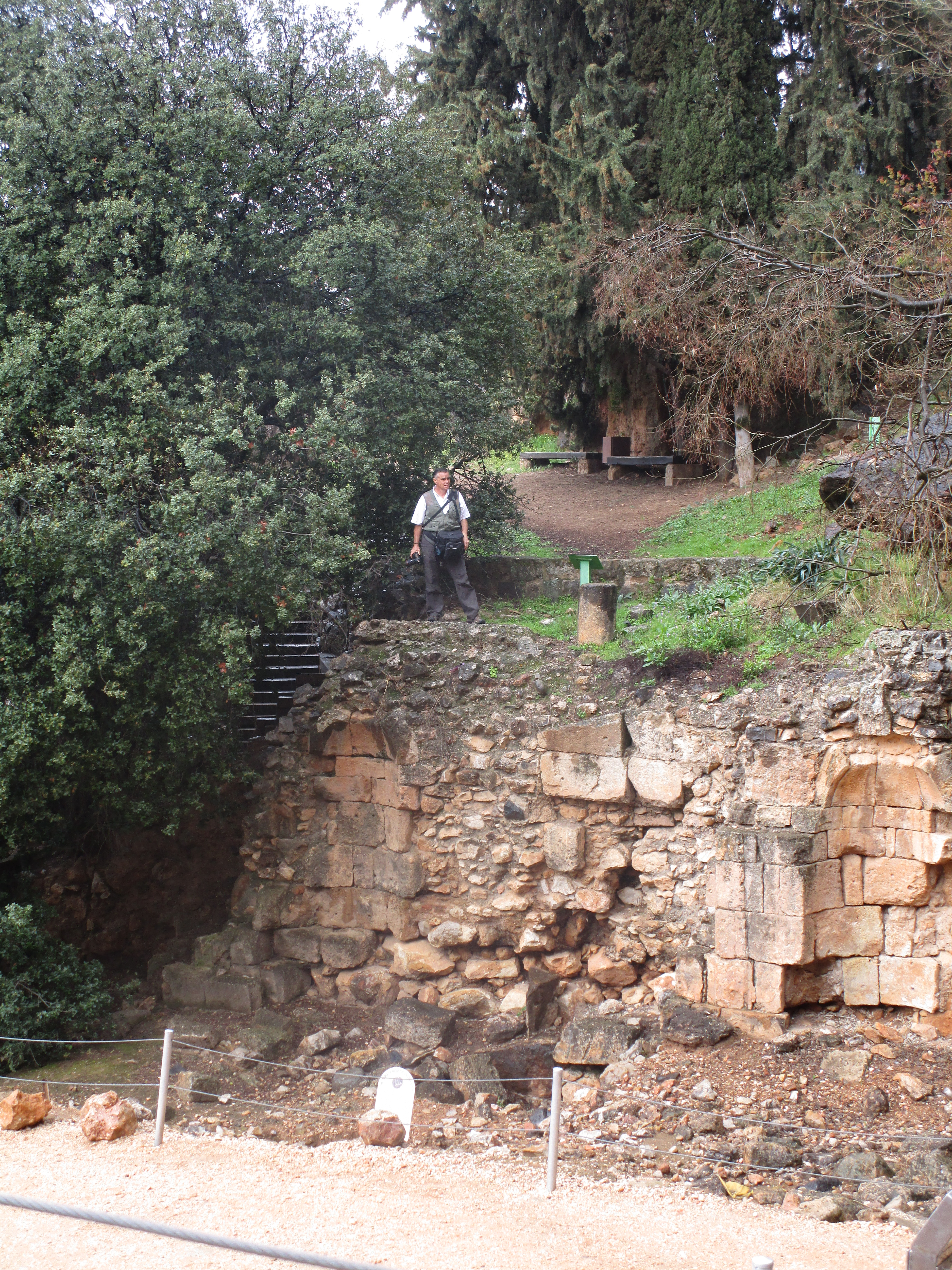Today was a cold, and rainy day, and in some ways it was dreary as well. Dreary because of the evidence of idolatry we saw in three different places: Bethsaida, Caesarea Philippi, and Dan. Of the three, I unexpectedly found Caesarea Philippi the most disturbing. You have probably seen pictures of the grotto / cave from which a spring emerges and feeds the Jordan River. As we walked toward it, water from the spring rushed past us over a series of what appeared to be man-made dams. We climbed up several sets of wooden stairs and bridges over the water, and at the top, found the cave. It is an imposing sight: its dark orange and black and grey sharp-edged rocks protruding from the face of the mountain gives it the appearance of a gaping mouth. Some have said that this cave was known then as the “gates of Hades” (and that Jesus was referencing it in the Matthew 16 passage) because it was believed that Baal would enter and leave from places like this. Looking to the right of the cave, there are niches carved into the face of the mountain that were used to place idols and altars to worship the Greek gods Pan, Zeus, Asclepius, Athena and others. Further to the right were rectangular niches carved into rock on the ground where the bones of ritually sacrificed goats were buried.