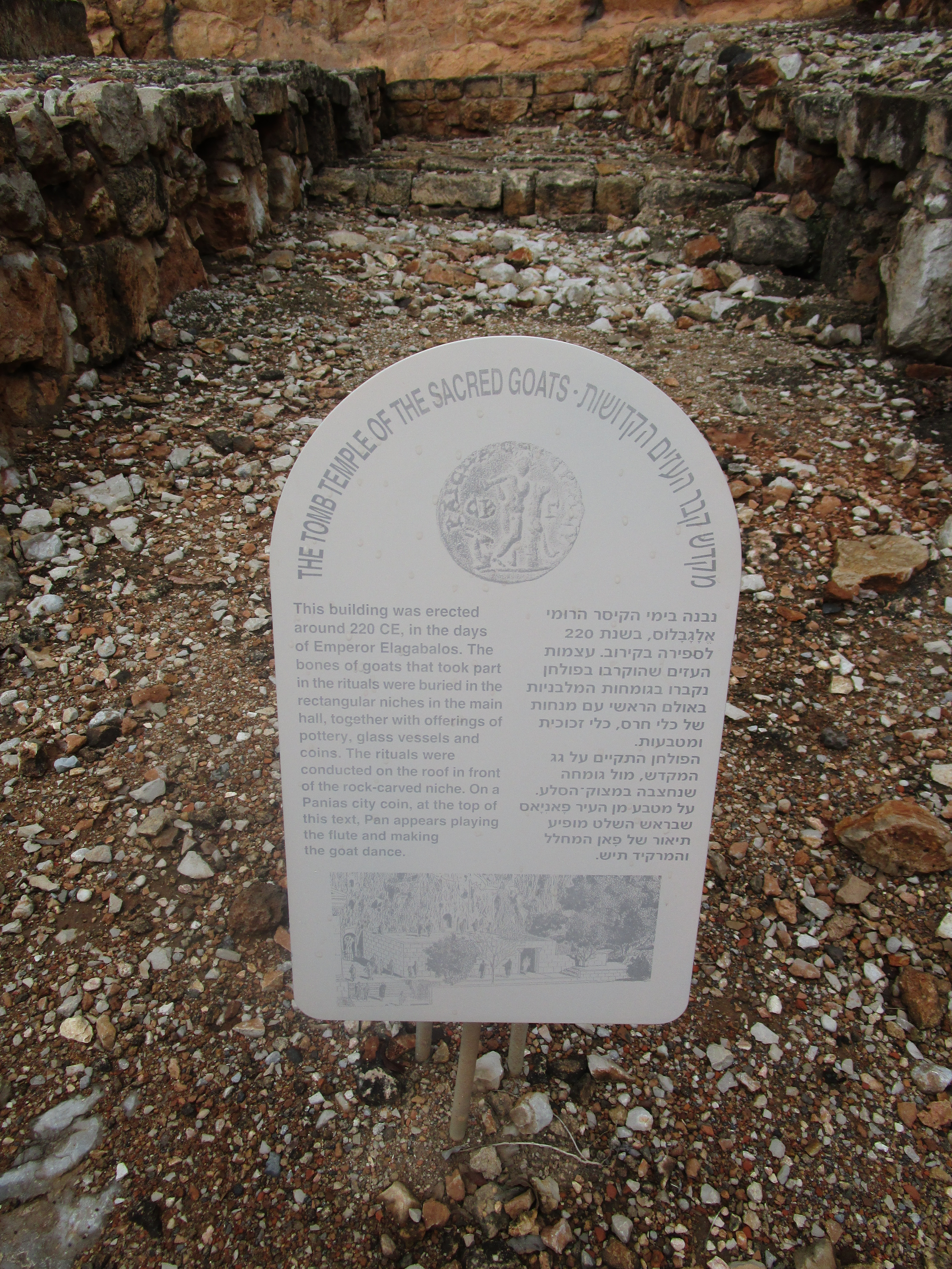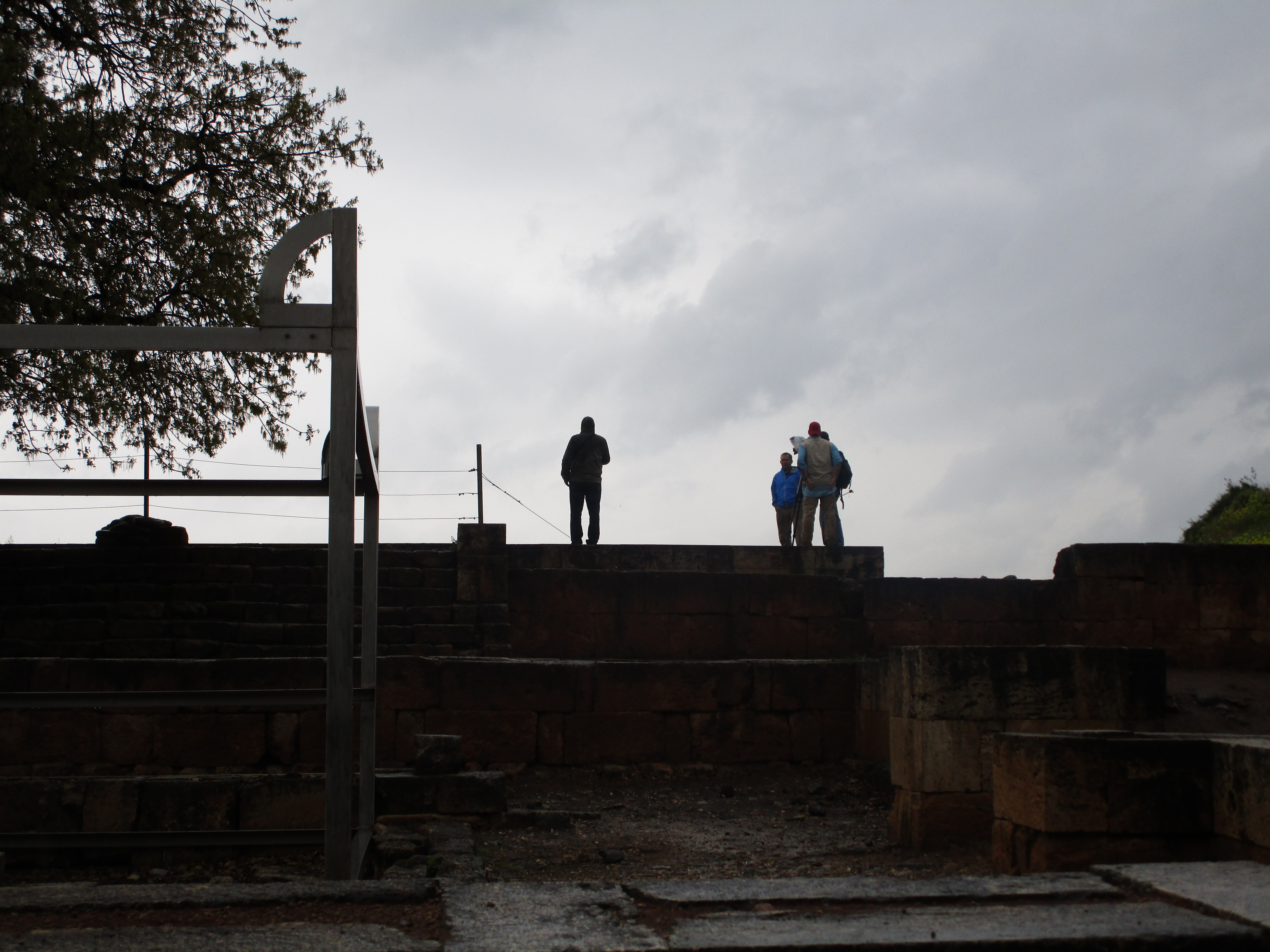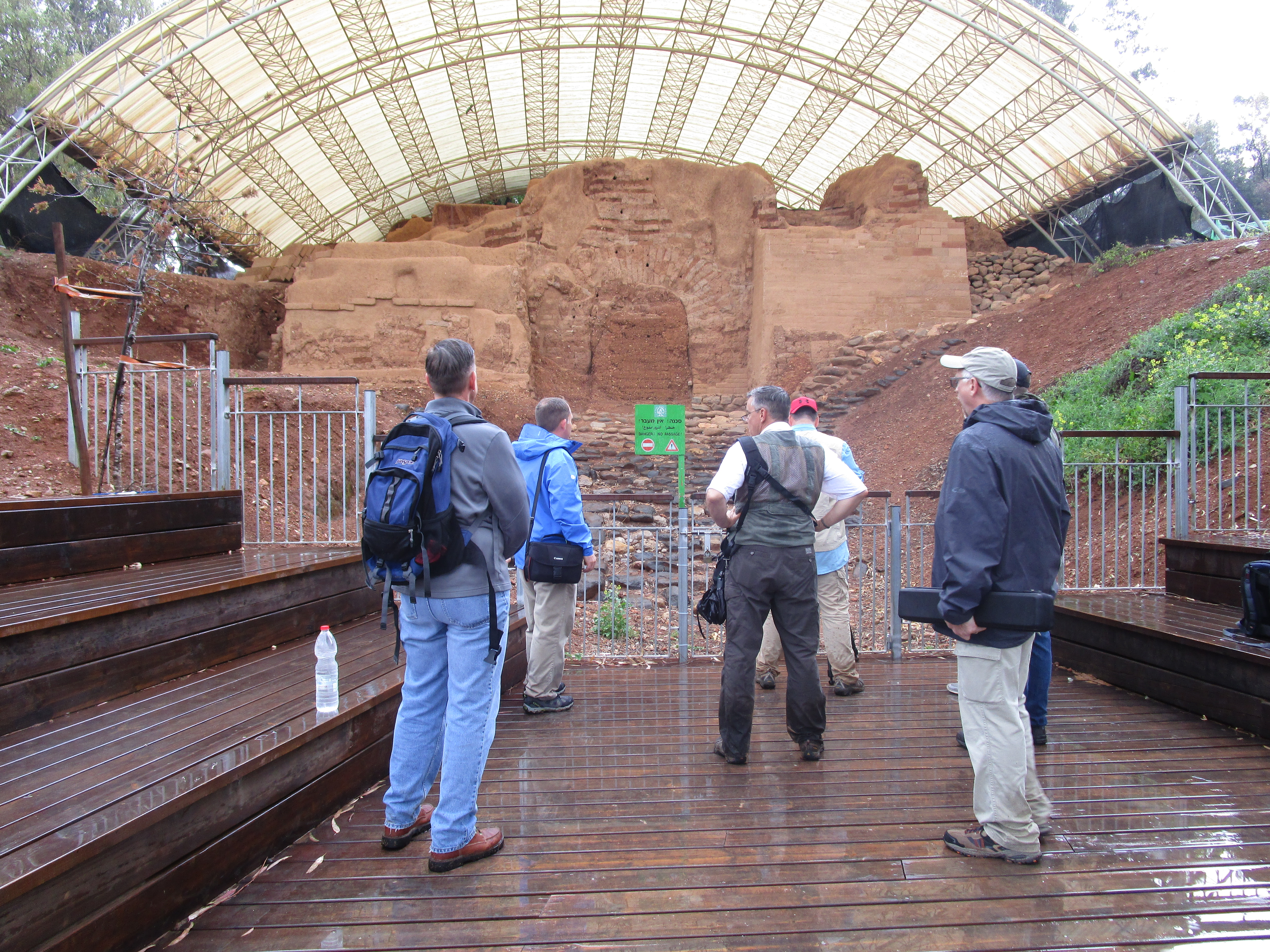 Today was a cold, and rainy day, and in some ways it was dreary as well. Dreary because of the evidence of idolatry we saw in three different places: Bethsaida, Caesarea Philippi, and Dan. Of the three, I unexpectedly found Caesarea Philippi the most disturbing. You have probably seen pictures of the grotto / cave from which a spring emerges and feeds the Jordan River. As we walked toward it, water from the spring rushed past us over a series of what appeared to be man-made dams. We climbed up several sets of wooden stairs and bridges over the water, and at the top, found the cave. It is an imposing sight: its dark orange and black and grey sharp-edged rocks protruding from the face of the mountain gives it the appearance of a gaping mouth. Some have said that this cave was known then as the “gates of Hades” (and that Jesus was referencing it in the Matthew 16 passage) because it was believed that Baal would enter and leave from places like this. Looking to the right of the cave, there are niches carved into the face of the mountain that were used to place idols and altars to worship the Greek gods Pan, Zeus, Asclepius, Athena and others. Further to the right were rectangular niches carved into rock on the ground where the bones of ritually sacrificed goats were buried.