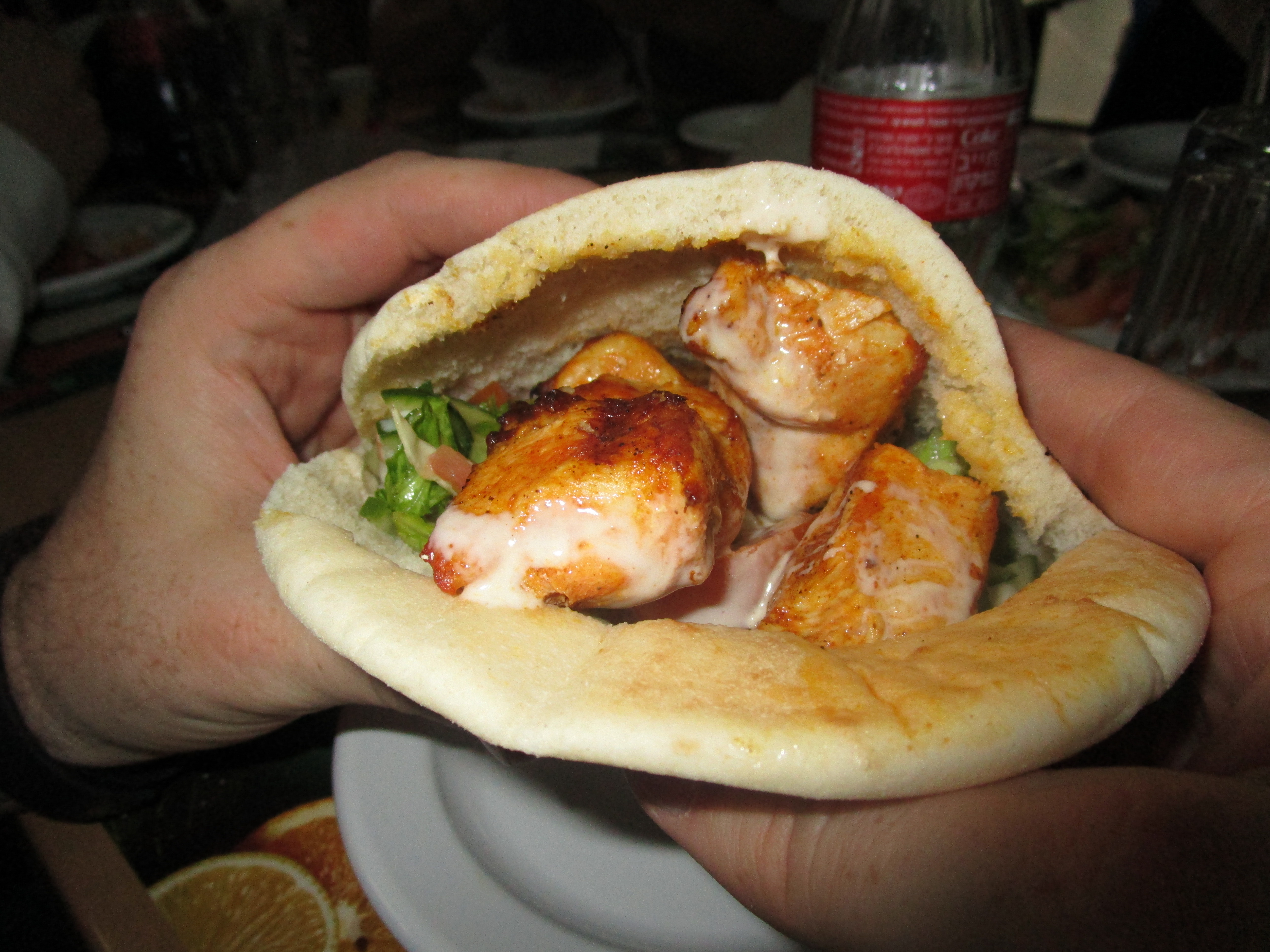 We had a quick lunch choosing from Shawarma (see what it is here), Schnitzel, or Falafel. I tried some of Doug’s Falafel and it was delicious! Basically, it is deep fried hummus. It tasted a lot like a hush puppy. Usually they are served inside pita bread. I’m getting attached to pita bread… When they brought me my schnitzel, I dumped it out to take out the tomatoes (sorry, Mom) and put the chicken back in. Mat said it looked like I was “force-feeding a Muppet!”