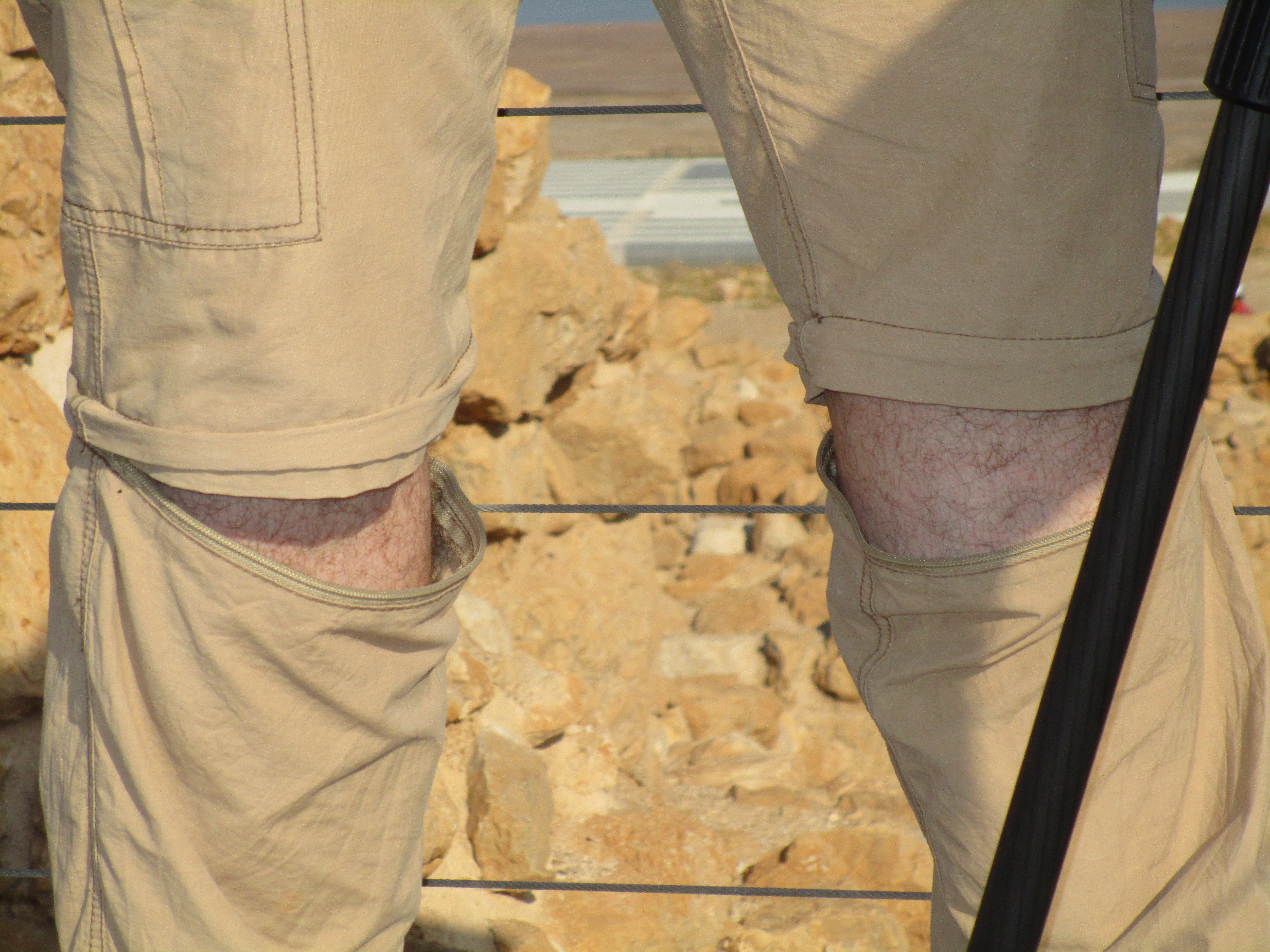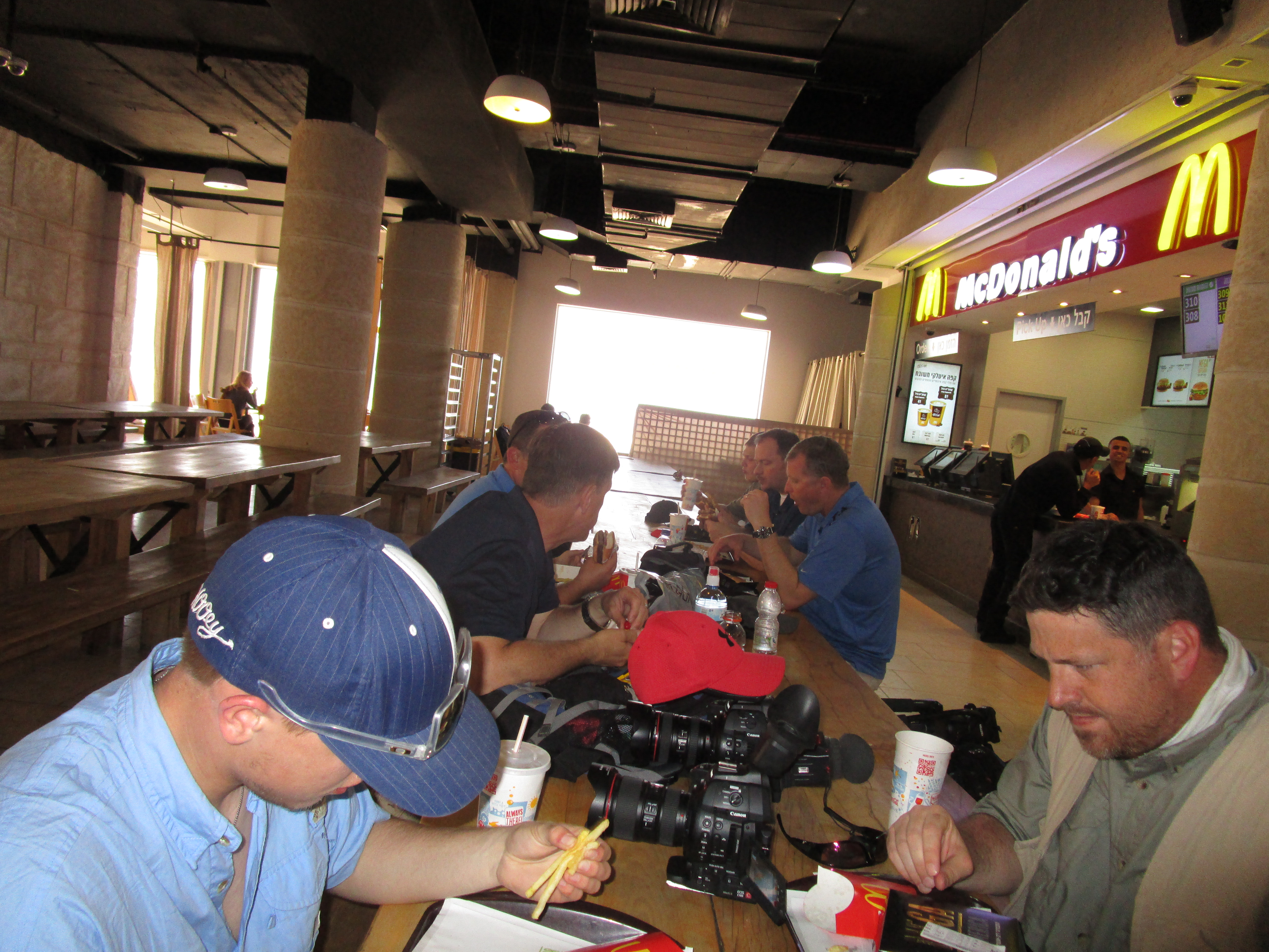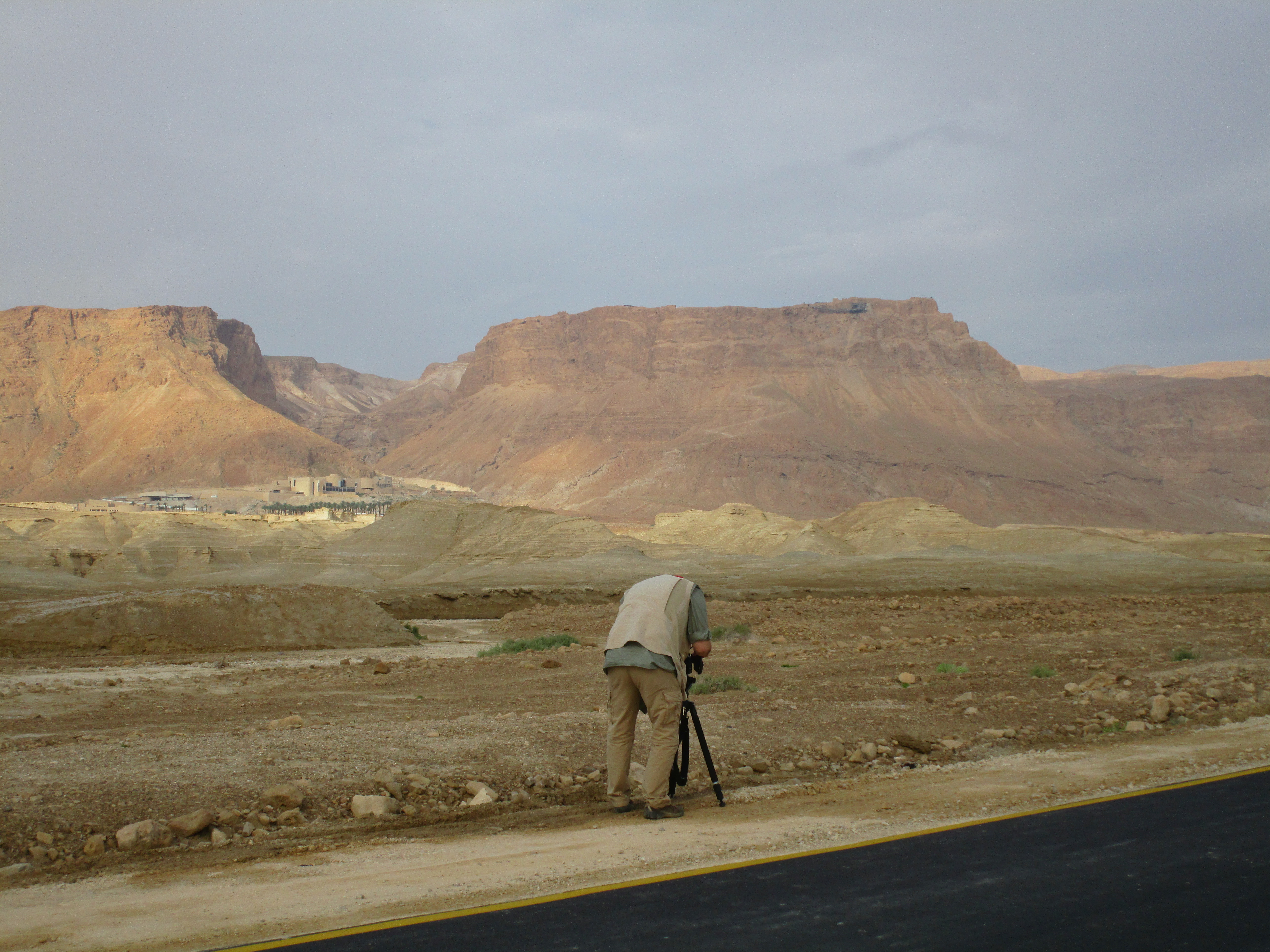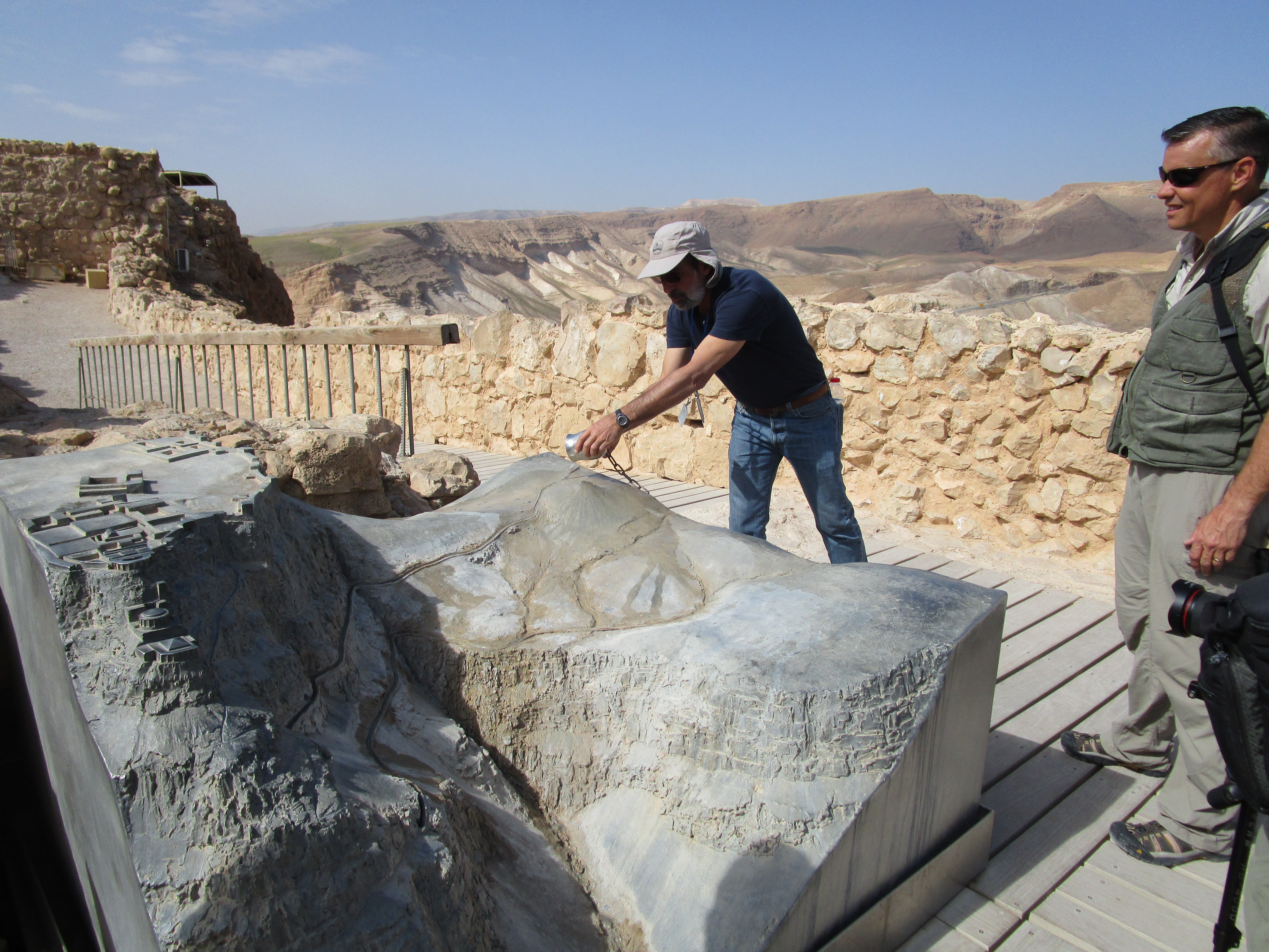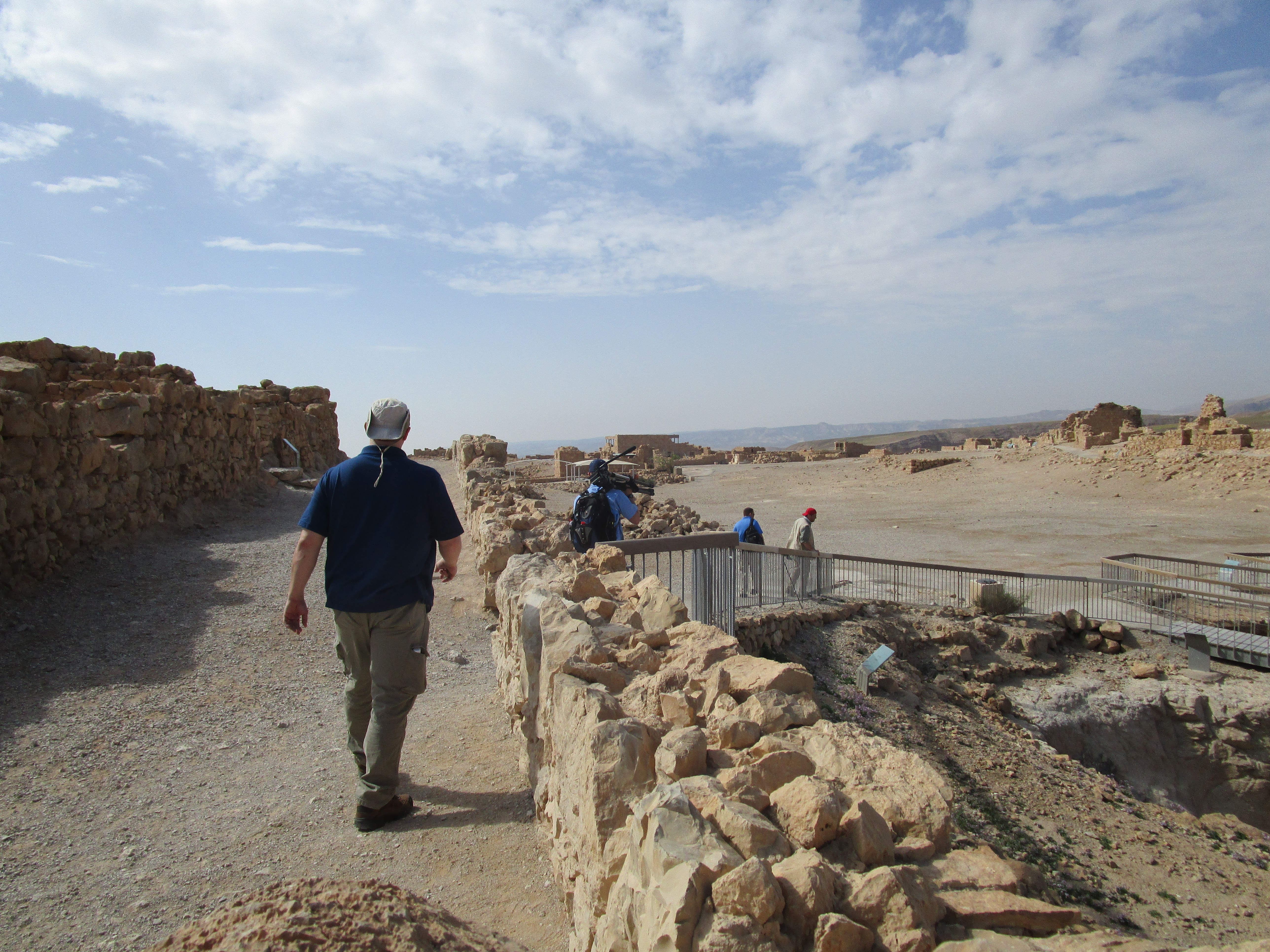 We spent the entire morning at Masada. John also had a bit to film here at the base, and the guys shot a lot of B-roll. It’s been interesting to see how Doug and Mat work their cameras. Mat has a heavy-duty tripod and heavy duty camera (Micah lugs around a lot of Mat’s equipment in a big backpack and carries the tripod when the camera is off.) He attaches a microphone on the speaker, and listens with earbuds in his ear. Whoever is speaking has to remember to just use a normal voice rather than shouting, since the audio will be going straight into the mic. Mat will pan the camera slowly up or down, or side to side depending on the subject he is trying to shoot. Doug is taking stills, and Philip is carrying his gear for him, including what they call a glidecam. It is a pole with weights attached to the bottom and the camera attached to the top. He carries it with a sleeve over his arm attached to a sort of bracket that helps him balance the heavy camera. The glidecam holds the camera steady as he follows the speaker, or takes moving video of the location. (That’s “moving” as in action – not “moving” as in emotional!)