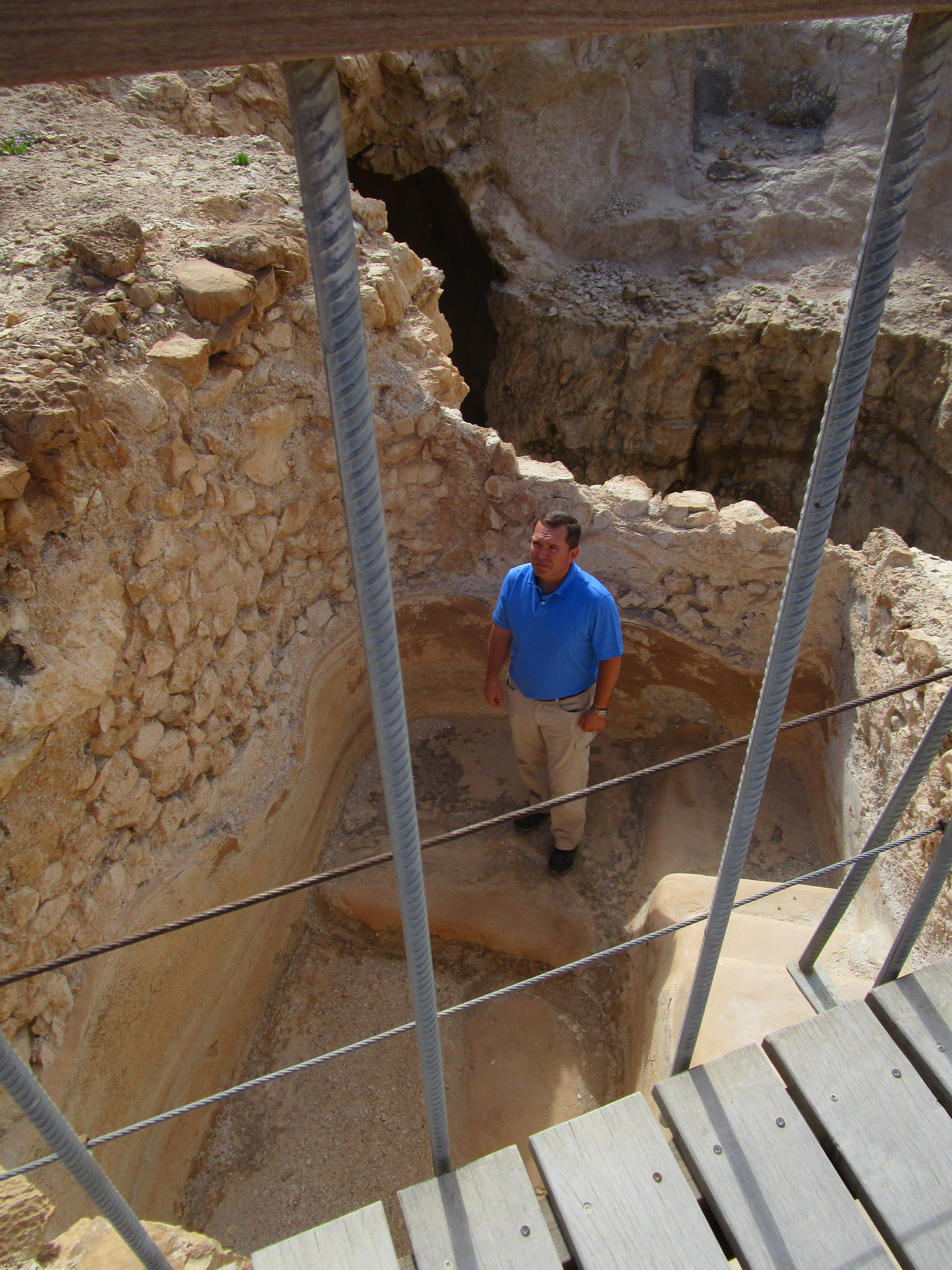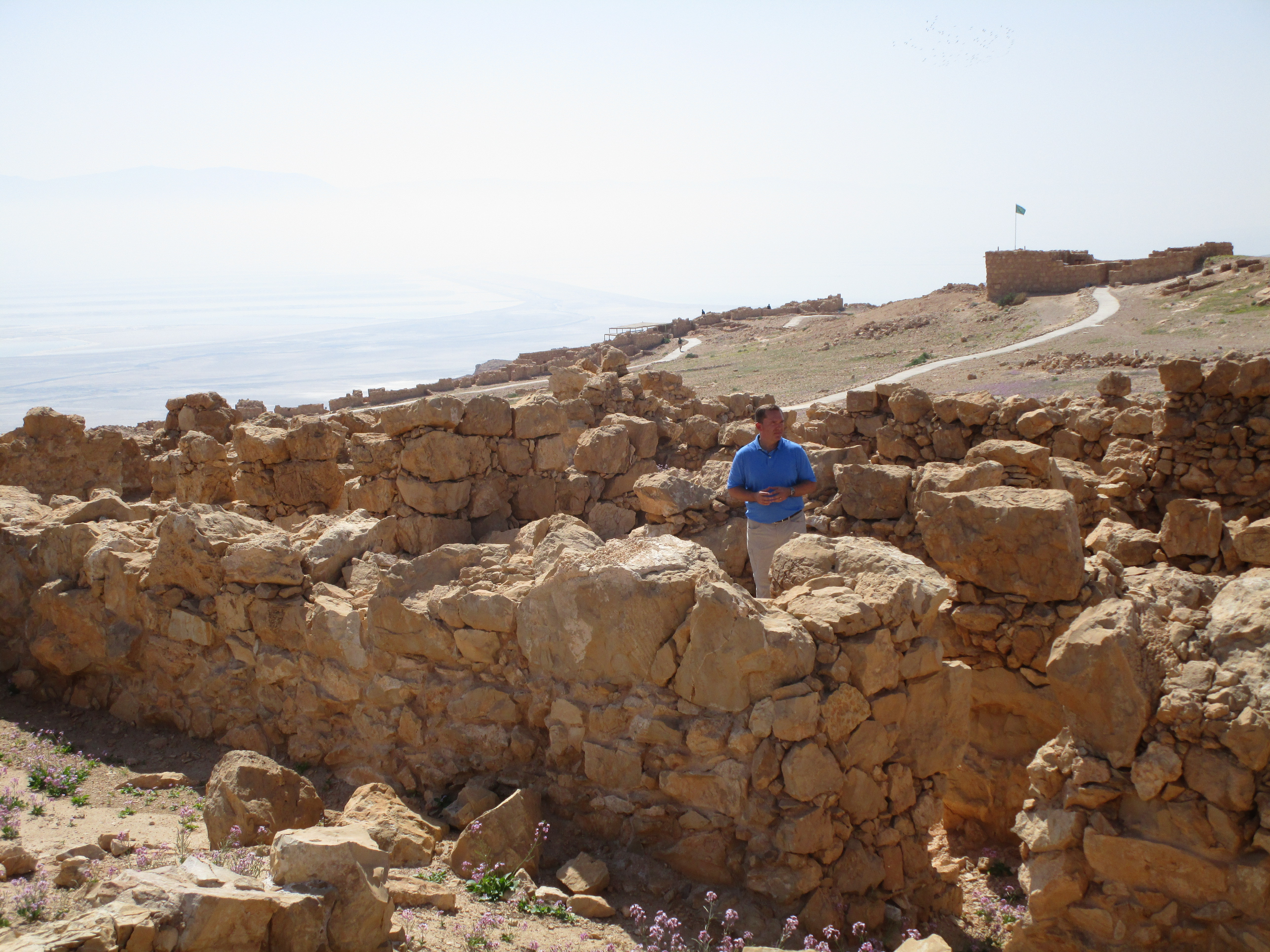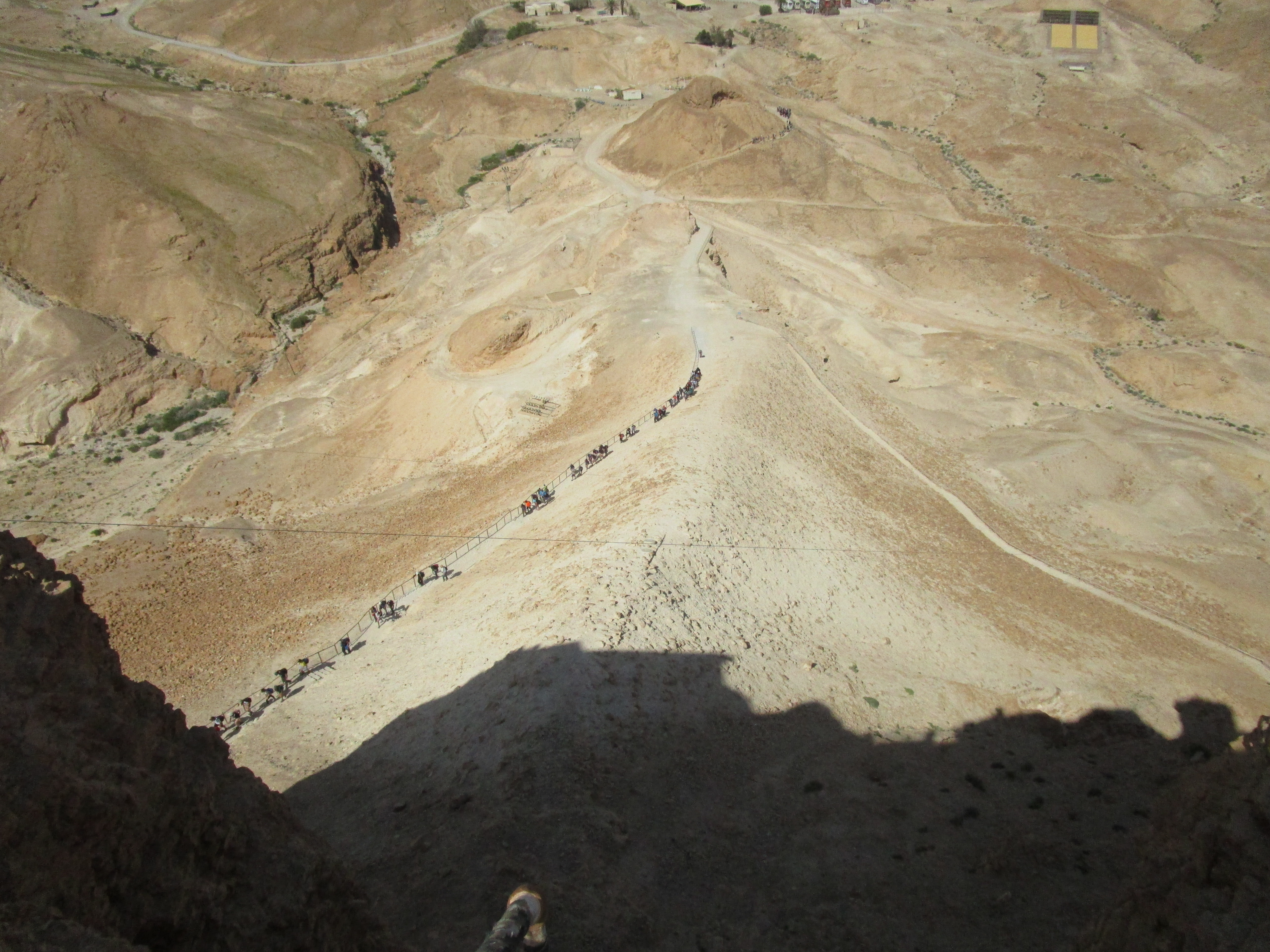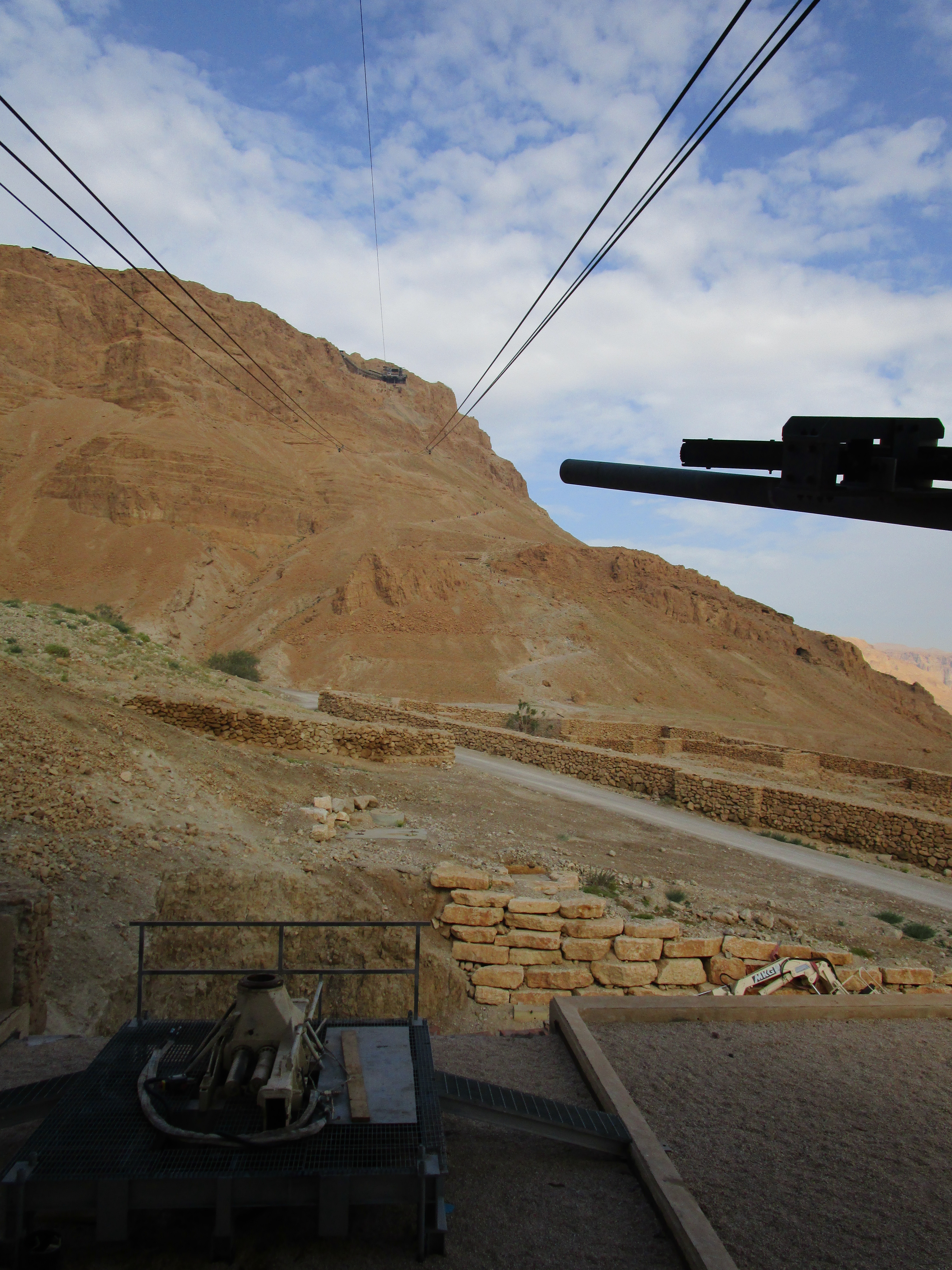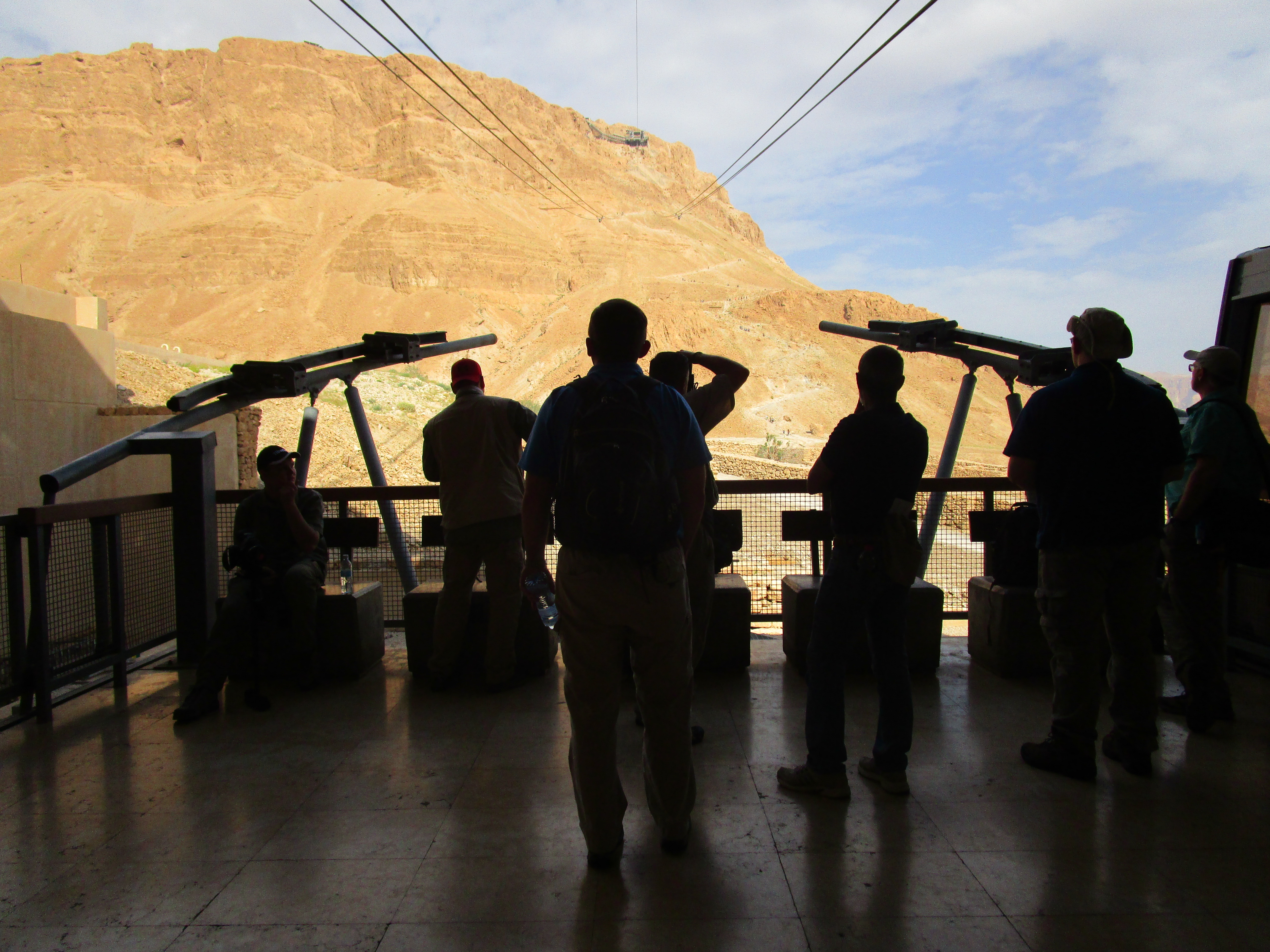 Our first stop, only about 30 minutes from the hotel, was Masada. John has been training for months to be able to walk up the snake path to the top. This path snakes back and forth up 700 stairs, for two and half miles up the east face of the mountain. Part of me wanted to hike it with him, but most of me didn’t want to drag him down. Jon climbed with him. Tsvi said, “Ees a nice walk, eef youre in good shape!” Rick, Philip, Gary, Mat, Doug, Dewayne, Micah and I took the cable car to the top so we could knock out some of Gary’s A-roll.