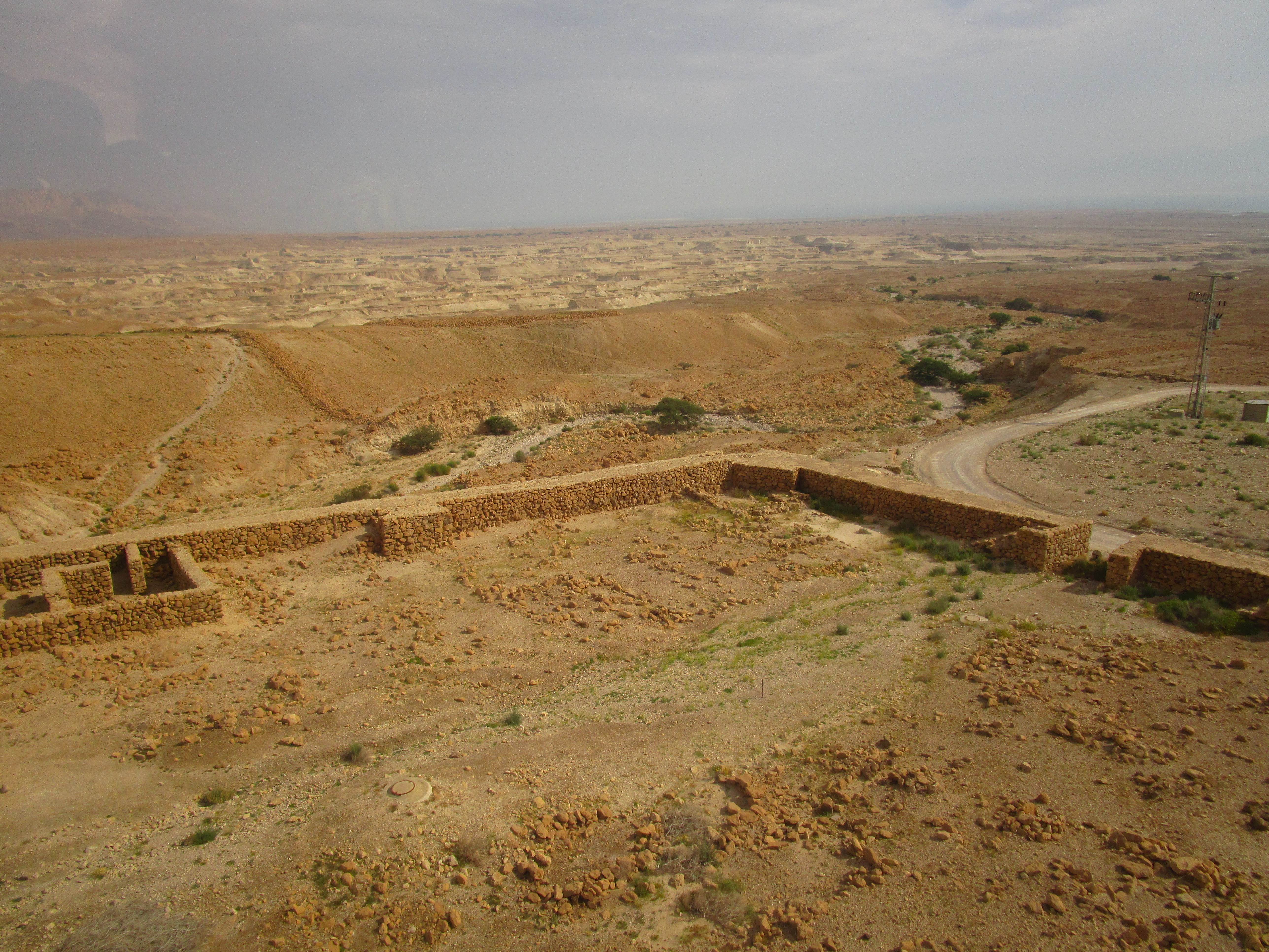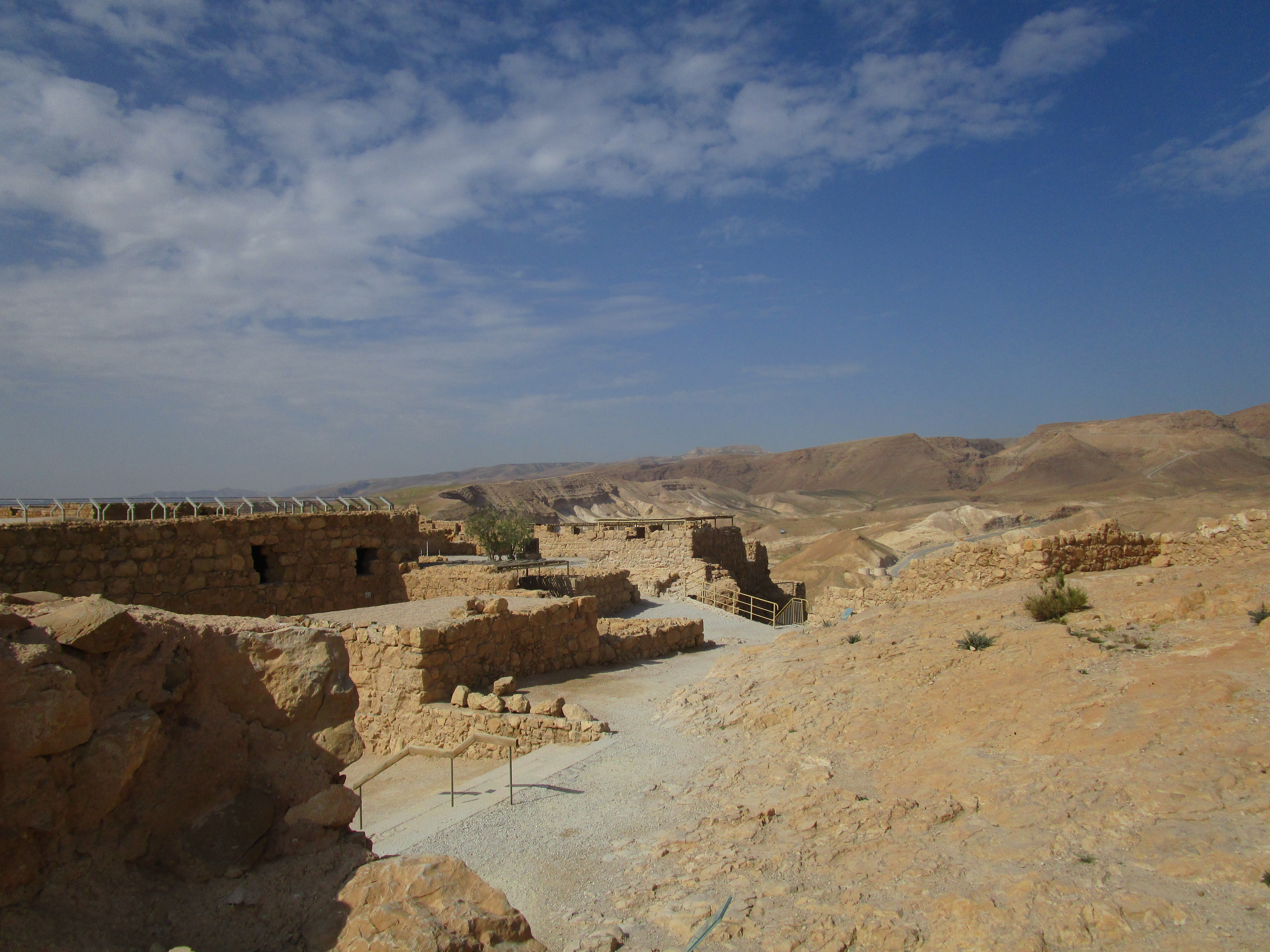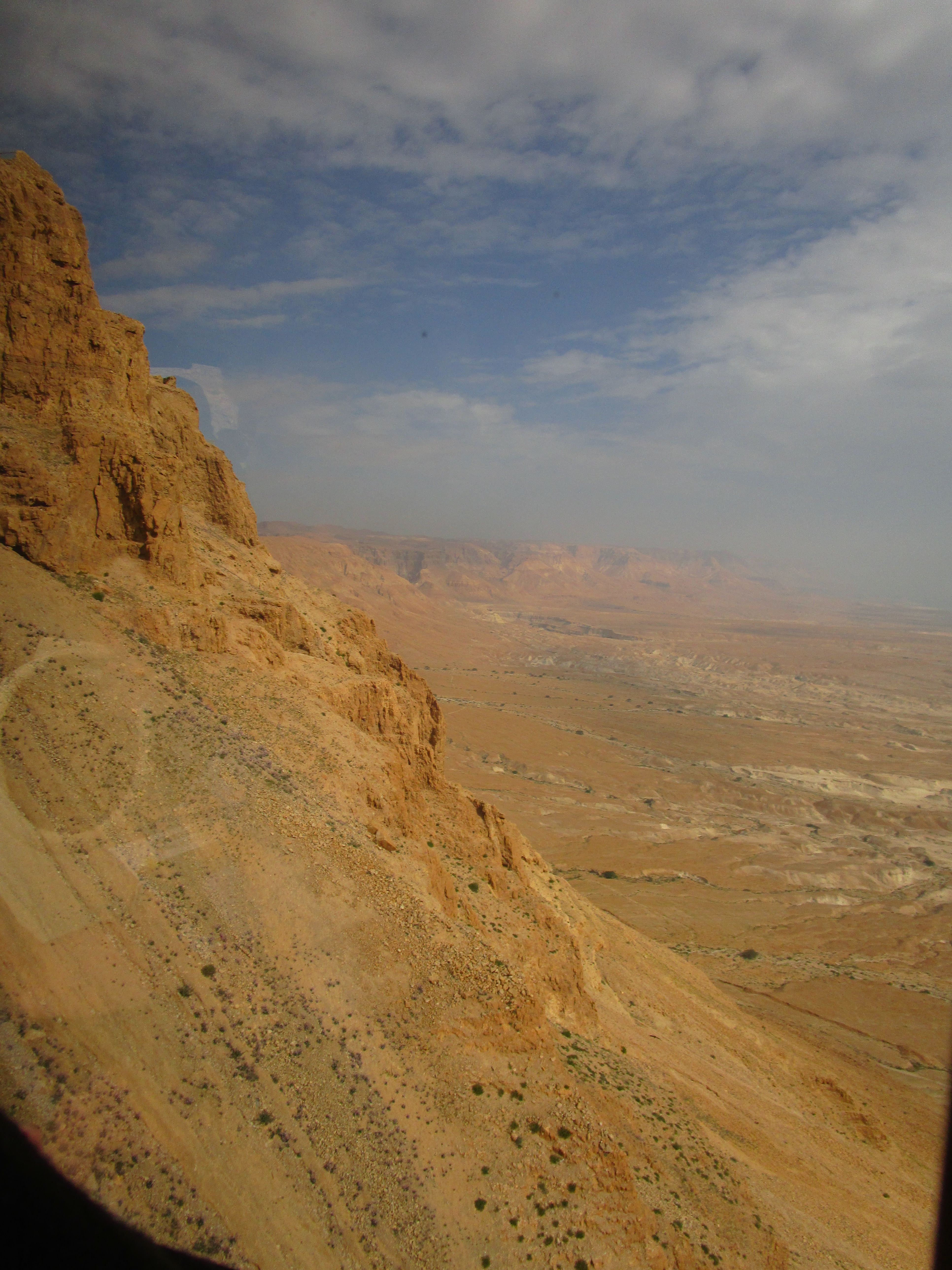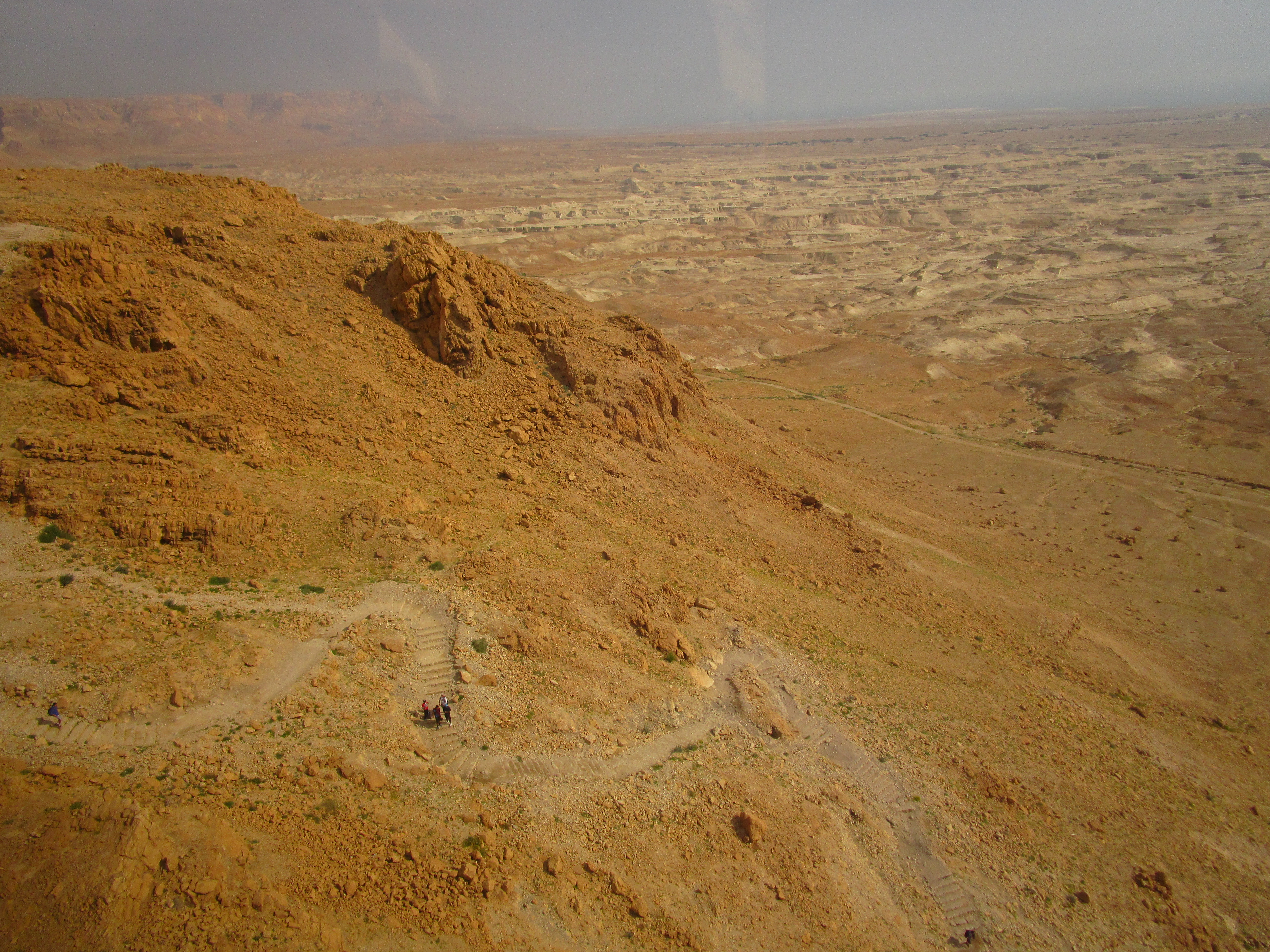 Masada is one of the massive, barren, rocky mountains that rises sharply out of the Judean wilderness. What sets it apart from the others around it are the forbiddingly steep cliff faces along each side and the nearly flat mountaintop. Even I, with my virtually non-existent understanding of battle strategy, can understand how it would be easier to defend from above, when the defender can see those attacking from below. From its top you can see for miles around – the Dead Sea just to the east and the Trans Jordan mountains beyond it, and more of the Judean mountains to north, west, and south.