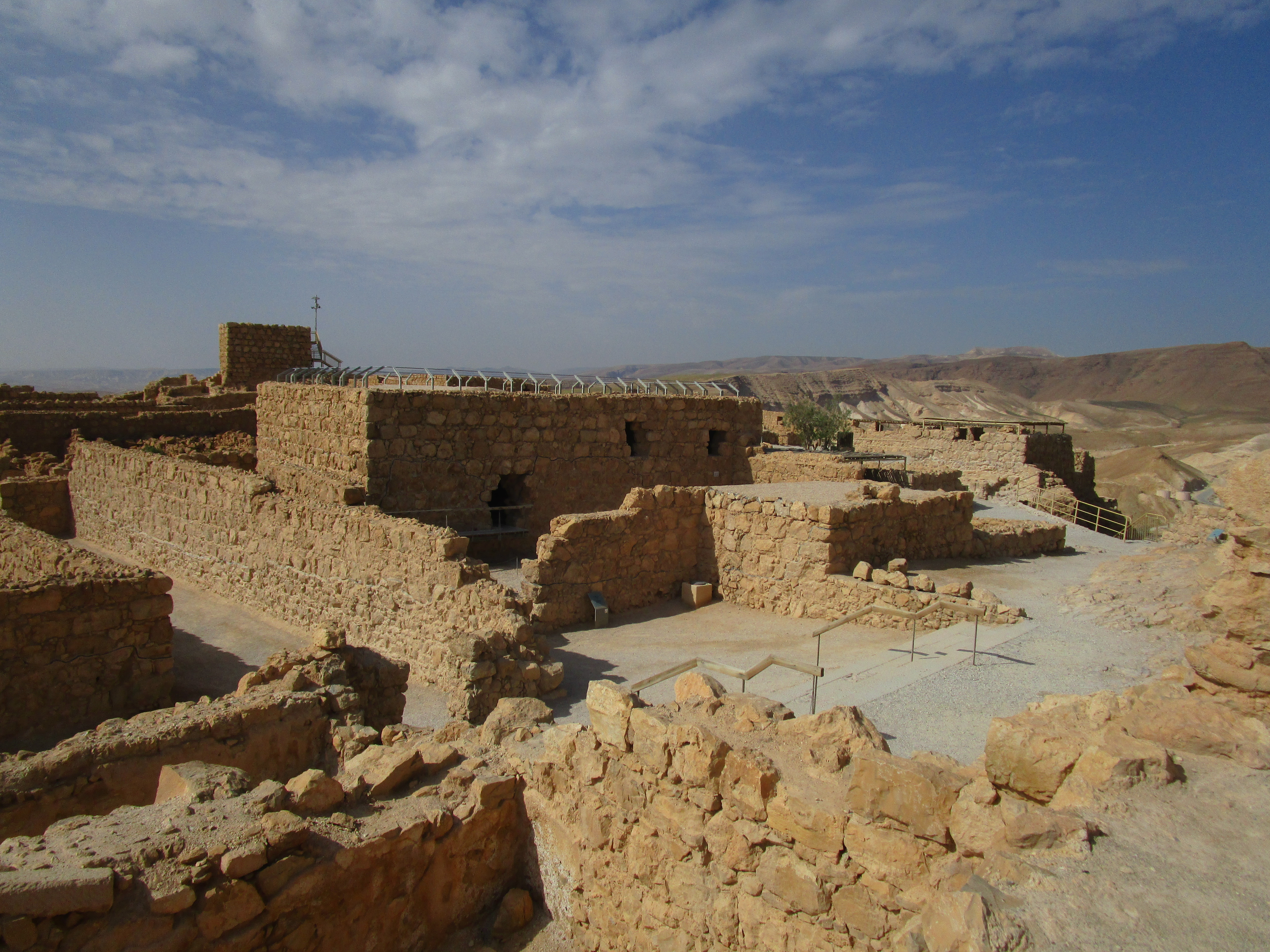 The top of Masada looked to me to be about four football fields together – not end to end, but one next to the other. It is hot (in fact, most of us look like raspberries tonight!) and dry on top. There are ruins to explore and models to learn from. Today there were quite a few schoolchildren sitting in classes here and there. Most of the walls have been rebuilt, but there is a black line that shows where the original material still stood, and they used the rocks that had fallen from the walls to rebuild them.