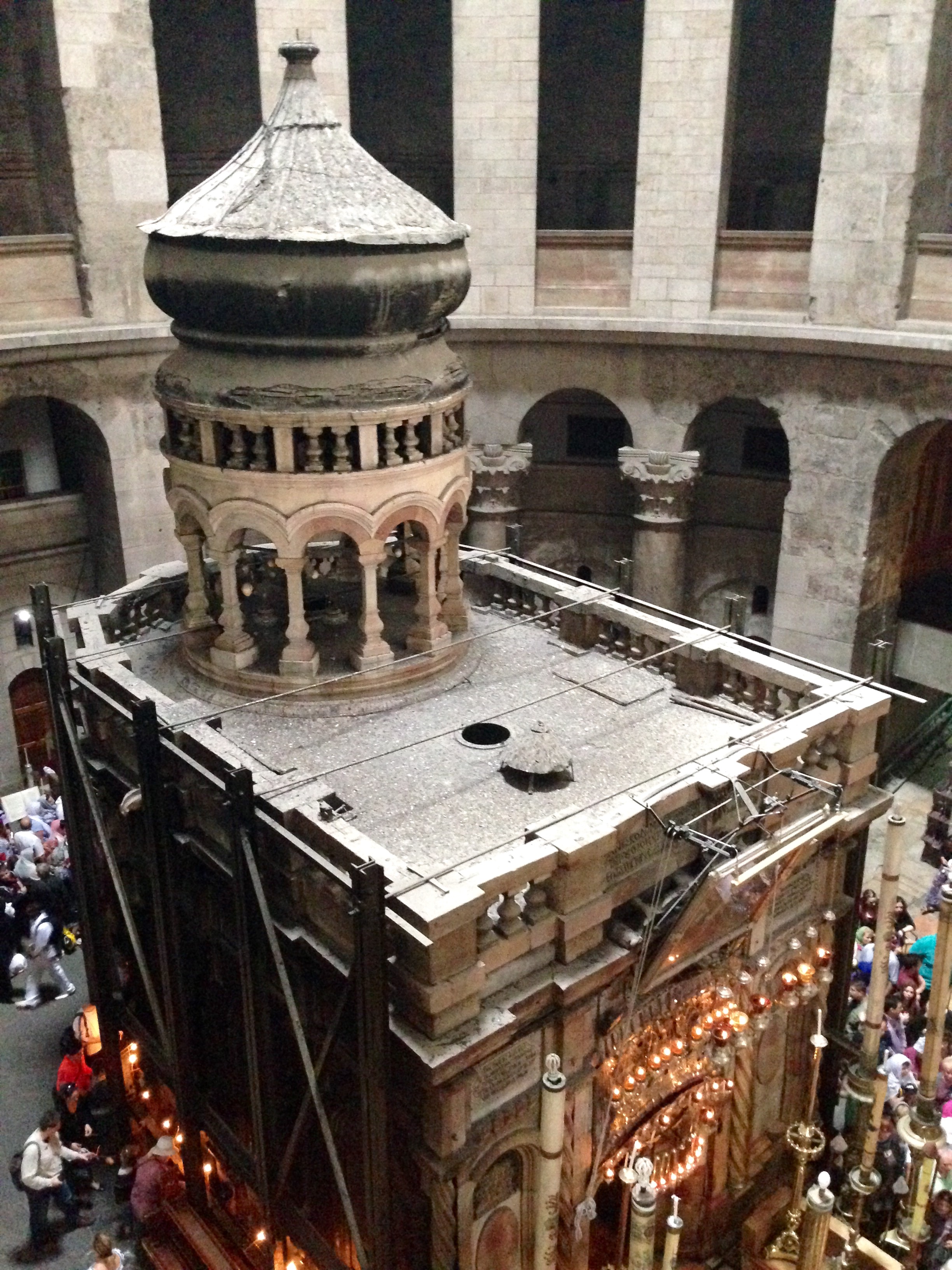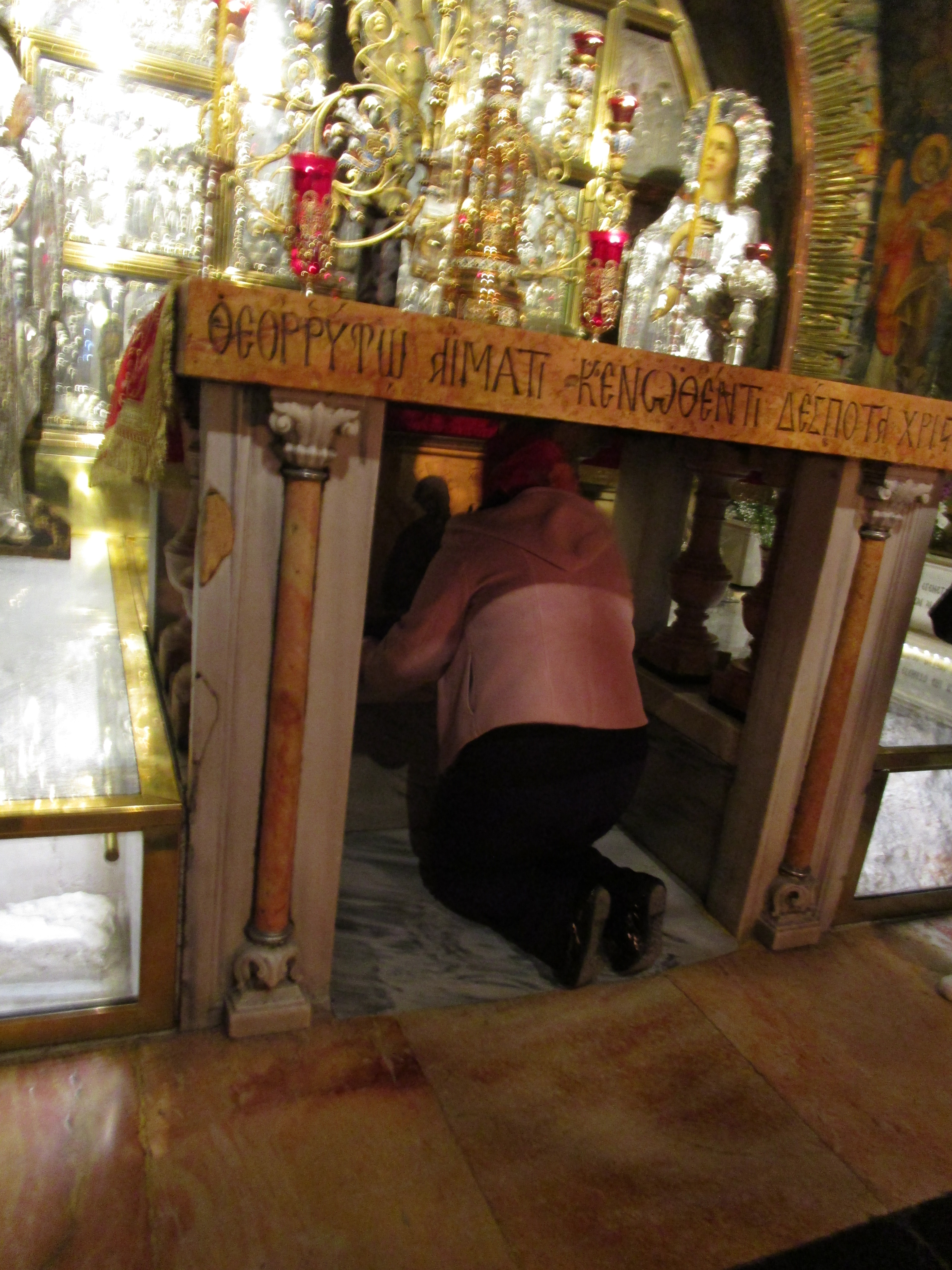 A huge line had formed to walk up a spiral staircase with tall, shallow, dangerous steps. Upstairs, more people waited their turn to climb under a small table and touch the rock that is thought to be where He was crucified. We climbed down and made our way to the other side of the building, where Russian orthodox have built a shrine over where they thought the tomb was located.