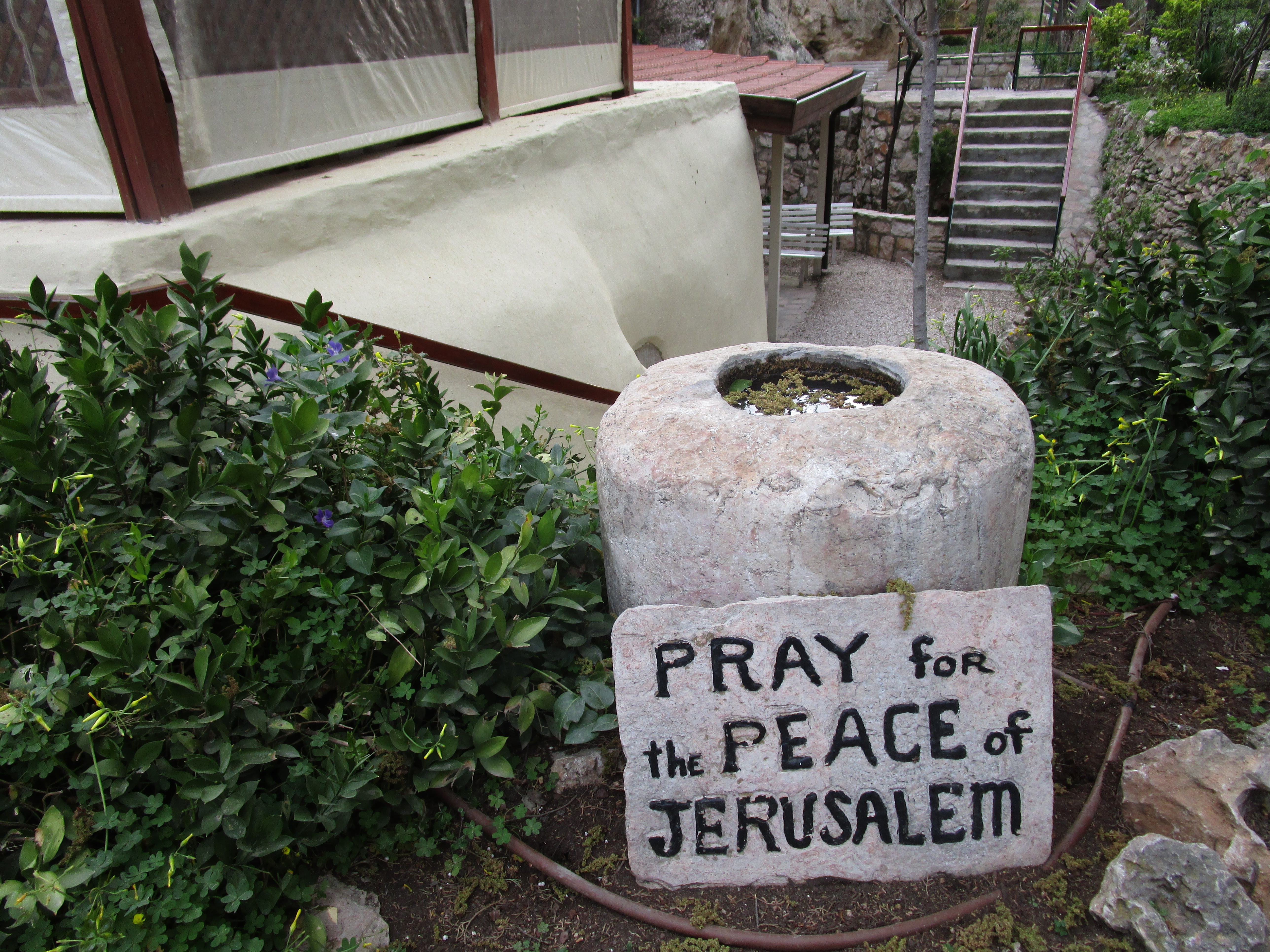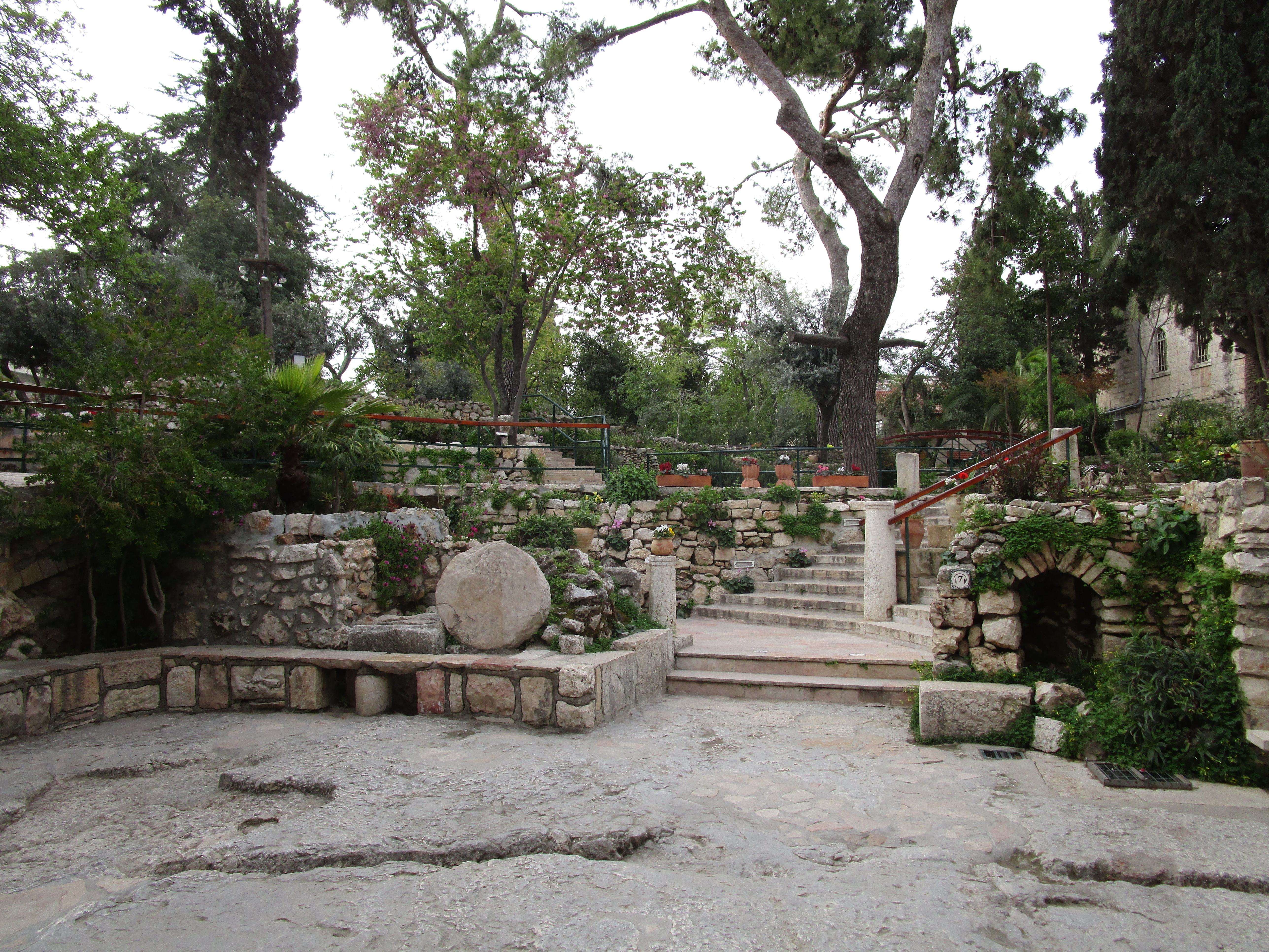 The door of the tomb has a sign which says “He is not here, for He is risen”. The sight of the large, heavy, round stone makes it easier to understand why the women who were on their way to the tomb wondered who would roll it away for them. Inside the low-ceilinged tomb, behind metal bars, was a low shelf where the body would have been laid.