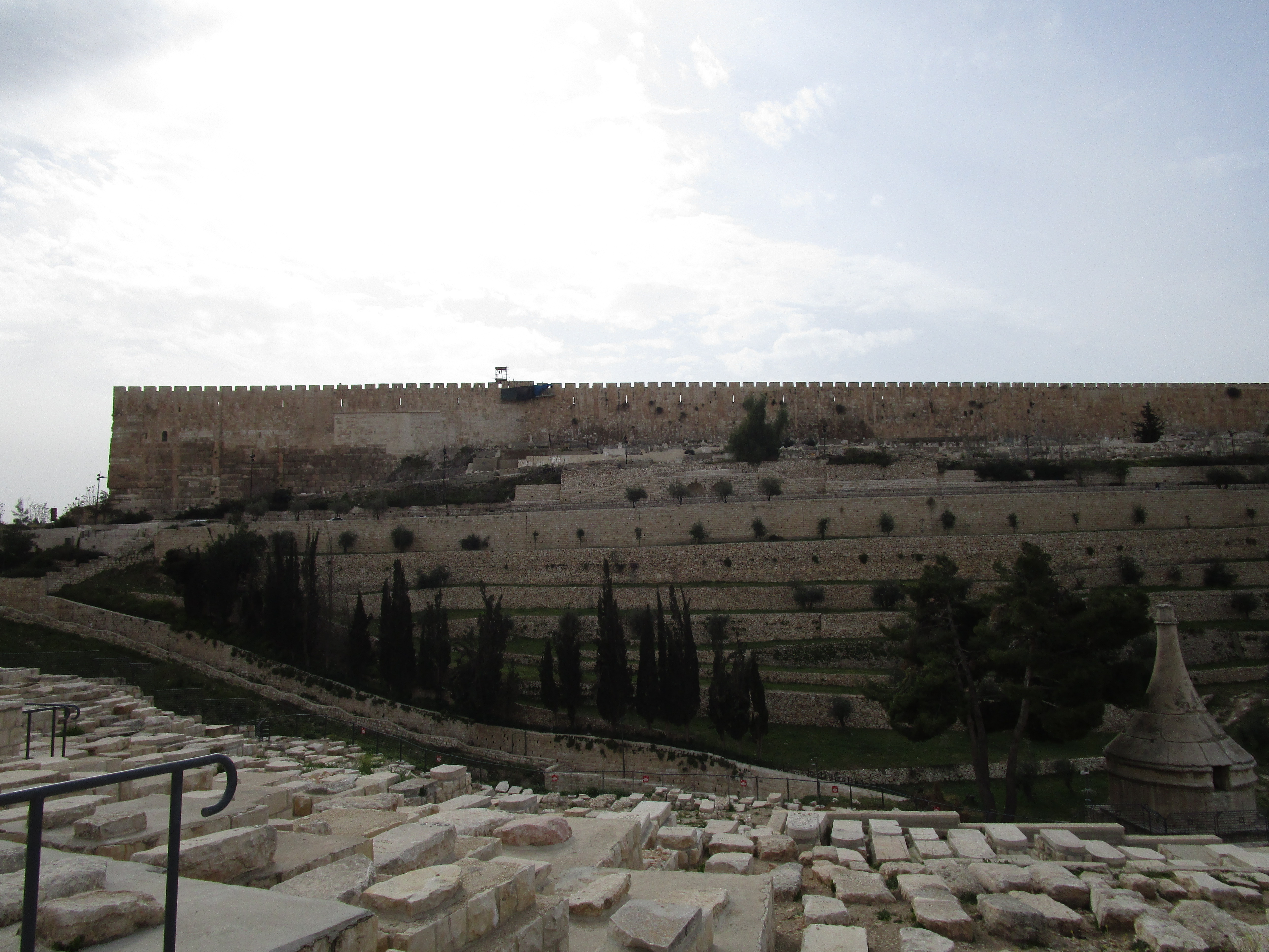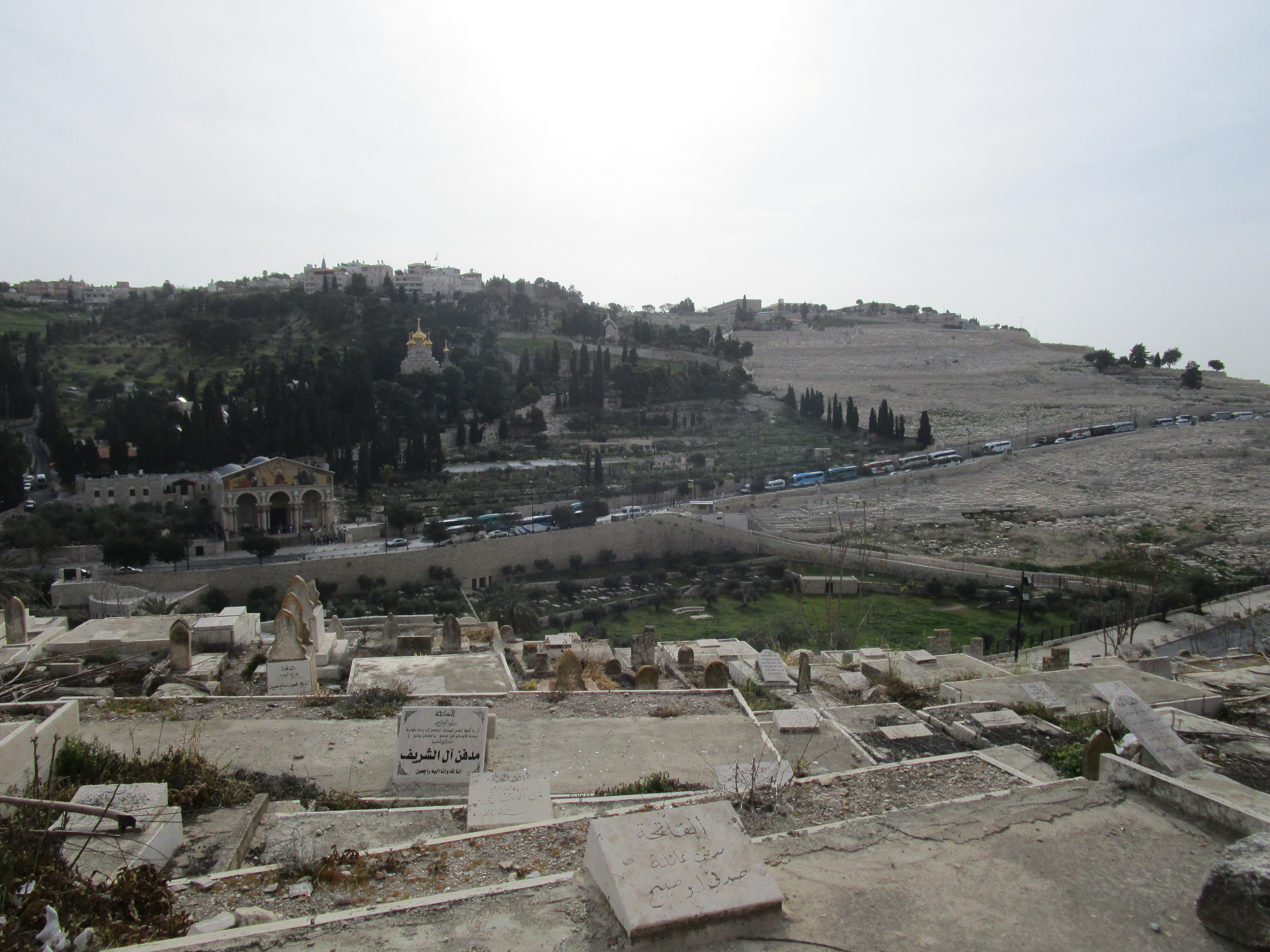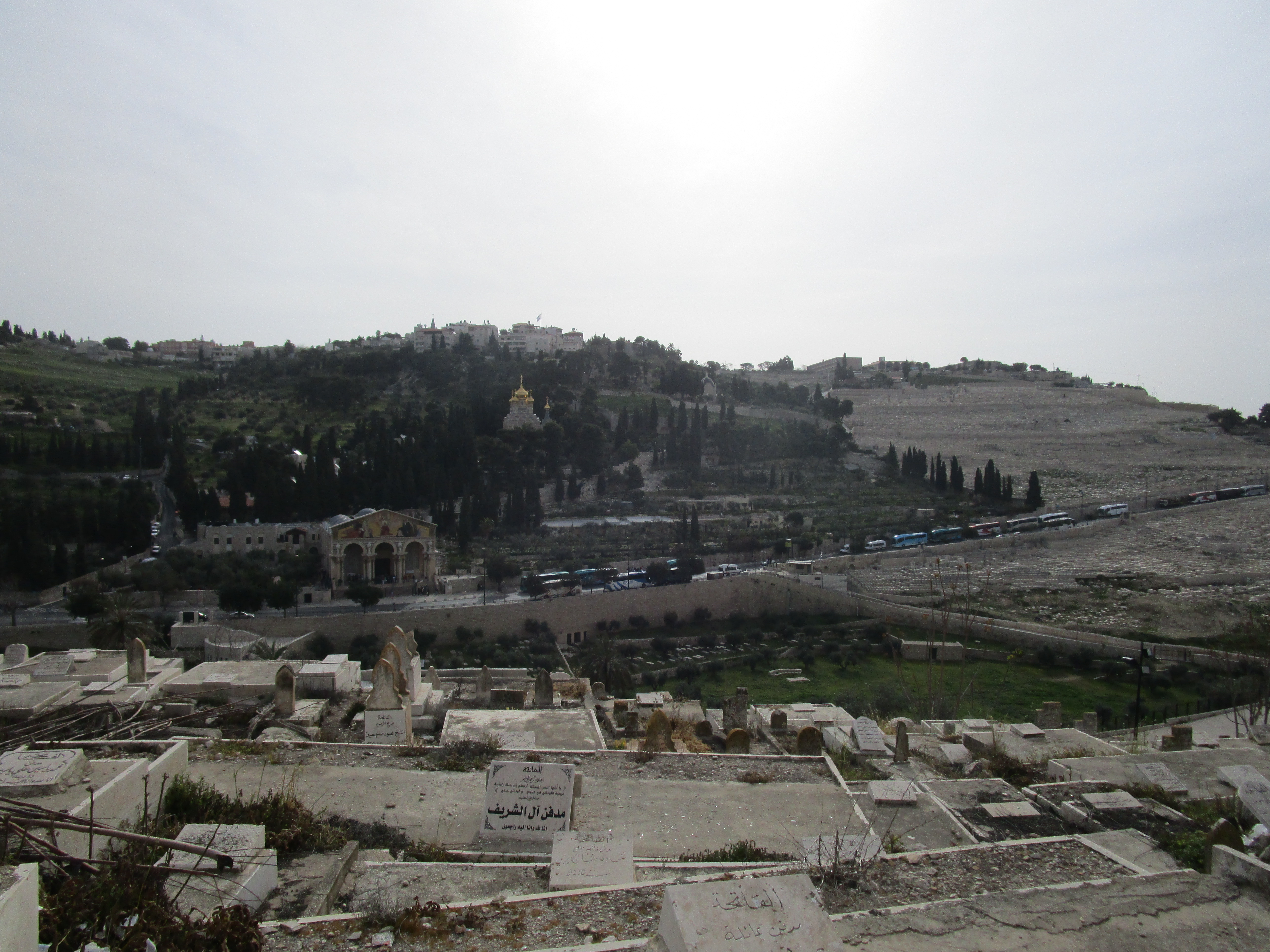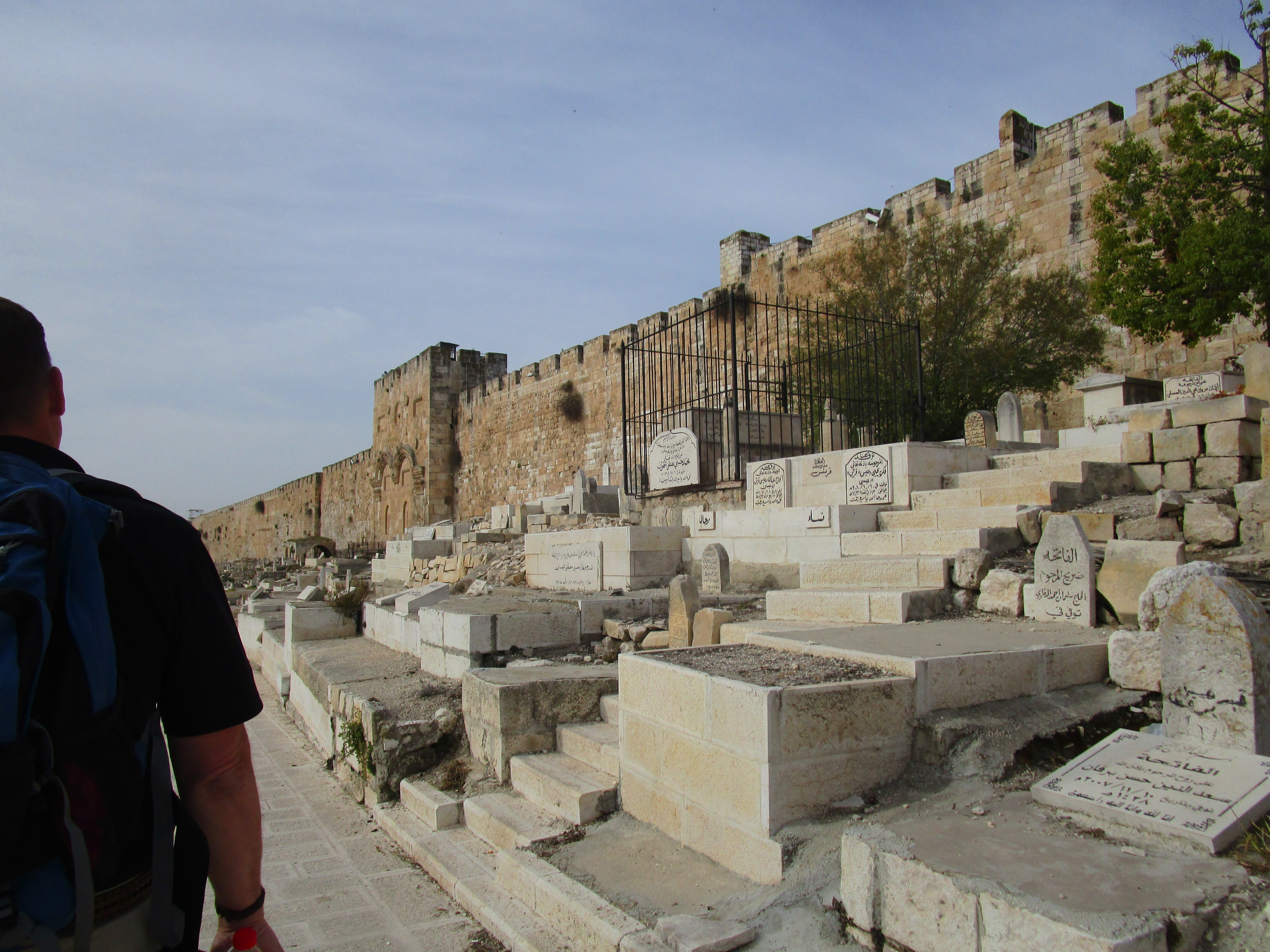 After our stay at the Garden Tomb, we headed to what John kept calling the “Golden Gate”, but I wasn’t sure what he was talking about, and I wasn’t paying attention to which direction we were going in the bus. Tsvi, Jon and John were discussing how to approach the “guard” and who needed to get out and who needed to stay in the bus and if any money needed to be involved. It sounded a little sketchy, and when we stopped, I realized we were on the other side of the valley from the Mount of Olives, on the eastern slope of the Temple Mount. Which meant we were heading into the Muslim cemetery. It was decided that only Mat, Jon and Gary would go in, since they would be filming. Tsvi reminded them that they must stay on the pathway, not step on any gravestones, and not cross any fences.