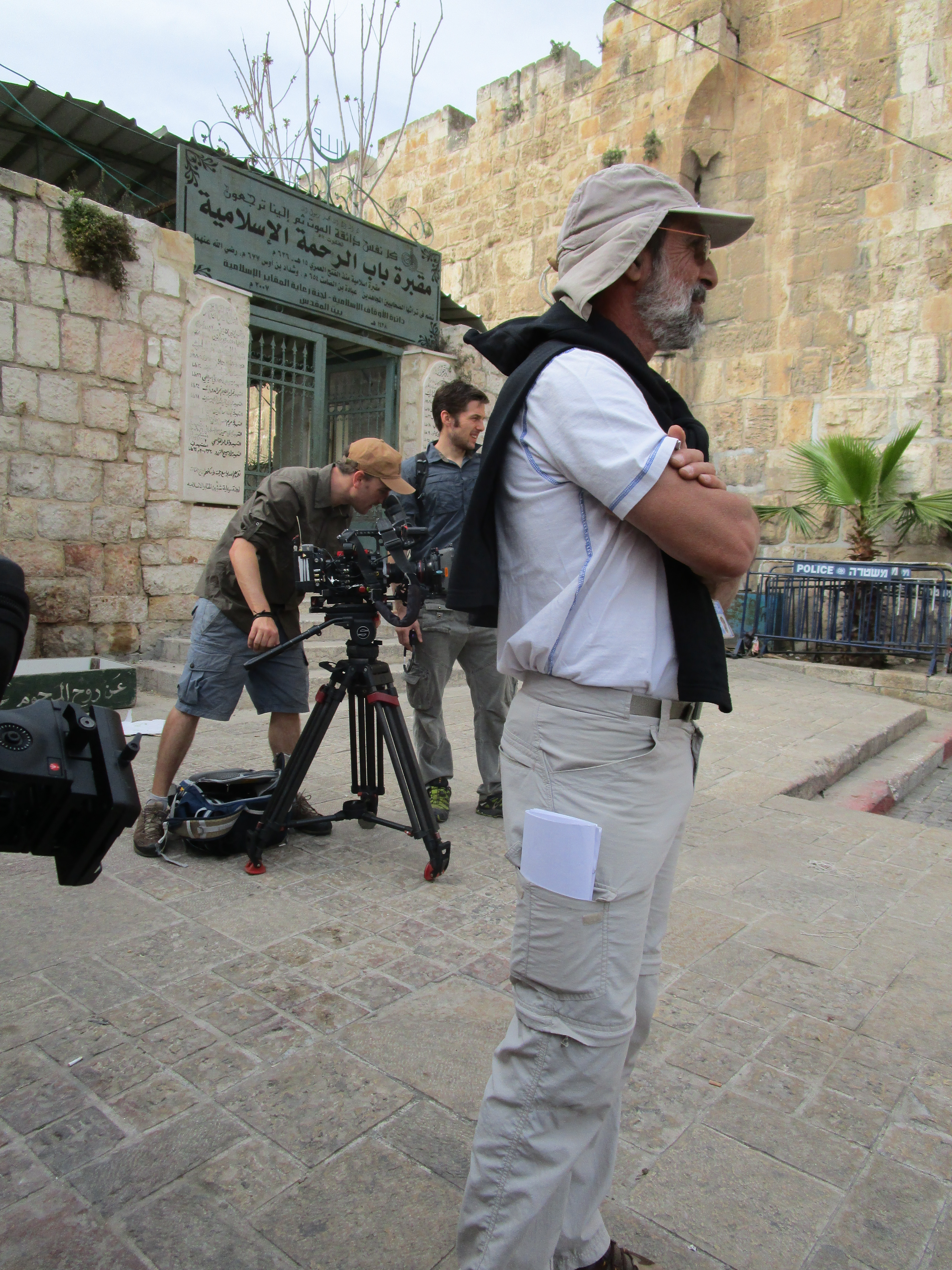 Finishing up at the cemetery, we went just outside and to the left, and we were at the “Sheep” gate. Jon had some A-roll he needed to do, so we began setting up the cameras and getting things ready for him. About that time, up rolled a big white jeep with two white SUV’s behind, and out popped five scruffy, travel-weary looking guys and a huge television camera, complete with a fluffy microphone thing. Mat was already set up in the street facing the gate, where evidently these guys wanted to be, but he refused to be intimidated by them. Tsvi asked where they were from, and they said “The History Channel”. I’d never seen the main character, but they quickly got their (non-speaking) video out of the way and headed into the old city. (Later Dewayne told us it was Scott Wolter, from America Unearthed on History 2 – seen here.) Then Jon stood in the street and prepared to do his lines, but today the “sheep” gate was instead a “tractor” gate, because tractors kept coming, loudly, down our street, along with little Arabic women in long coverings, slowly meandering past Jon, tourists stopping right next to Jon and snapping pictures, as well as angry drivers, barking dogs, and everything else you could think of that would interrupt him.