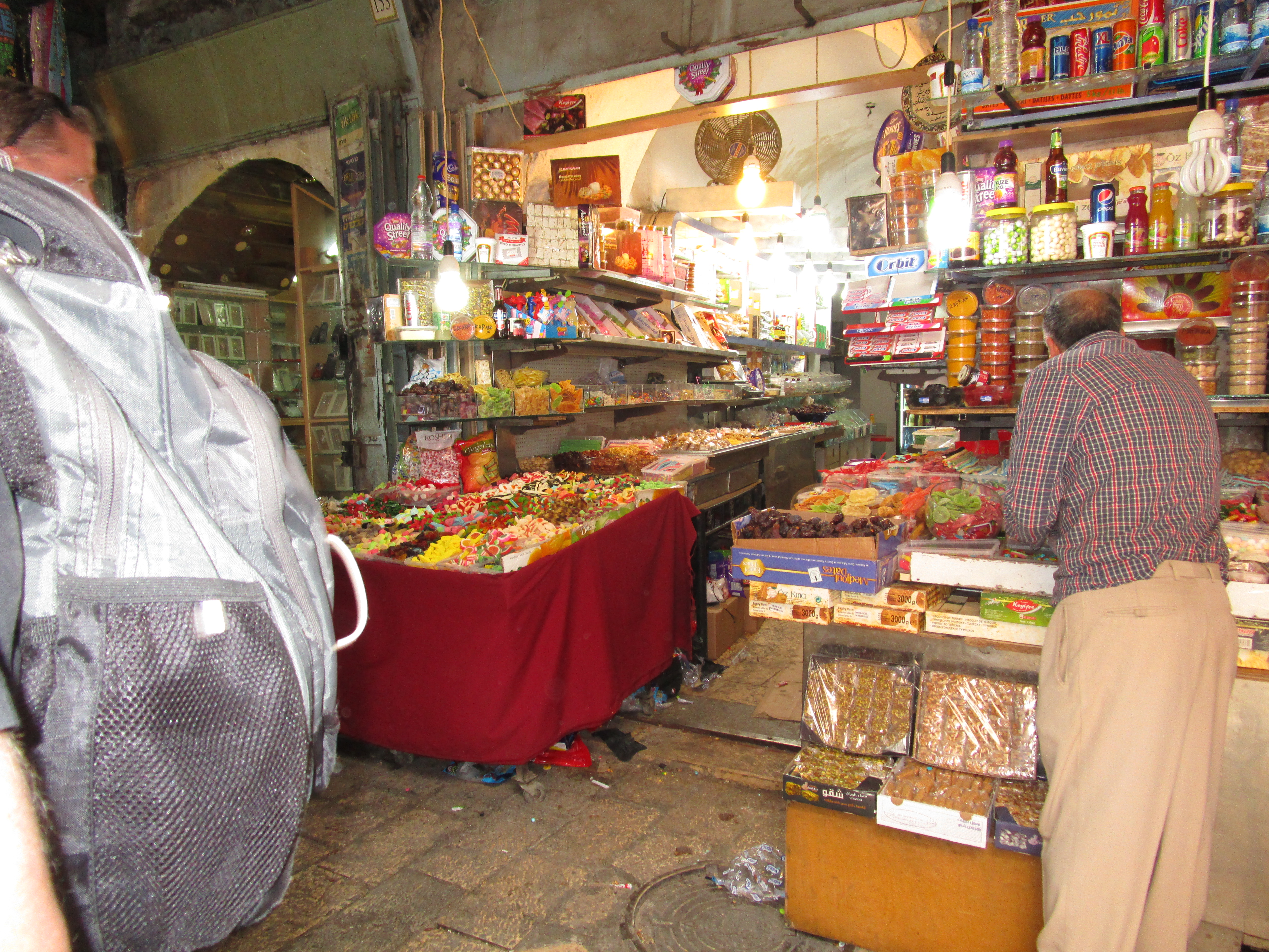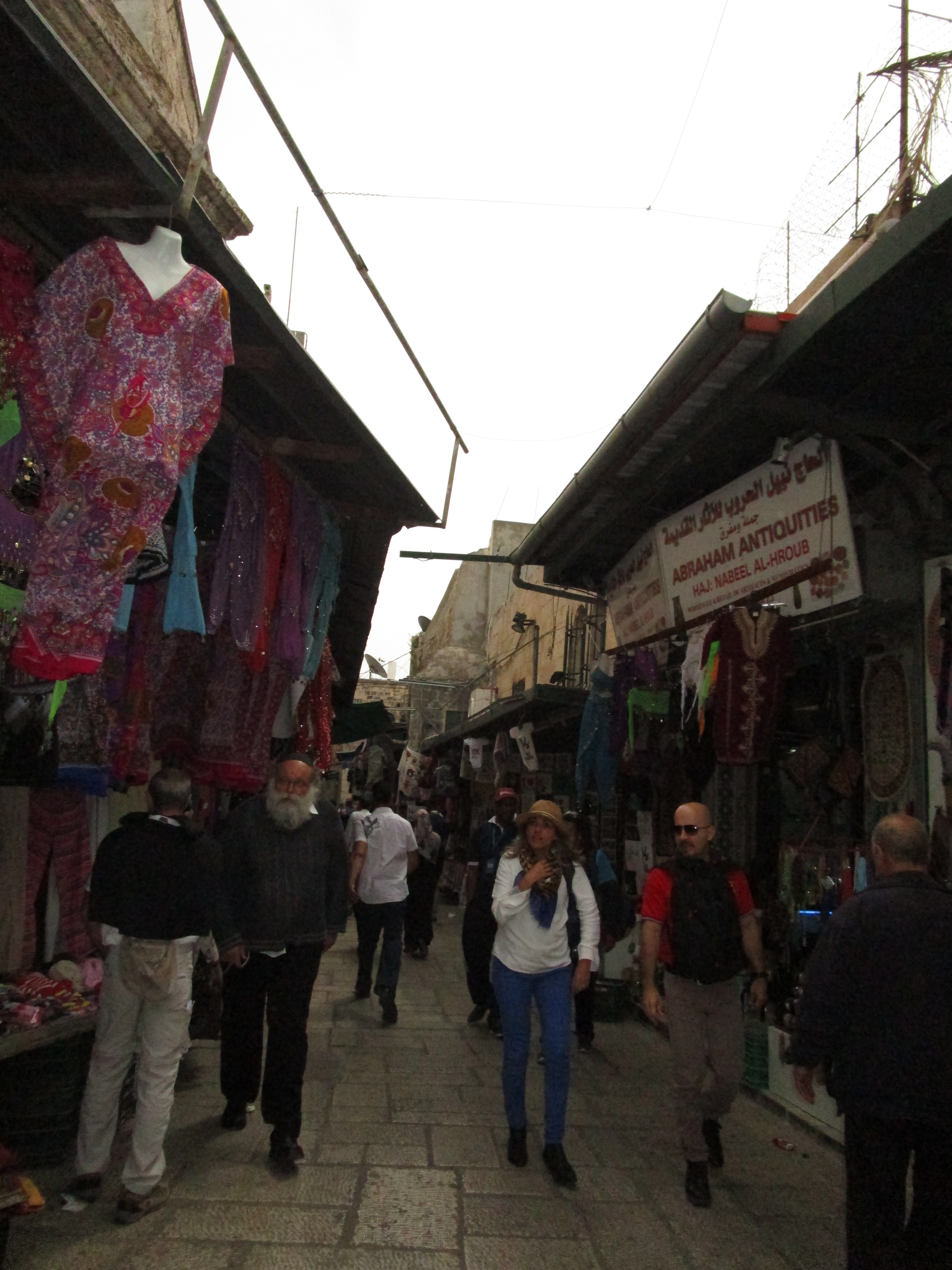 Walking through the shops in the Muslim quarter is overwhelming to the senses. Stone streets went up, up, up, past colorful shawls, cheap jewelry, junky kids toys. The smell of saffron, curry, and cumin was strong. We were crammed shoulder to shoulder with throngs of people, each trying to swim like a fish upstream around one another.