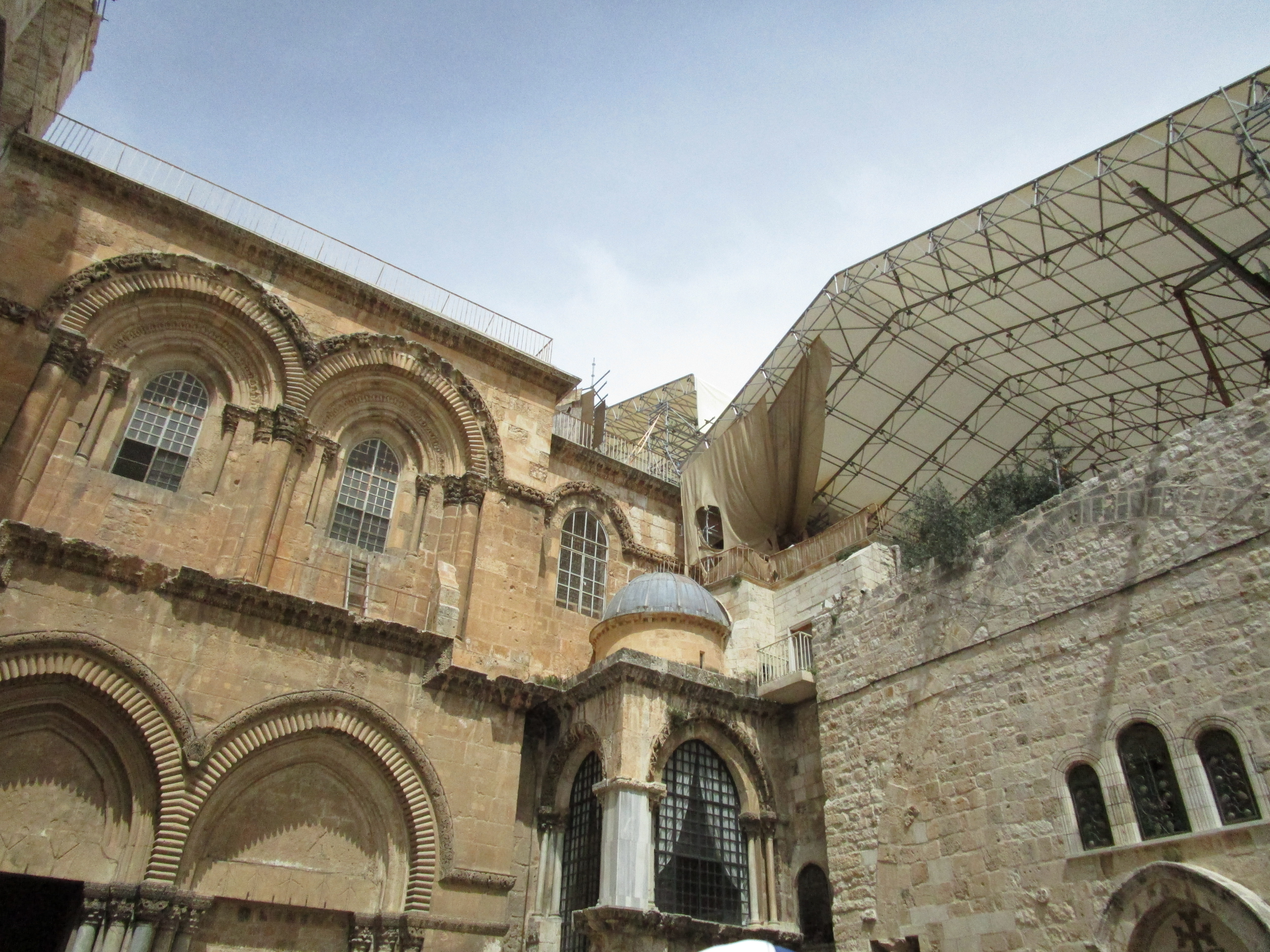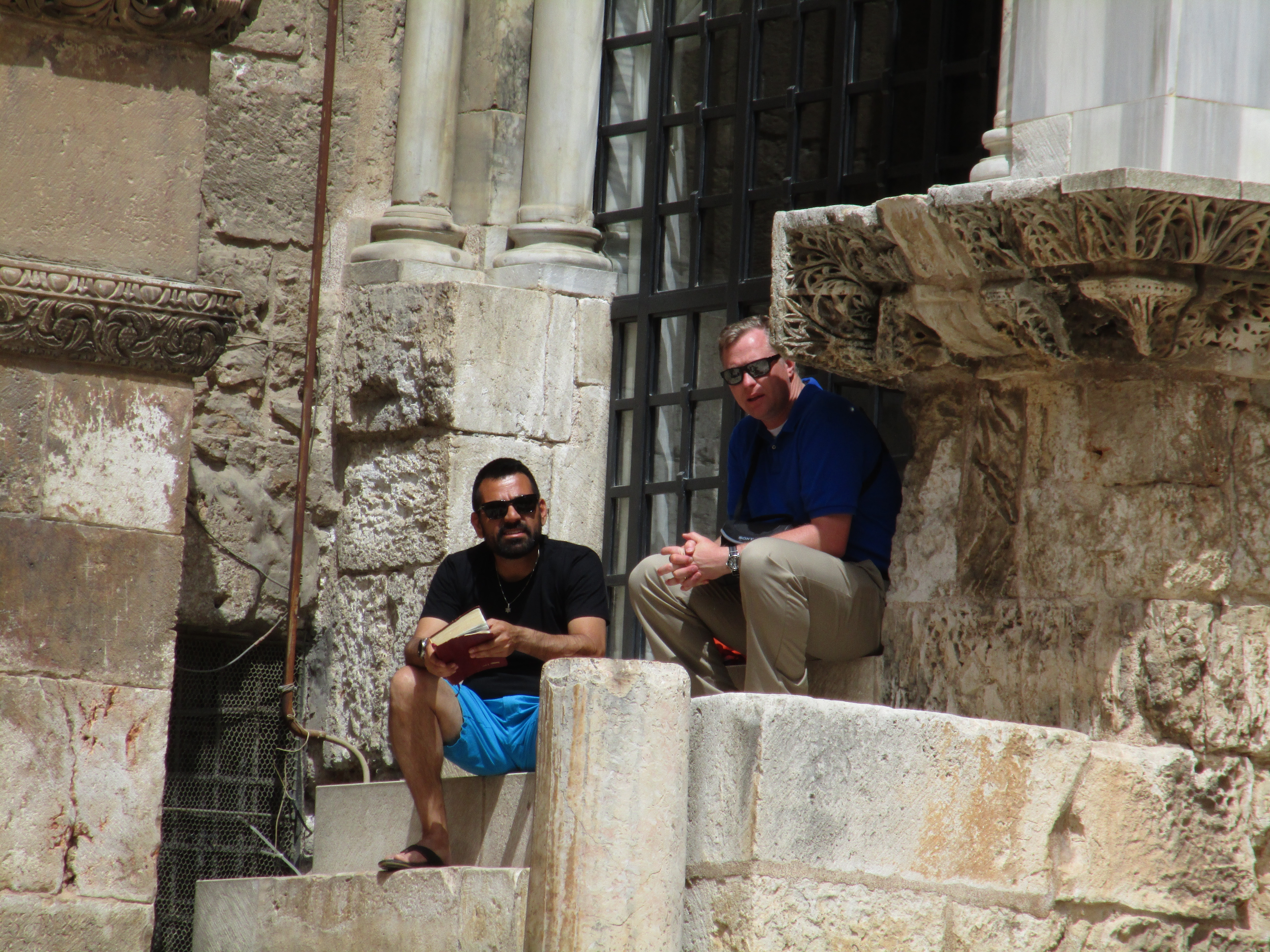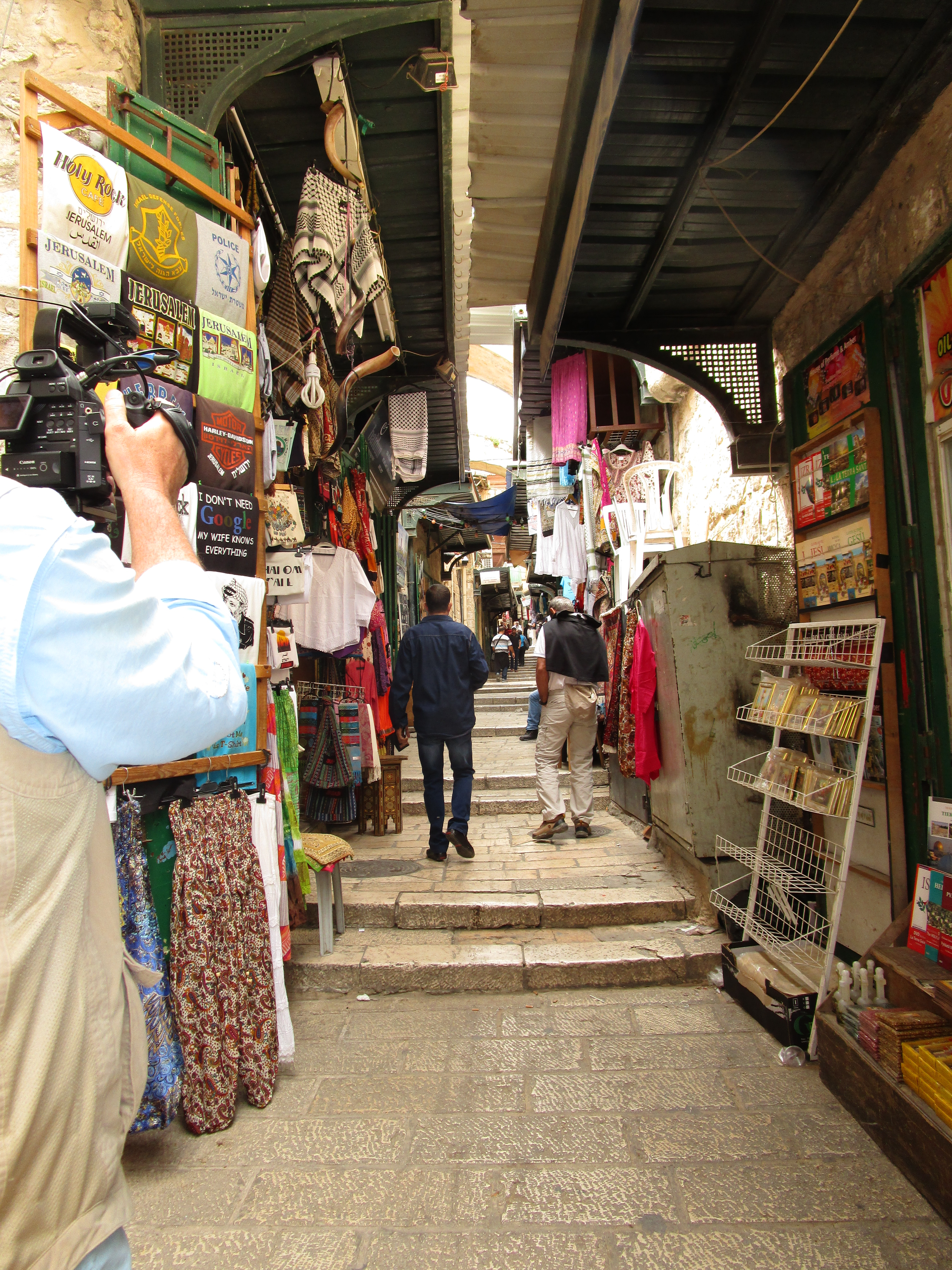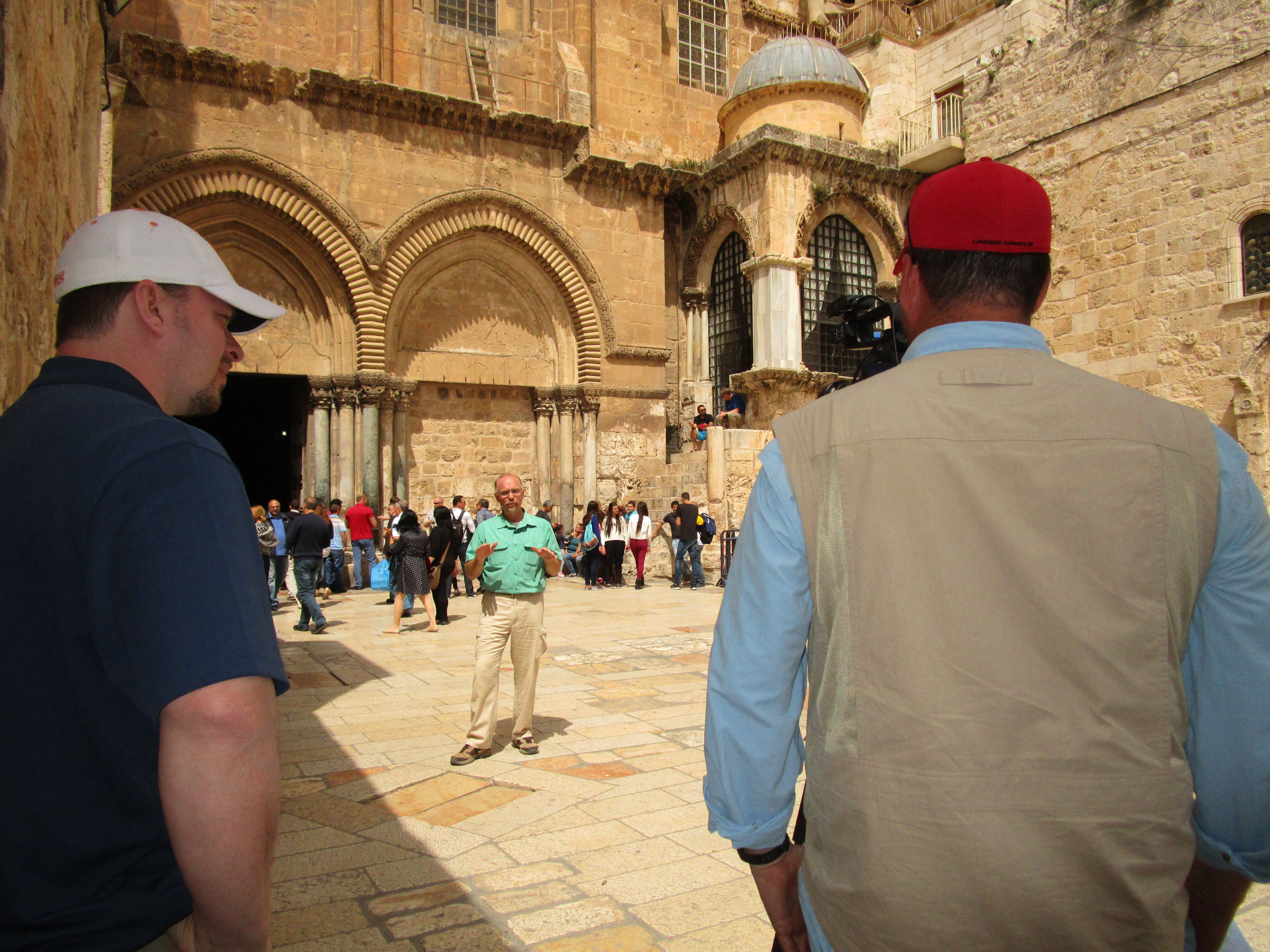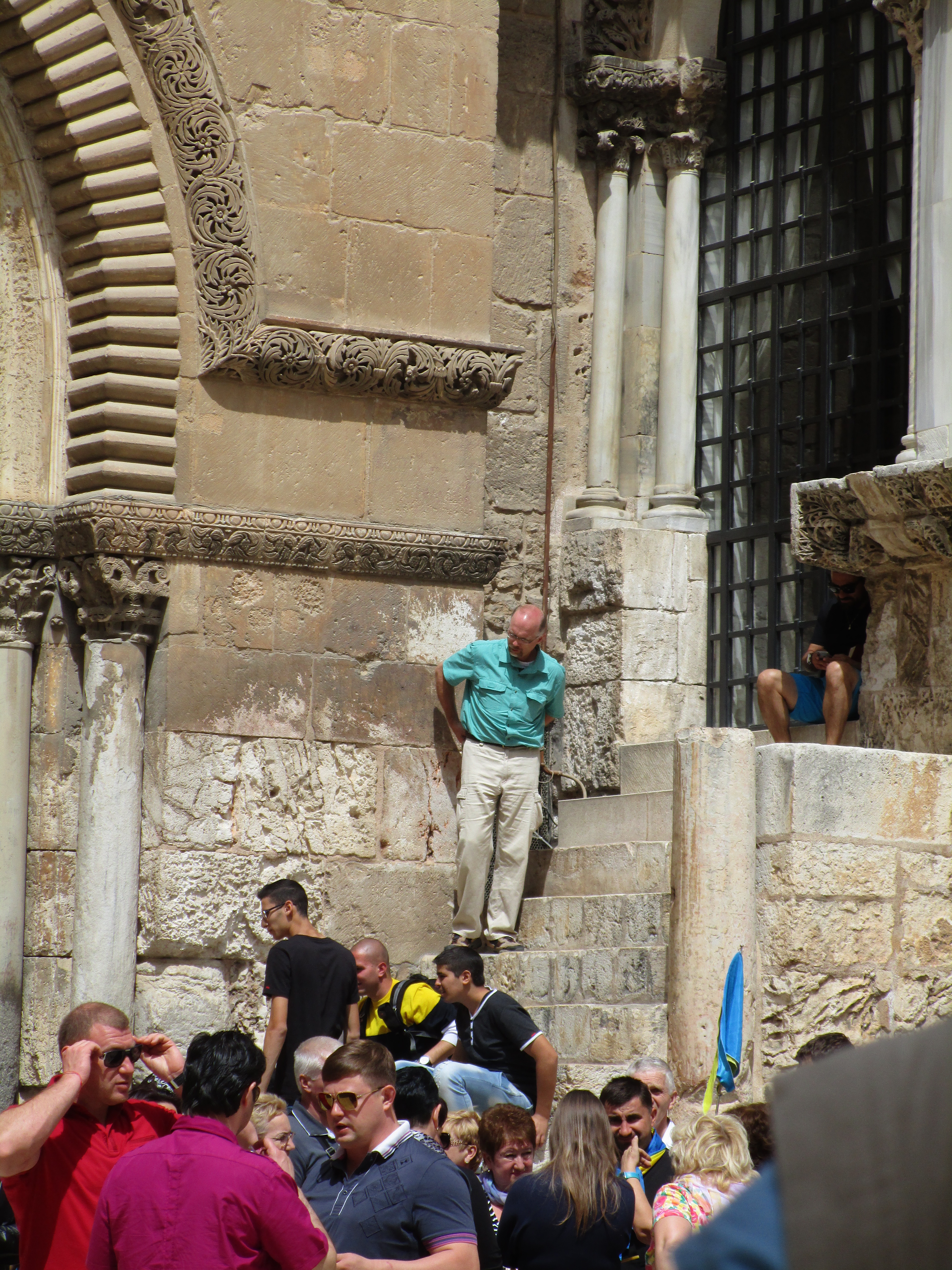 As we waited for filming to finish, I noticed again, as I have so many times the last few days, how many cultures, nationalities, and religions are represented in this place, all vying for attention and wanting to be seen, heard, and noticed. Inside the church building, a tour group sang “How Great Thou Art” in French. Simultaneously, outside, the Muslim’s prayer call began its broadcast throughout the city.. A Russian Orthodox man dressed in his tall black hood walked by, and in the distance I even heard what sounded like a marching band.