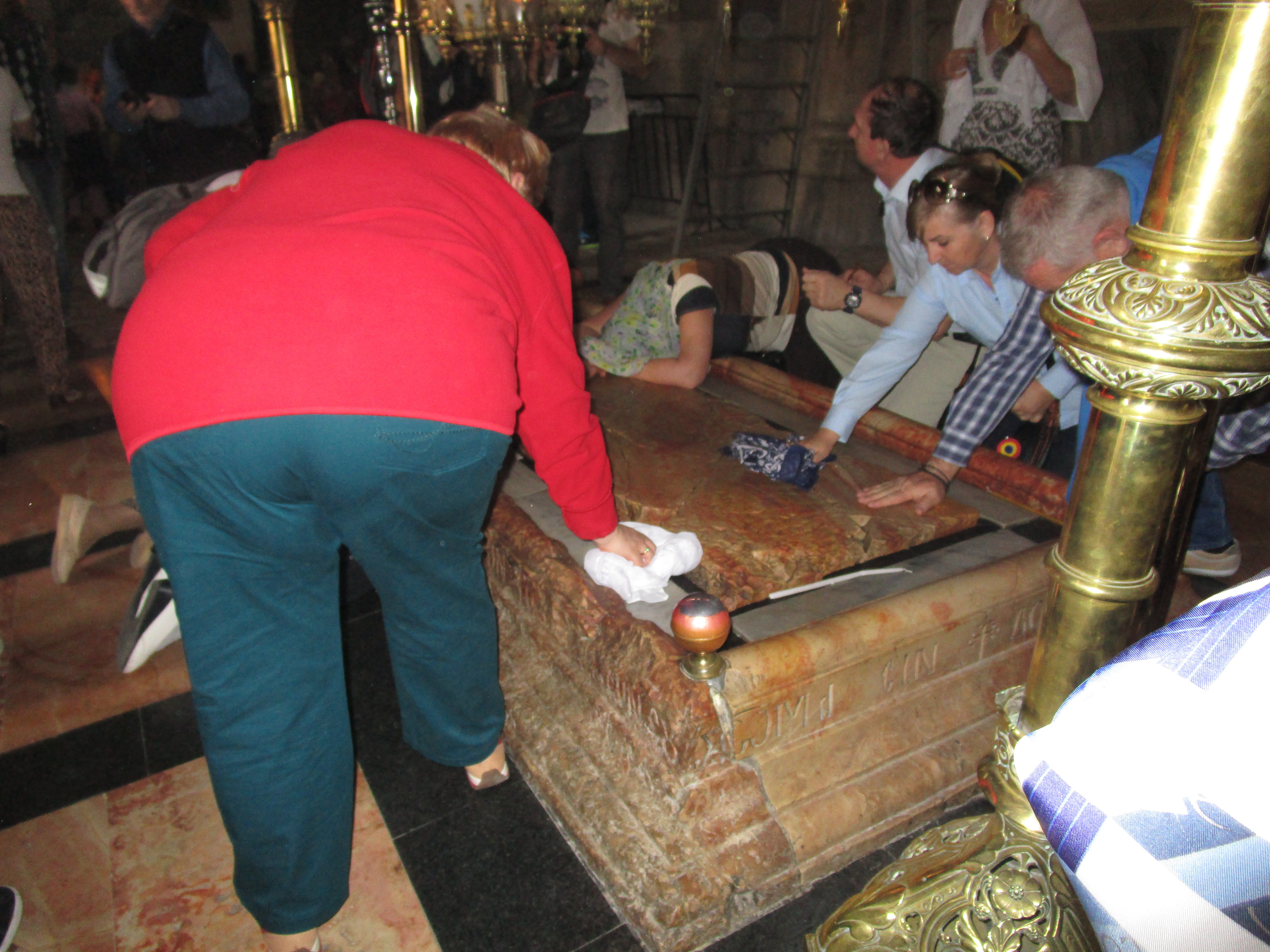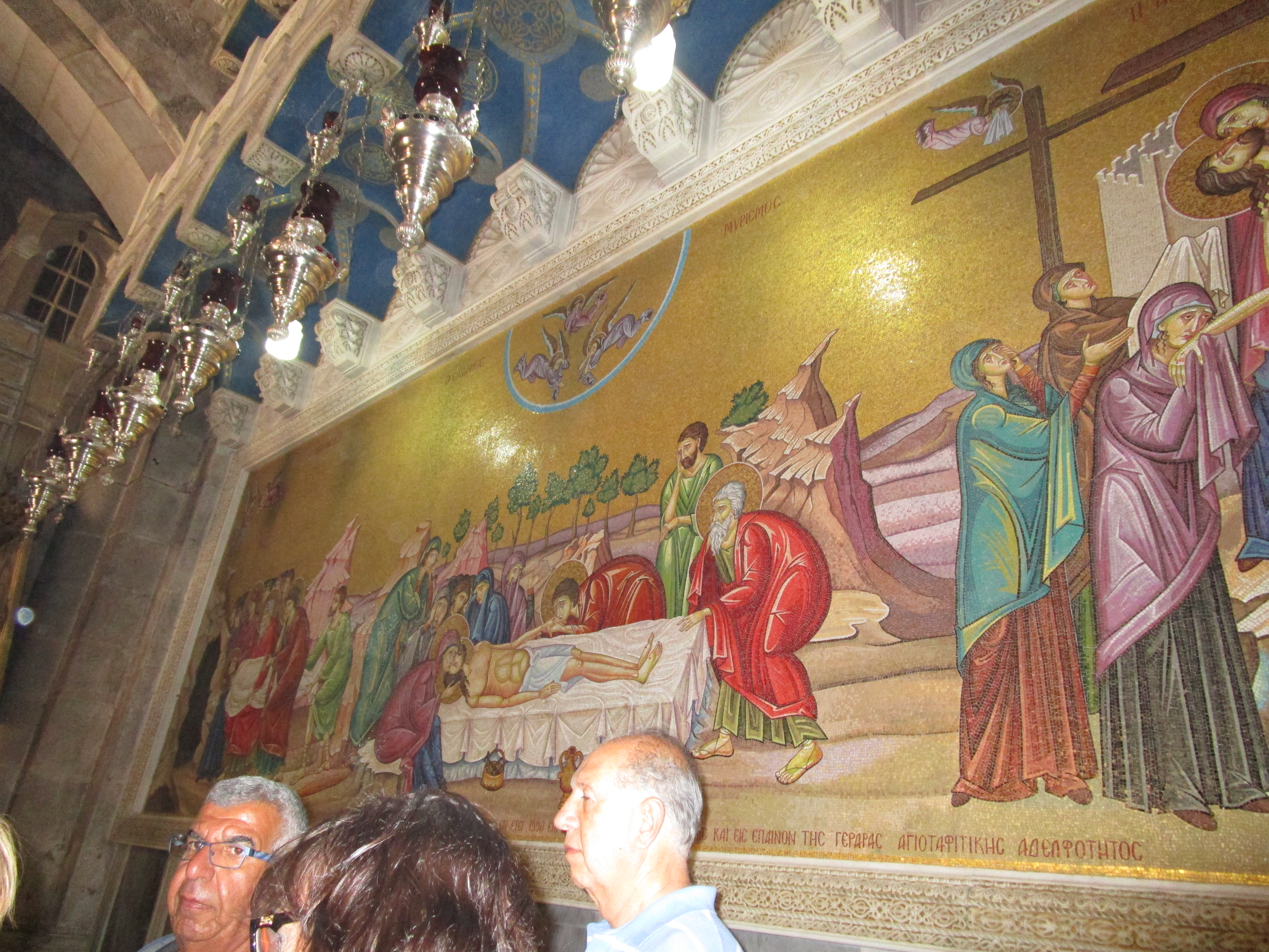 Rick had A-roll here, the place that seems most likely to be the site of Jesus’ death and burial. There were so many people in this courtyard, crowding into the church, it was almost claustrophobic. John and Micah were helping Mat with video, so I followed Jon and Gary into the dark, gothic, ornate church building. Immediately upon entering, I saw a group of women on their knees with their faces pressed to a long rock that was surrounded by a low barrier. Jon explained that this was thought to be the rock where Jesus was laid after being taken down from the cross. A beautiful mosaic behind told the story of His being taken off the cross.