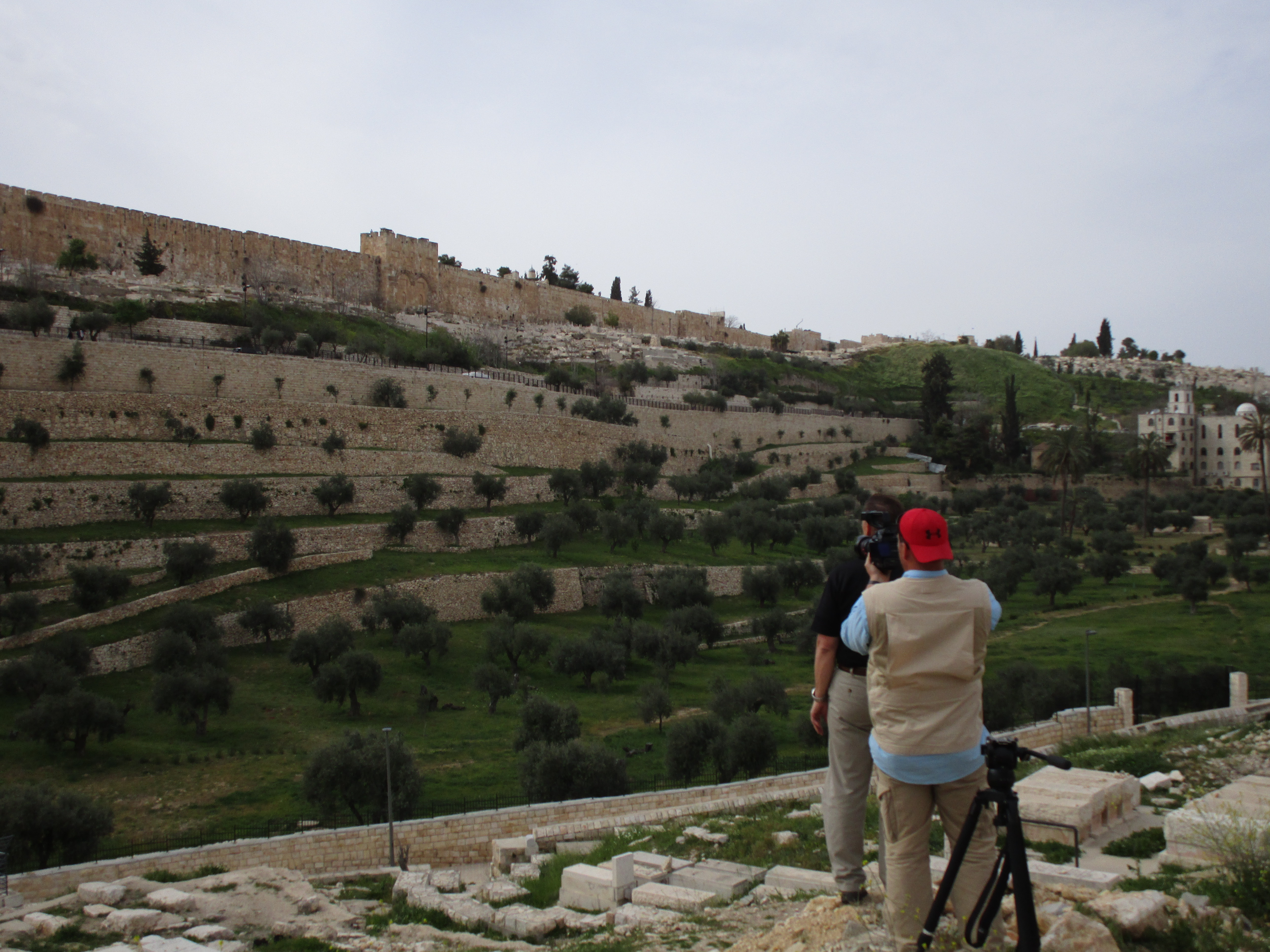 Our final stop was the Kidron Valley, directly across the street from the Garden of Gethsemane, we walked down a white stone pathway into the green, lush valley below. John found a spot in the Jewish cemetery to finish some A-roll, and then we hiked AGAIN up 4000 steps to meet Yossi and Tsvi on the other side, directly under the southeastern corner of the Temple Mount.