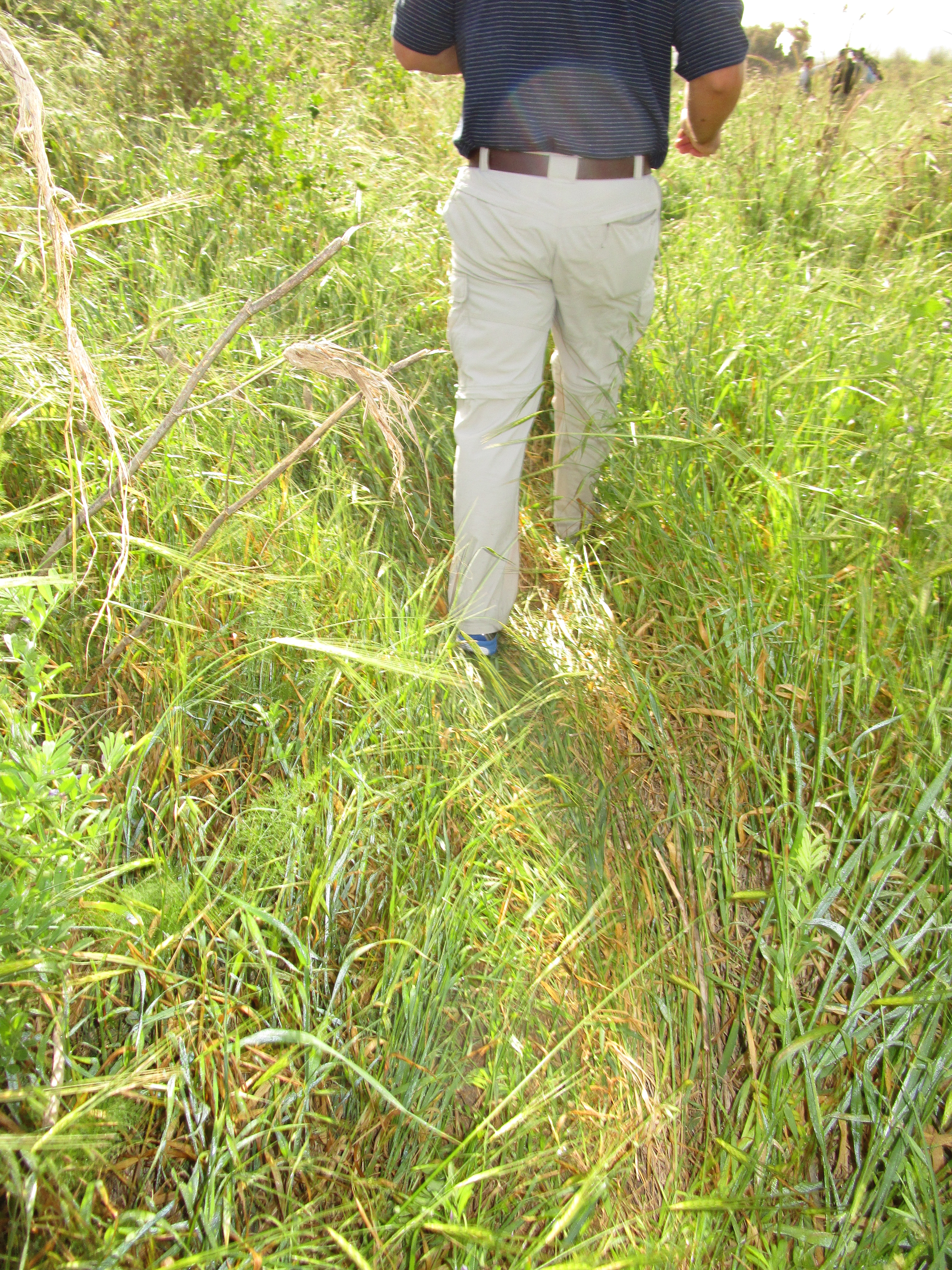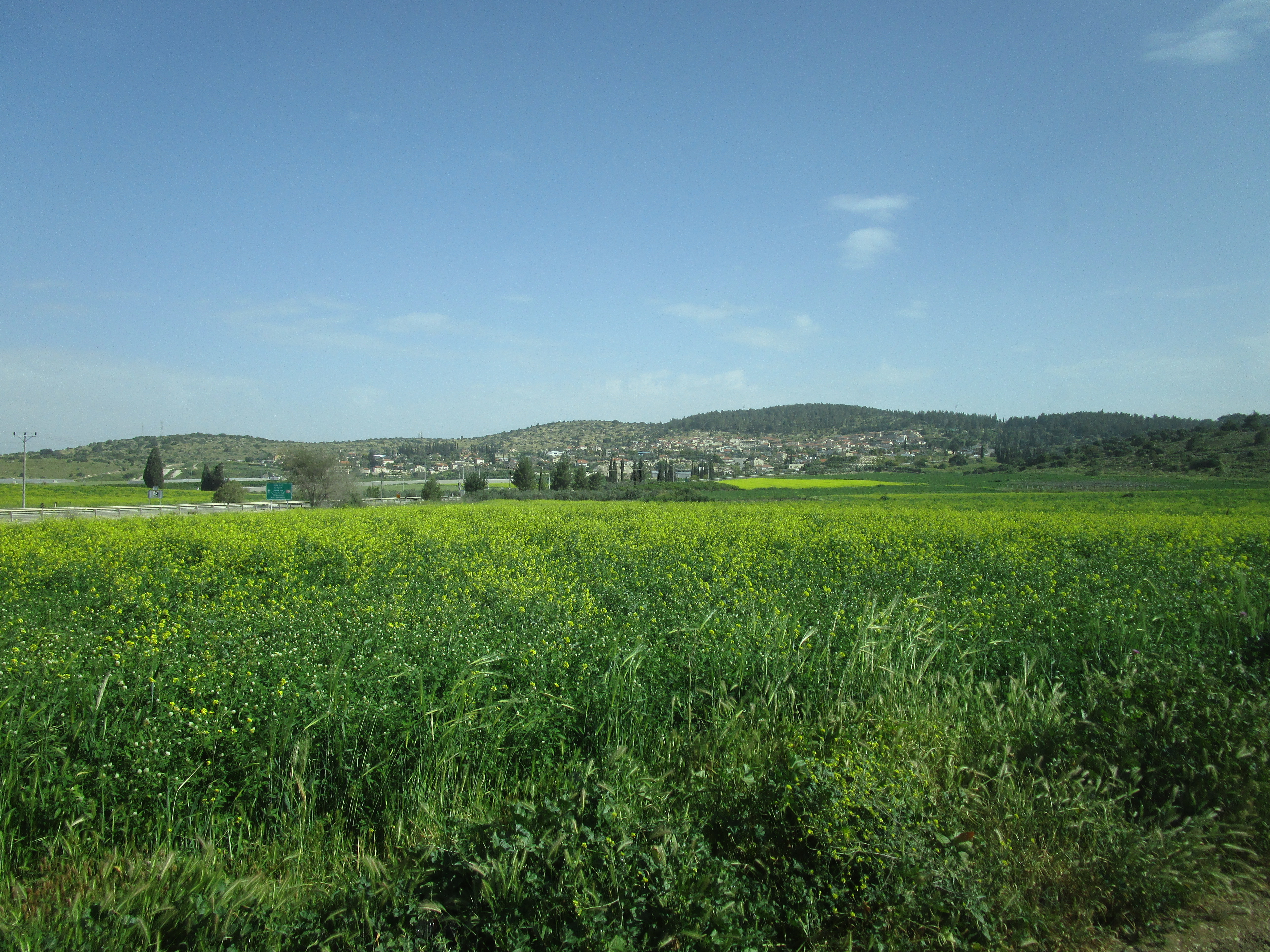 Now, isn’t that one of the most exciting stories in the Bible? Today, we got to see where it happened. The valley of Elah, just ordinary farmland today, stretched in front of us with tall, green weeds, thistles and mustard plants waving in the wind. Rounded mountains sloped to our left and to our right. A shallow brook ran through the field. To get to where John wanted to film, we had to stomp through those tall green weeds. This is NOT my happy place. I’m not a girly-girl, but I’m not completely a country girl, either. I talked to myself (again, that’s happening a lot lately!) and said “Don’t think about the bugs below. There probably are no snakes in Israel. Or alligators.” So eventually we made it to the middle of the field, where Doug and Rick promptly began sneezing their heads off.
