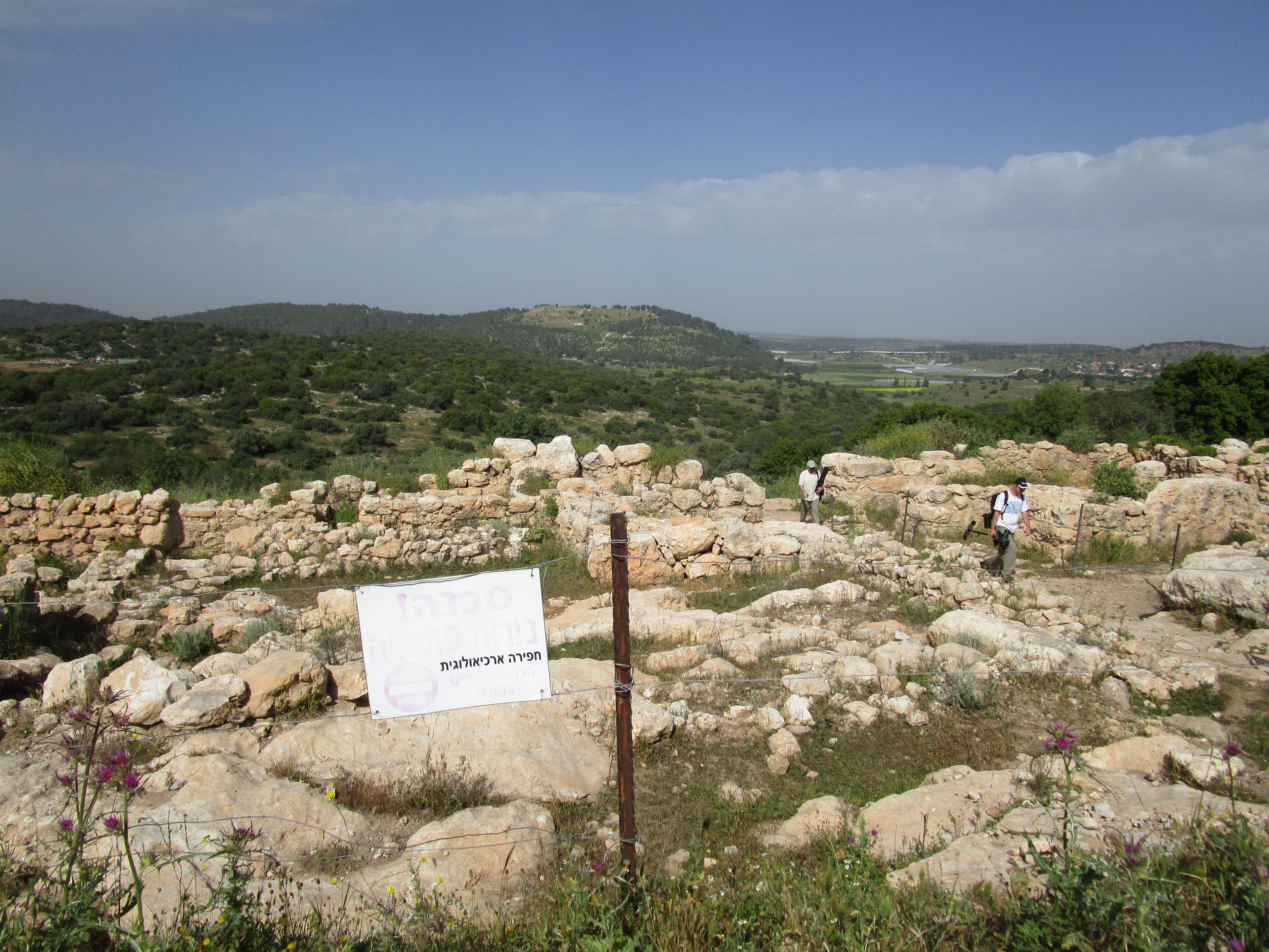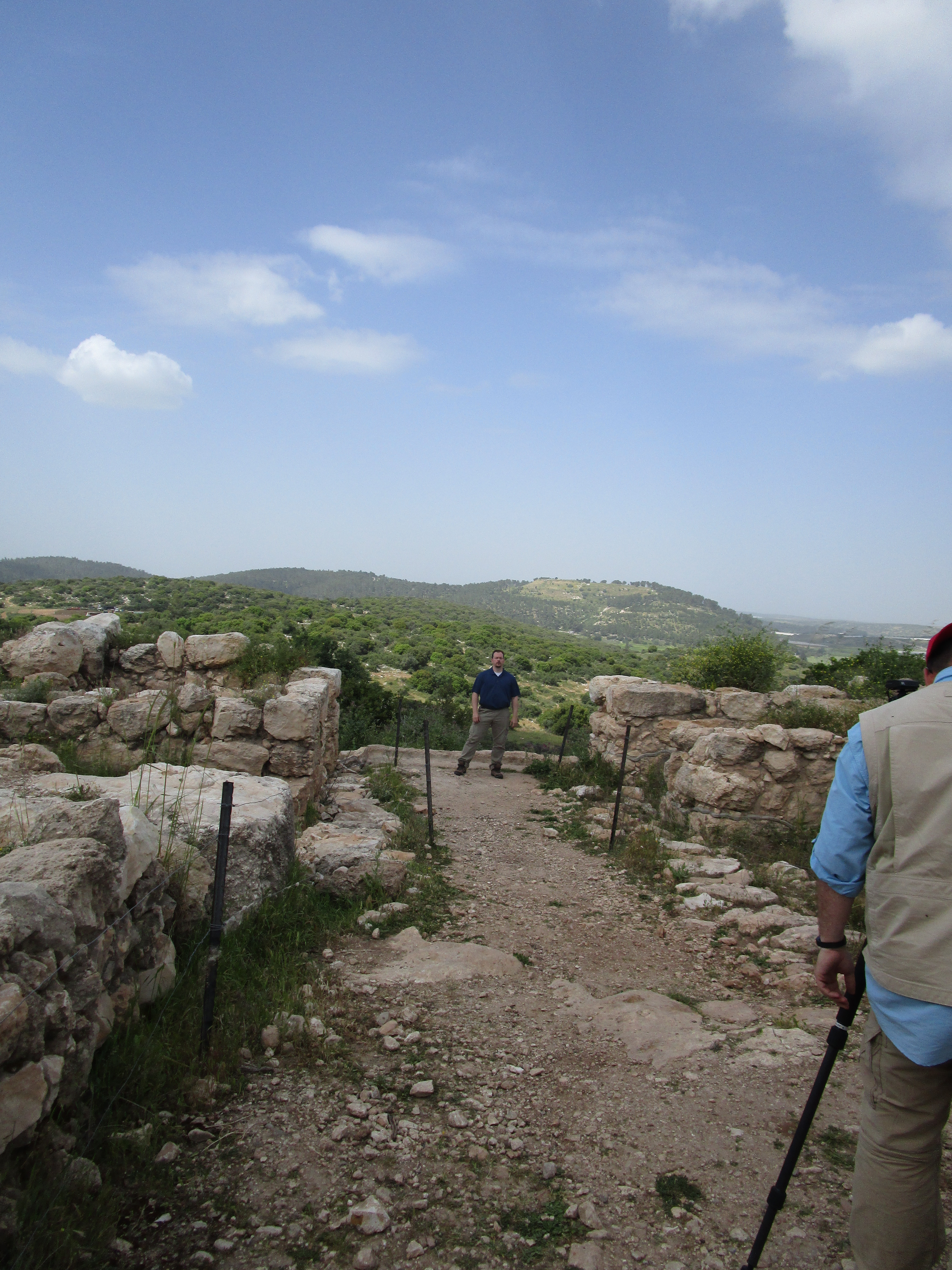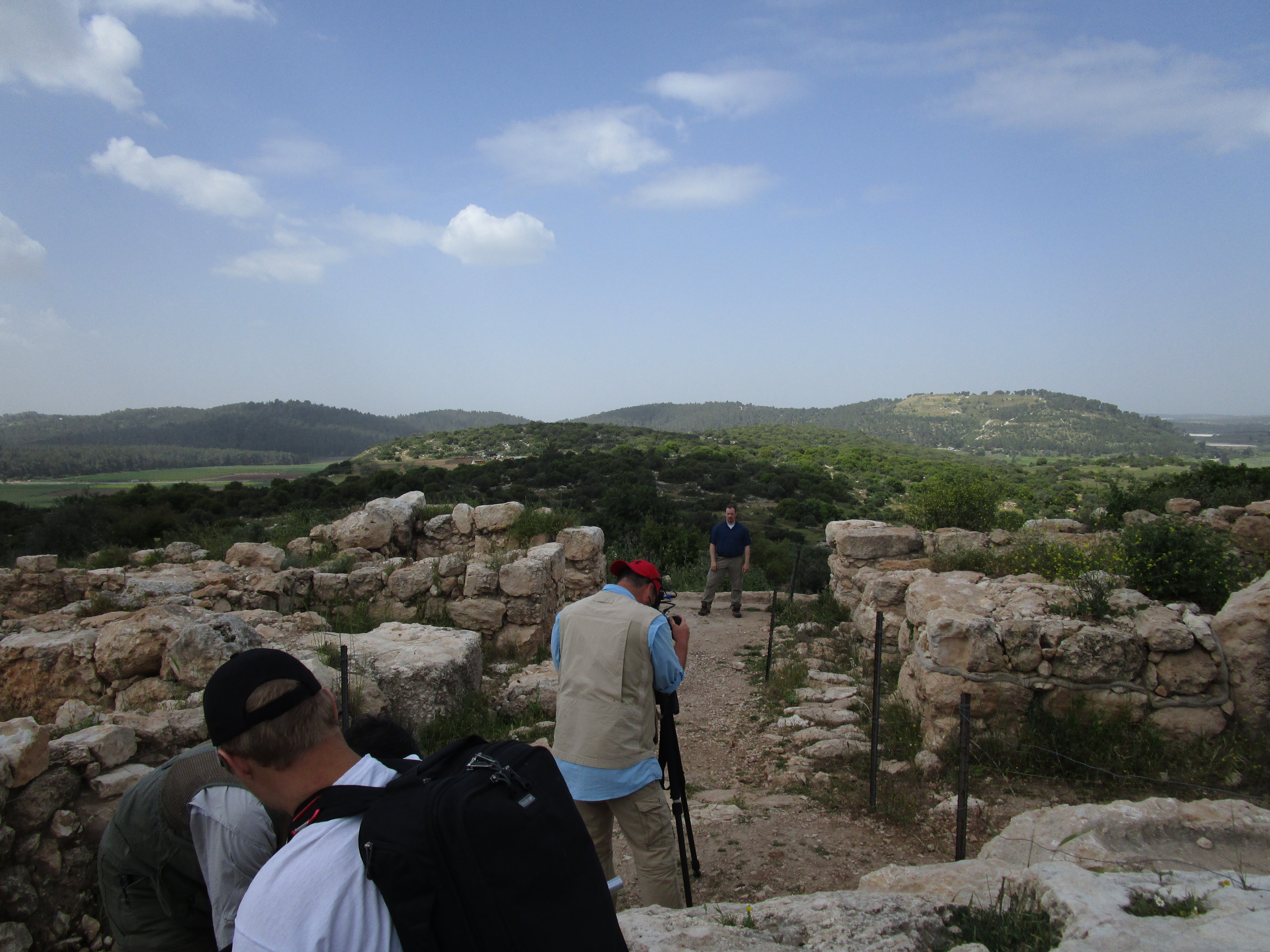 After our stop at the Valley of Elah (already described above,) we drove a few miles further (north, I think) to Khirbet Qeiyafa. It is a recent excavation, beginning only about 10 years ago. Khirbet Qeiyafa overlooks the Elah Valley, where the battle of David and Goliath took place. Dewayne had A-roll to shoot here. It was quite a hike – Yossi got us as close as he could but we had to walk uphill about 20 minutes before we arrived. And as soon as we got to the top of the high hill, Doug said “We’ve been here!” And it did look very similar to several of the other ruins we’ve visited – at least to the untrained eye!