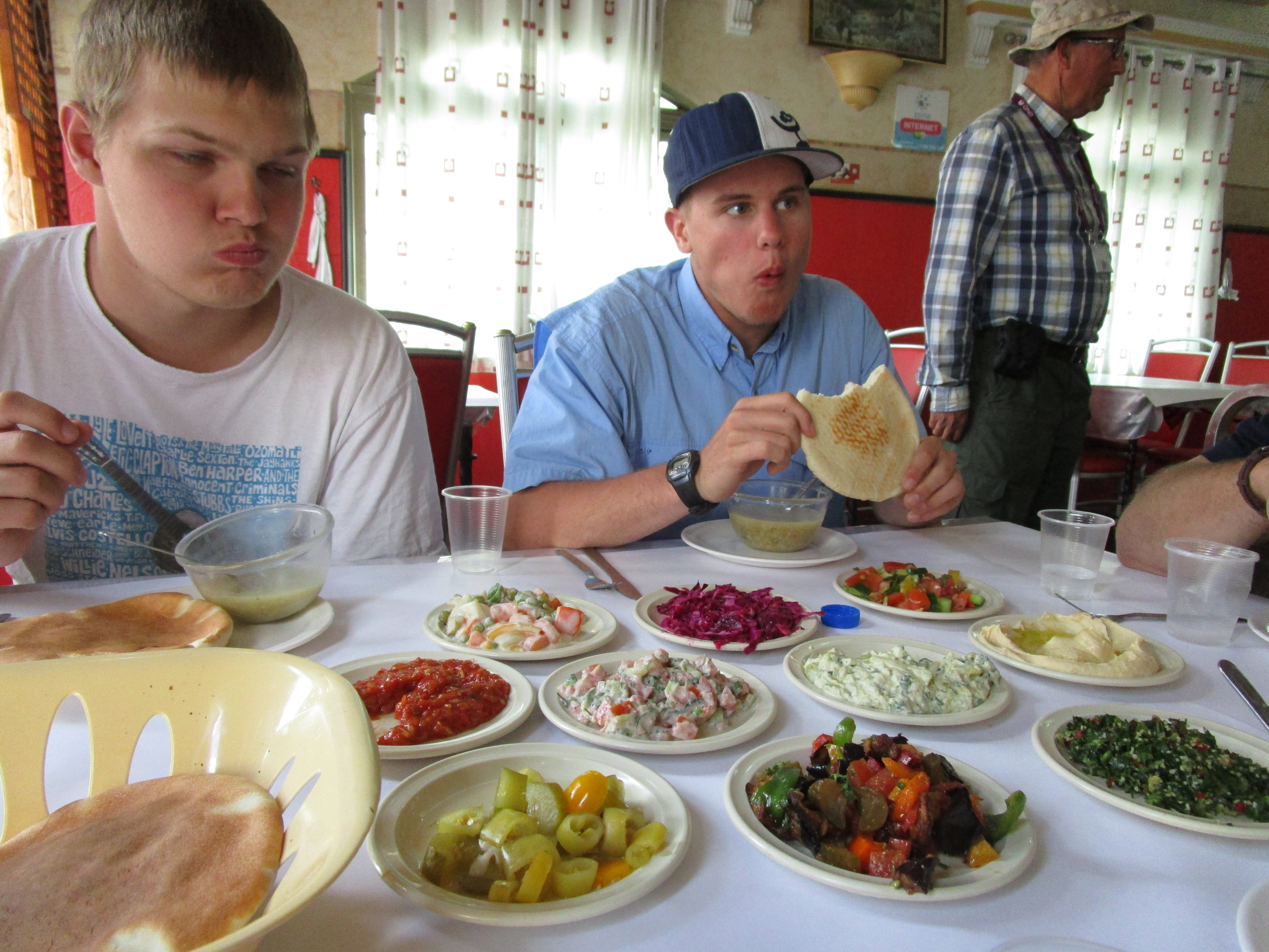 They brought us bottled water and a delicious soup that tasted like chicken noodle, except it was some sort of barley or couscous instead of noodles. Then they brought TWELVE appetizer plates with a basket of pita bread. I’m not sure what all of the plates contained – hummus on one, some type of mint salsa (for lack of a better word), one that tasted like our salsa at home, several different kinds of pickles, Baba Ganoush (I’d heard of it – it is eggplant, onions, tomatoes, etc.) and other things I couldn’t identify. I tried some and not others…sorry Mom. We got to choose either lamb over rice or chicken over rice. My chicken was very good – the rice had a saffron flavor which wasn’t bad, but I didn’t love it.
