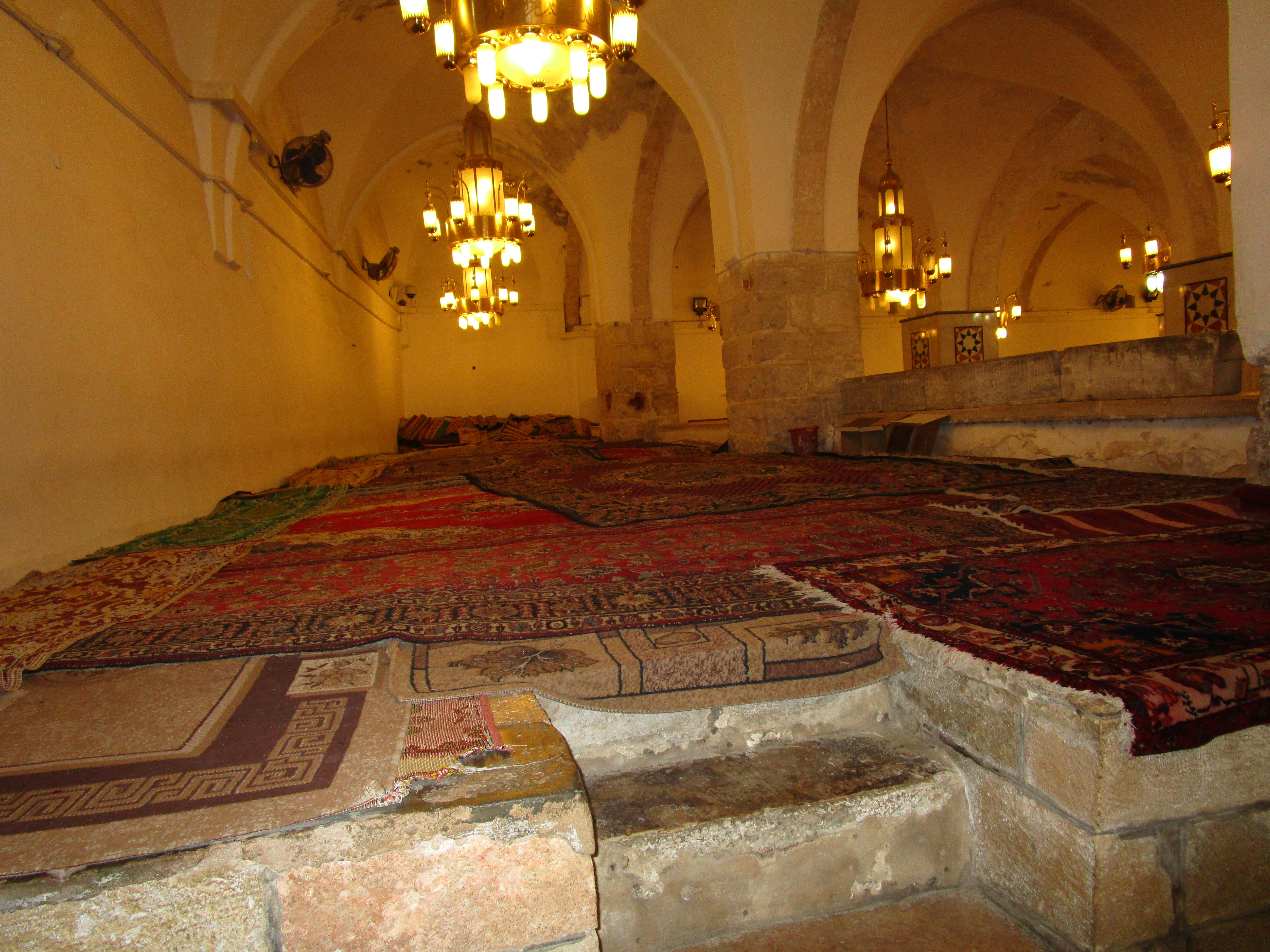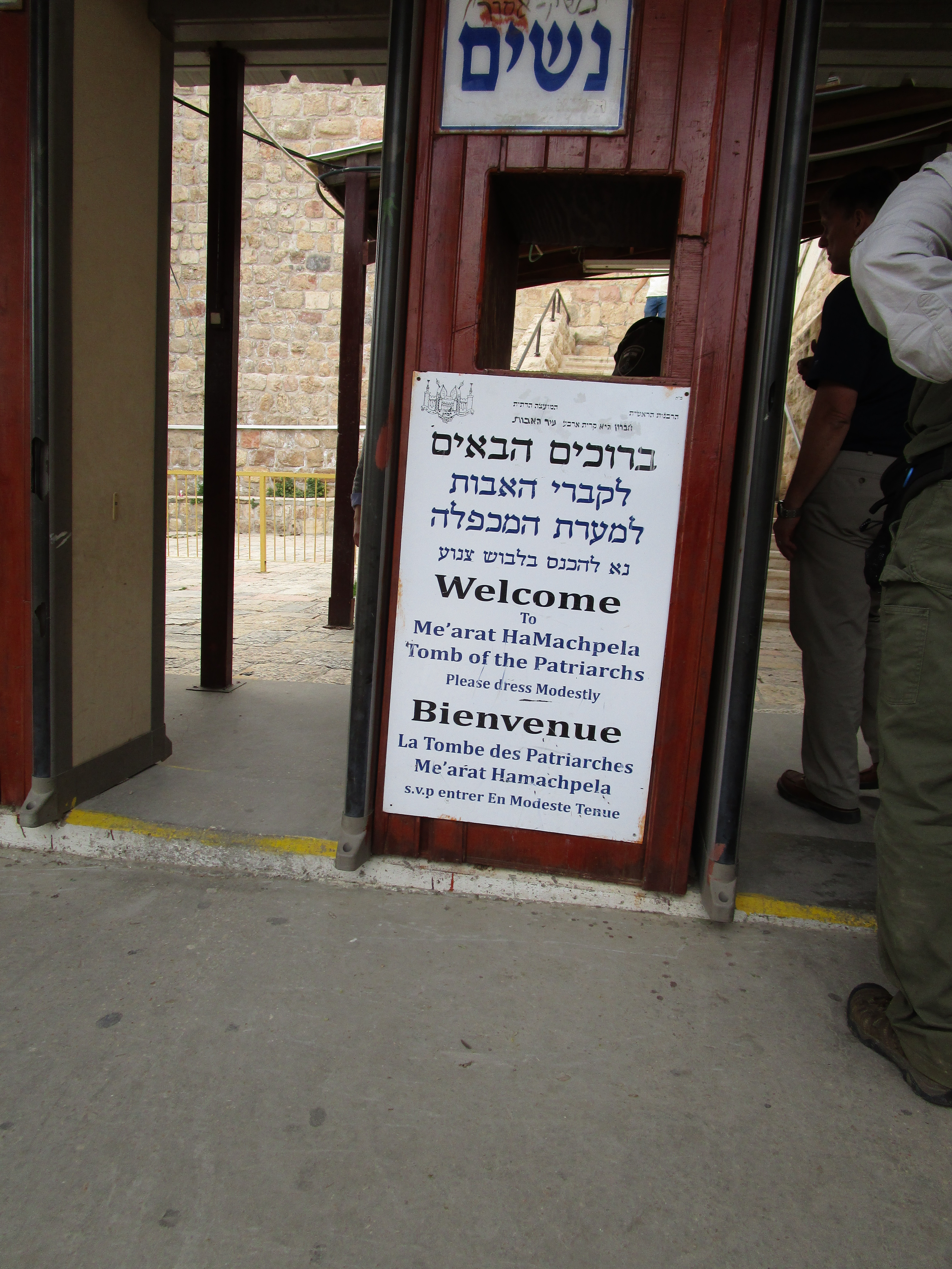 We had to walk uphill (of course) to get to the area we were looking for. Adorable little boys ran up to us with bracelets, wanting money. I had a ten shekel coin in my pocket and gave it to a little boy, maybe unwise, but I couldn’t resist his big brown eyes. Then we had to go through a metal detector and checkpoint before going into the Muslim side of the Cave of Machpelah. Mat had to take the camera off the glidecam and leave it and the tripod behind, I suppose they were viewed as weapons. As we walked up steep steps toward the Mosque, we could see the large Herodian stones. At the door, I was asked to put on a hooded robe. It didn’t have any sleeves. I had to take off my backpack and hold it awkwardly in front of me with my pen and notebook under my arm. Of course the guys gave me a hard time, calling me Frodo, Gandalf, or Little Red Riding Hood, and referencing Assassin’s Creed, but I could tell they felt a little awkward about me having to wear it. I did not like it. I don’t have a problem with submission – it just felt like I didn’t belong or that they wanted to cover me up, even though I was dressed from neck to hands to feet. All of us had to remove our shoes as well. (I was so glad I happened to wear socks today!)