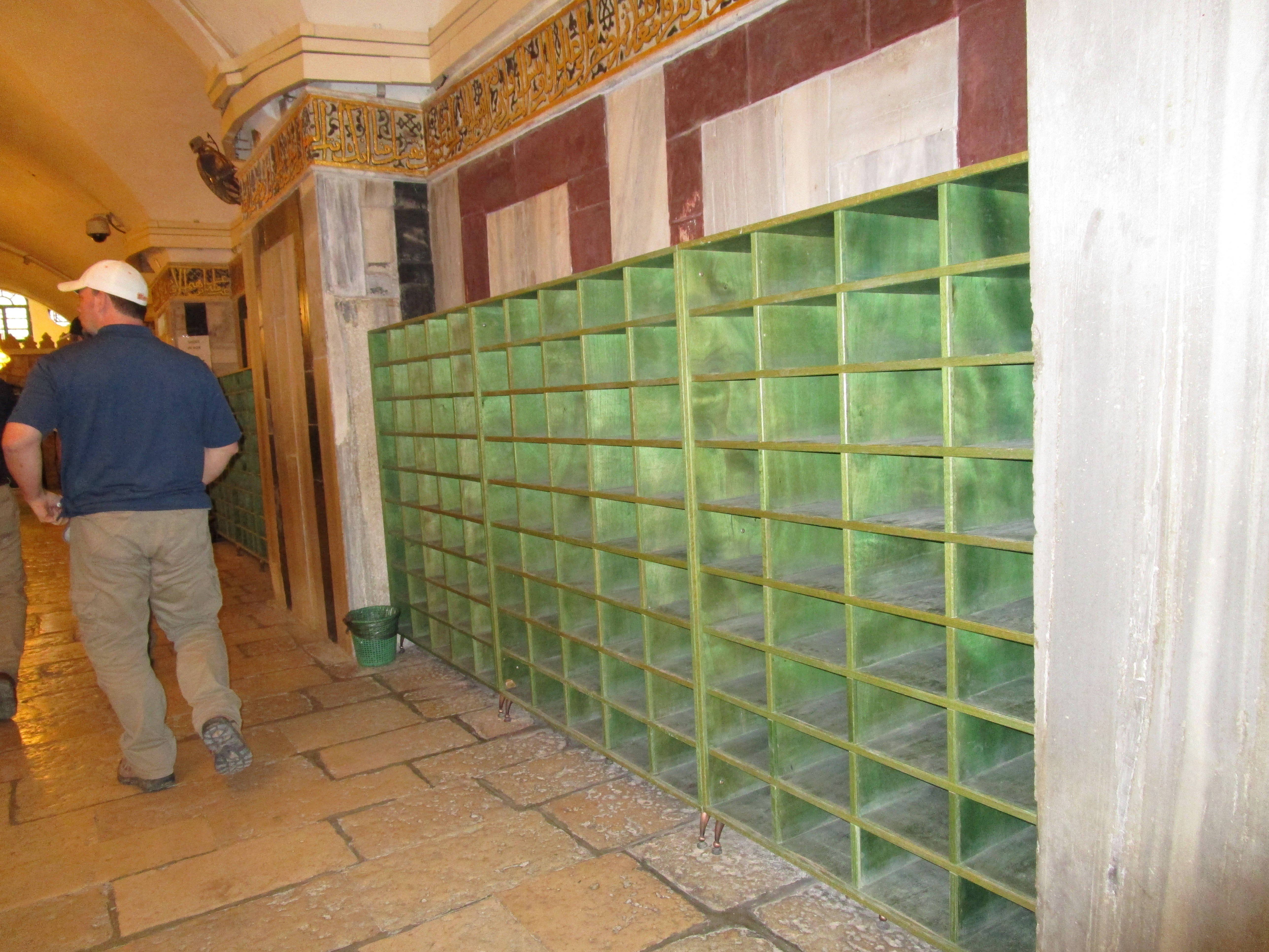 I’ve never been in a mosque before and it was vastly different than a church building. Carpets covered the floor with no benches or seats or pews. This one also had monuments set up to honor the patriarchs. It smelled like stinky feet – sad, but true. Mat passed me one time and whispered for me to pull my hood further over my head, because it had pulled back away from my forehead. Later a door opened and the wind blew it back and John hurried to pull it forward. I knew they just wanted to make sure I wouldn’t be in any trouble; it was just a strange feeling for me. I was glad to get my shoes back on and leave that place.
