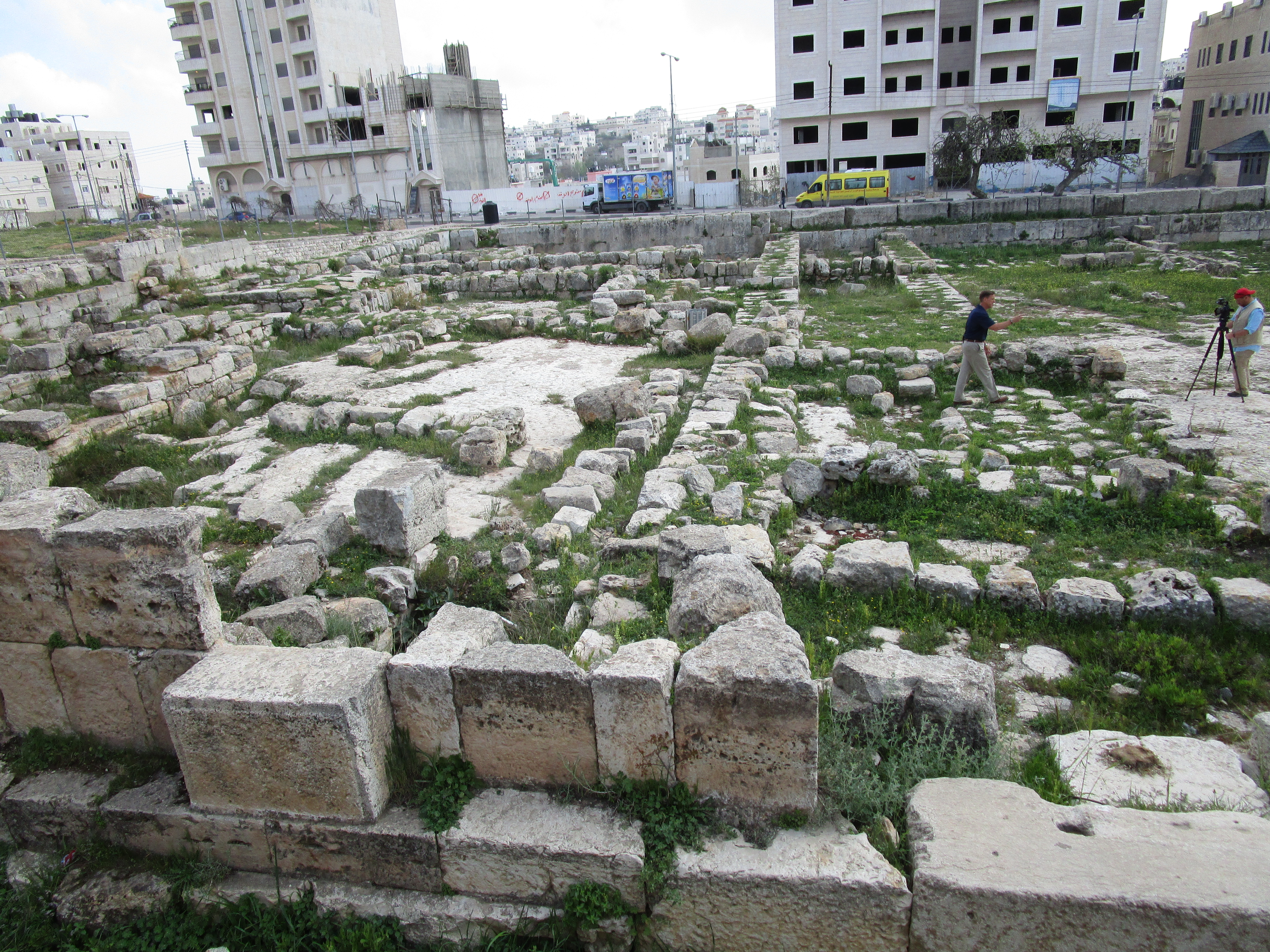 Next we stopped at the “Oaks of Mamre” (Genesis 18) but it was fenced up and closed. It was just a big fenced area in the city of Hebron with Herodian ruins inside. Hisham found an opening in the fence, and in we went. We seemed to attract a crowd of little boys wherever we went, and this was no exception. Four or five of them followed us in, saying “pic-sha!” and wanting us to take their pictures. They were cute, and one of them spoke decent English. They were very interested in being on camera while John was continuing to film, so Hisham had to distract them and keep them busy. I noticed rocks in the hands of a couple of them.