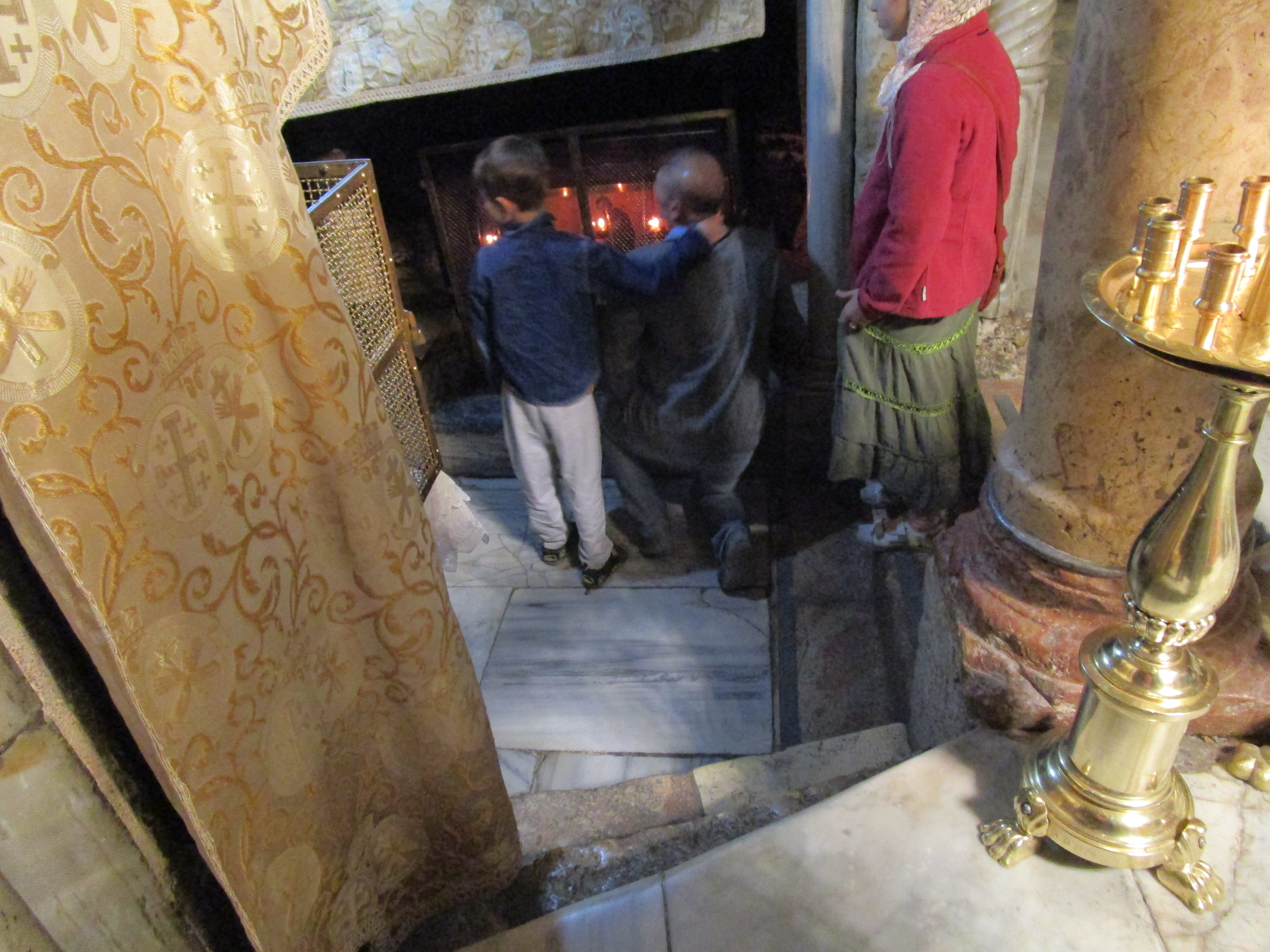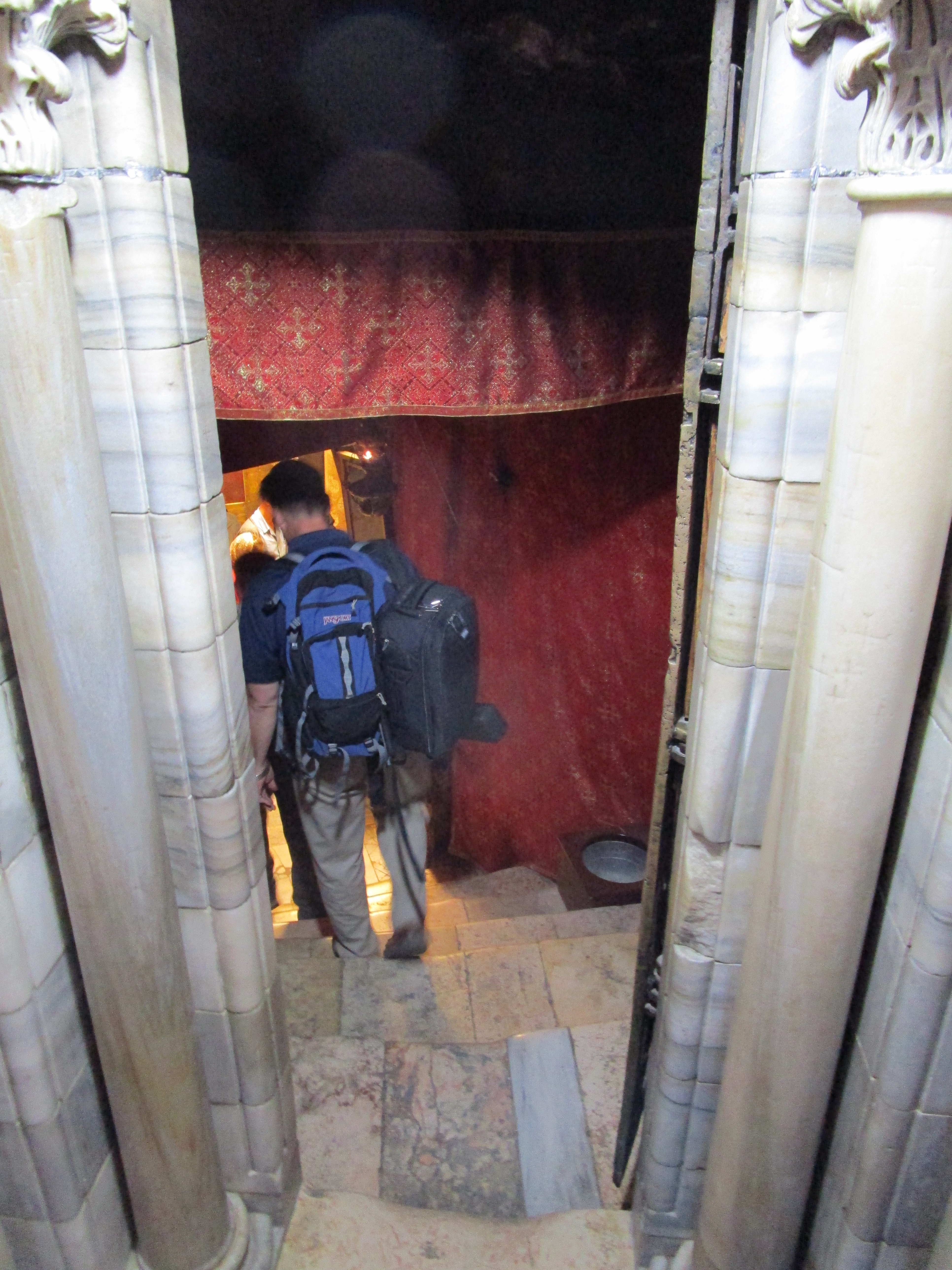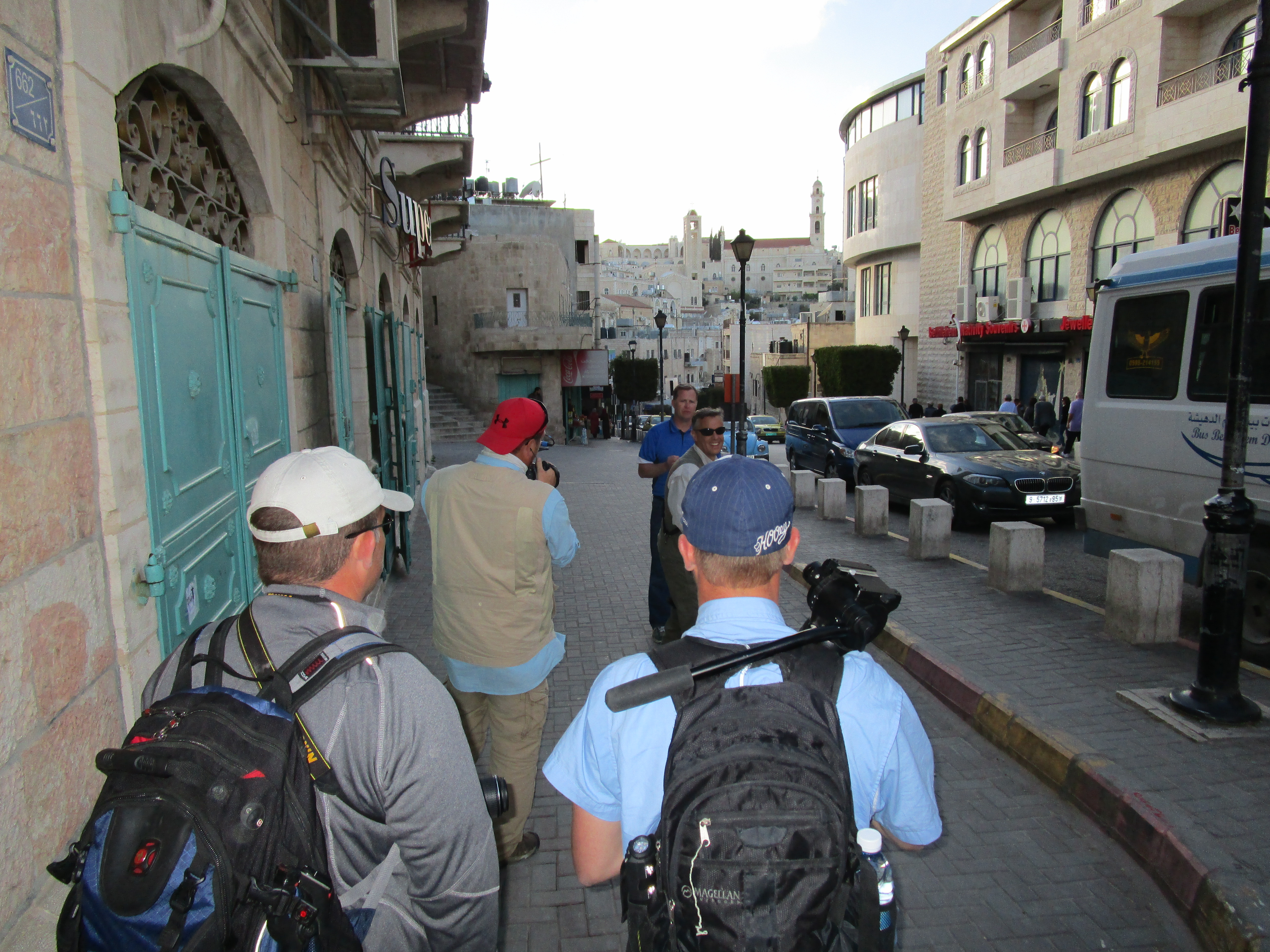We then made the drive to Bethlehem, still in the West Bank area. Jon had some segments to film on the streets here. The sun was going down and it was chilly. We ducked into the Church of the Nativity (literally, you have to bend over in a posture of submission to enter) and found that a funeral was taking place. Hisham, though, took us right past the crowds and down into a little sunken area where supposedly Jesus was born and laid in the manger. We didn’t stay long. The rest of the crew went in as well.
